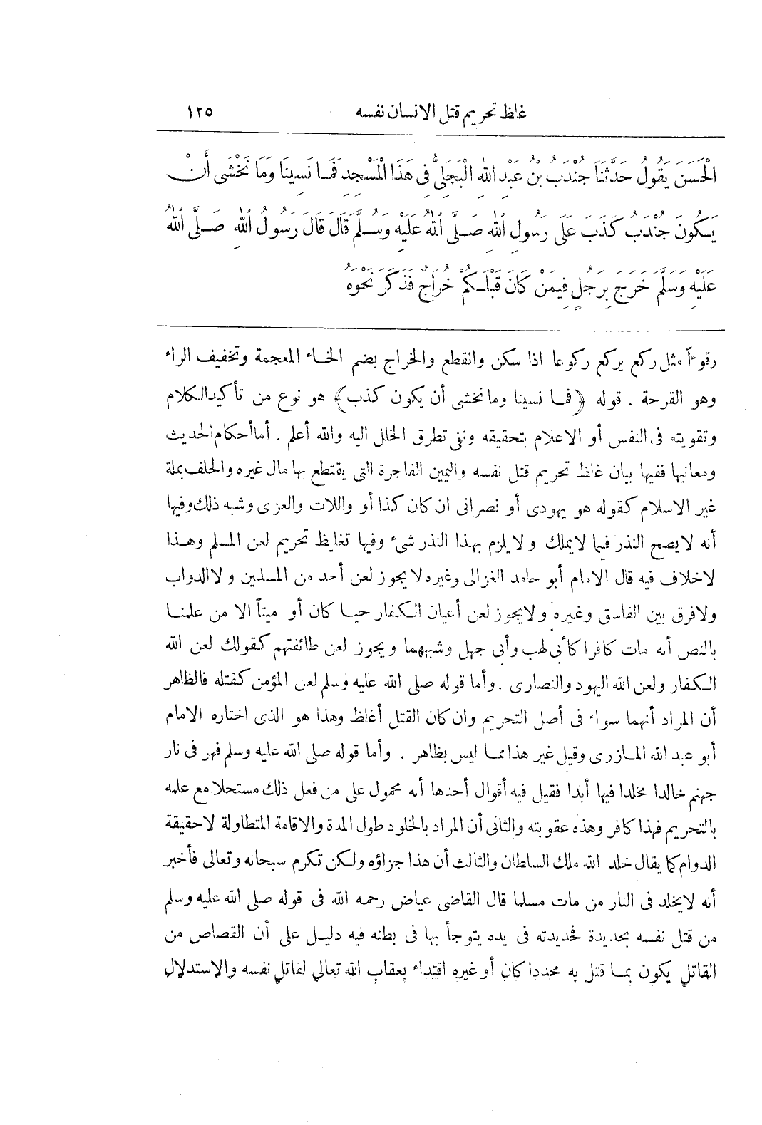 رُقُوءًا مِثْلُ رَكَعَ يَرْكَعُ رُكُوعًا إِذَا سَكَنَ وَانْقَطَعَ وَالْخُرَاجُ بِضَمِّ الْخَاءِ الْمُعْجَمَةِ وَتَخْفِيفِ الرَّاءِ وَهُوَ الْقُرْحَةُ قَوْلُهُ (فَمَا نَسِينَا وَمَا نَخْشَى أَنْ يَكُونَ كَذَبَ) هُوَ نَوْعٌ مِنْ تَأْكِيدِ الْكَلَامِ وَتَقْوِيَتِهِ فِي النَّفْسِ أَوِ الْإِعْلَامِ بِتَحْقِيقِهِ وَنَفْيِ تَطَرُّقِ الْخَلَلِ إِلَيْهِ وَاللَّهُ أَعْلَمُ أَمَّا أَحْكَامُ الْحَدِيثِ وَمَعَانِيهَا فَفِيهَا بَيَانُ غِلَظِ تَحْرِيمِ قتل نفسه وَالْيَمِينِ الْفَاجِرَةِ الَّتِي يَقْتَطِعُ بِهَا مَالَ غَيْرِهِ وَالْحَلِفُ بِمِلَّةٍ غَيْرِ الْإِسْلَامِ كَقَوْلِهِ هُوَ يَهُودِيٌّ أو نصرانى ان كان كذا أو واللات وَالْعُزَّى وَشِبْهُ ذَلِكَ وَفِيهَا أَنَّهُ لَا يَصِحُّ النَّذْرُ فِيمَا لَا يَمْلِكُ وَلَا يَلْزَمُ بِهَذَا النَّذْرِ شَيْءٌ وَفِيهَا تَغْلِيظُ تَحْرِيمِ لَعَنِ الْمُسْلِمِ وَهَذَا لَا خِلَافَ فِيهِ قَالَ الْإِمَامُ أَبُو حَامِدٍ الْغَزَالِيُّ وَغَيْرُهُ لَا يَجُوزُ لَعْنُ أَحَدٍ مِنَ الْمُسْلِمِينَ وَلَا الدَّوَابِّ وَلَا فَرْقَ بَيْنَ الْفَاسِقِ وَغَيْرِهِ وَلَا يَجُوزُ لَعْنُ أَعْيَانِ الْكُفَّارِ حَيًّا كَانَ أَوْ مَيِّتًا إِلَّا مَنْ عَلِمْنَا بِالنَّصِّ أَنَّهُ مَاتَ كَافِرًا كَأَبِي لَهَبٍ وَأَبِي جَهْلٍ وَشِبْهِهِمَا وَيَجُوزُ لَعْنُ طَائِفَتِهِمْ كَقَوْلِكَ لَعَنَ اللَّهُ الْكُفَّارَ وَلَعَنَ اللَّهُ الْيَهُودَ وَالنَّصَارَى وَأَمَّا قَوْلُهُ صَلَّى اللَّهُ عَلَيْهِ وَسَلَّمَ لَعْنُ الْمُؤْمِنِ كَقَتْلِهِ فَالظَّاهِرُ أَنَّ الْمُرَادَ أَنَّهُمَا سَوَاءٌ فِي أَصْلِ التَّحْرِيمِ وَإِنْ كَانَ الْقَتْلُ أَغْلَظَ وَهَذَا هُوَ الَّذِي اخْتَارَهُ الْإِمَامُ أَبُو عَبْدِ اللَّهِ الْمَازِرِيُّ وَقِيلَ غَيْرُ هَذَا مِمَّا لَيْسَ بِظَاهِرٍ وَأَمَّا قَوْلُهُ صَلَّى اللَّهُ عَلَيْهِ وَسَلَّمَ فَهُوَ فِي نَارِ جَهَنَّمَ خَالِدًا مُخَلَّدًا فِيهَا أَبَدًا فَقِيلَ فِيهِ أَقْوَالٌ أَحَدُهَا أَنَّهُ مَحْمُولٌ عَلَى مَنْ فَعَلَ ذَلِكَ مُسْتَحِلًّا مَعَ عِلْمِهِ بِالتَّحْرِيمِ فَهَذَا كَافِرٌ وَهَذِهِ عُقُوبَتُهُ وَالثَّانِي أَنَّ الْمُرَادَ بِالْخُلُودِ طُولُ الْمُدَّةِ وَالْإِقَامَةِ الْمُتَطَاوِلَةِ لَا حَقِيقَةَ الدَّوَامِ كَمَا يُقَالُ خَلَّدَ اللَّهُ مُلْكَ السُّلْطَانِ وَالثَّالِثُ أَنَّ هَذَا جَزَاؤُهُ وَلَكِنْ تَكَرَّمَ سُبْحَانَهُ وَتَعَالَى فَأَخْبَرَ أَنَّهُ لَا يُخَلِّدُ فِي النَّارِ مَنْ مَاتَ مُسْلِمًا قَالَ الْقَاضِي عِيَاضٌ رَحِمَهُ اللَّهُ فِي قَوْلِهِ صَلَّى اللَّهُ عَلَيْهِ وَسَلَّمَ مَنْ قَتَلَ نَفْسَهُ بِحَدِيدَةٍ فَحَدِيدَتُهُ فِي يَدِهِ يَتَوَجَّأُ بِهَا فِي بَطْنِهِ فِيهِ دَلِيلٌ عَلَى أَنَّ الْقِصَاصَ مِنَ الْقَاتِلِ يَكُونُ بِمَا قَتَلَ به محددا كان أو غيره اقتداء لعقاب اللَّهِ تَعَالَى لِقَاتِلِ نَفْسِهِ وَالِاسْتِدْلَالُ