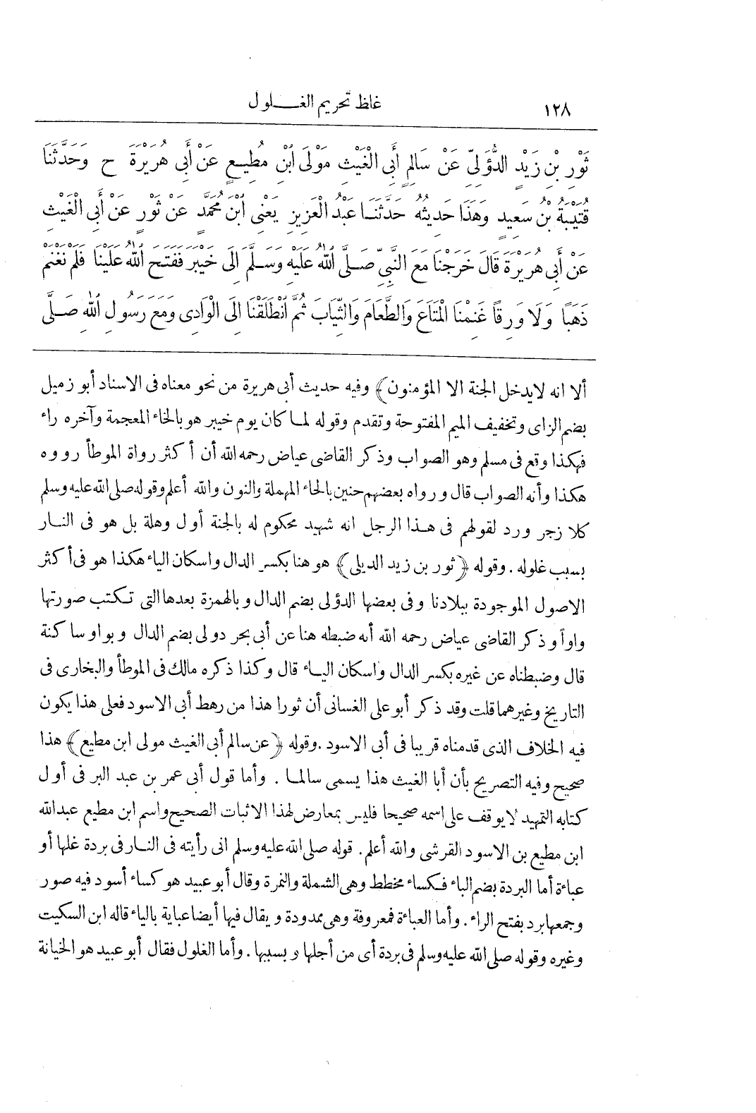 [115] وَقَوْلُهُ (ثَوْرُ بْنُ زَيْدٍ الدِّيلِيُّ) هُوَ هُنَا بِكَسْرِ الدَّالِ وَإِسْكَانِ الْيَاءِ هَكَذَا هُوَ فِي أَكْثَرِ الْأُصُولِ الْمَوْجُودَةِ بِبِلَادِنَا وَفِي بَعْضِهَا الدُّؤَلِيُّ بِضَمِّ الدَّالِ وَبِالْهَمْزَةِ بَعْدَهَا الَّتِي تُكْتَبُ صُورَتُهَا وَاوًا وَذَكَرَ الْقَاضِي عِيَاضٌ رَحِمَهُ اللَّهُ أَنَّهُ ضَبَطَهُ هُنَا عَنْ أَبِي بَحْرٍ دُوَلِيٌّ بِضَمِّ الدَّالِ وَبِوَاوٍ سَاكِنَةٍ قَالَ وَضَبَطْنَاهُ عَنْ غَيْرِهِ بِكَسْرِ الدَّالِ وَإِسْكَانِ الْيَاءِ قَالَ وَكَذَا ذَكَرَهُ مَالِكٌ فِي الْمُوَطَّأِ وَالْبُخَارِيُّ فِي التَّارِيخِ وَغَيْرُهُمَا قُلْتُ وَقَدْ ذَكَرَ أَبُو عَلِيٍّ الْغَسَّانِيُّ أَنَّ ثَوْرًا هَذَا مِنْ رَهْطِ أَبِي الْأَسْوَدِ فَعَلَى هَذَا يَكُونُ فِيهِ الْخِلَافُ الَّذِي قَدَّمْنَاهُ قَرِيبًا فِي أَبِي الْأَسْوَدِ وَقَوْلُهُ (عن سالم أبى الغيث مولى بن مُطِيعٍ) هَذَا صَحِيحٌ وَفِيهِ التَّصْرِيحُ بِأَنَّ أَبَا الْغَيْثِ هَذَا يُسَمَّى سَالِمًا وَأَمَّا قَوْلُ أَبِي عُمَرَ بْنِ عَبْدِ الْبَرِّ فِي أَوَّلِ كِتَابِهِ التَّمْهِيدُ لَا يُوقَفُ عَلَى اسْمِهِ صَحِيحًا فَلَيْسَ بمعارض لهذا الاثبات الصحيح واسم بن مُطِيعٍ عَبْدُ اللَّهِ بْنُ مُطِيعِ بْنِ الْأَسْوَدِ الْقُرَشِيِّ وَاللَّهُ أَعْلَمُ قَوْلُهُ صَلَّى اللَّهُ عَلَيْهِ وَسَلَّمَ إِنِّي رَأَيْتُهُ فِي النَّارِ فِي بُرْدَةٍ غَلَّهَا أَوْ عَبَاءَةٍ أَمَّا الْبُرْدَةُ بِضَمِّ الْبَاءِ فَكِسَاءٌ مُخَطَّطٌ وَهِيَ الشَّمْلَةُ وَالنَّمِرَةُ وَقَالَ أَبُو عُبَيْدٍ هُوَ كِسَاءٌ أَسْوَدُ فِيهِ صُوَرٌ وَجَمْعُهَا بُرَدٌ بِفَتْحِ الرَّاءِ وَأَمَّا الْعَبَاءَةُ فَمَعْرُوفَةٌ وَهِيَ مَمْدُودَةٌ وَيُقَالُ فِيهَا أَيْضًا عَبَايَةٌ بِالْيَاءِ قَالَهُ بن السِّكِّيتِ وَغَيْرُهُ وَقَوْلُهُ صَلَّى اللَّهُ عَلَيْهِ وَسَلَّمَ فِي بُرْدَةٍ أَيْ مِنْ أَجْلِهَا وَبِسَبَبِهَا وَأَمَّا الْغُلُولُ فَقَالَ أَبُو عُبَيْدٍ هُوَ الْخِيَانَةُ