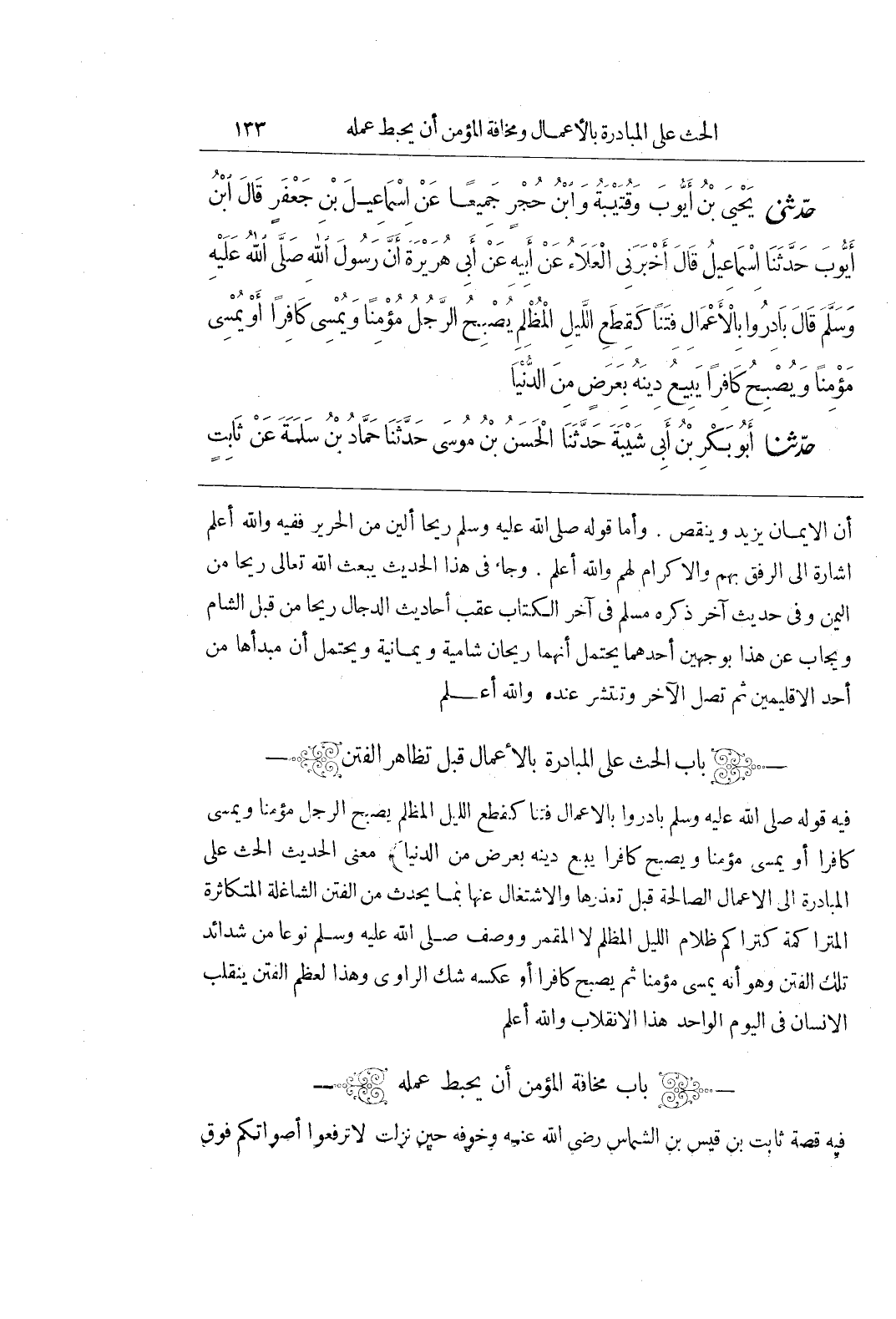 [118] فِيهِ قَوْلُهُ صَلَّى اللَّهُ عَلَيْهِ وَسَلَّمَ بَادِرُوا بِالْأَعْمَالِ فِتَنًا كَقِطَعِ اللَّيْلِ الْمُظْلِمِ يُصْبِحُ الرَّجُلُ مُؤْمِنًا وَيُمْسِي كَافِرًا أَوْ يُمْسِي مُؤْمِنًا وَيُصْبِحُ كَافِرًا يَبِيعُ دِينَهُ بِعَرَضٍ مِنَ الدُّنْيَا) مَعْنَى الْحَدِيثِ الْحَثُّ عَلَى الْمُبَادَرَةِ إِلَى الْأَعْمَالِ الصَّالِحَةِ قَبْلَ تَعَذُّرِهَا وَالِاشْتِغَالِ عَنْهَا بِمَا يَحْدُثُ مِنَ الْفِتَنِ الشَّاغِلَةِ الْمُتَكَاثِرَةِ الْمُتَرَاكِمَةِ كَتَرَاكُمِ ظَلَامِ اللَّيْلِ الْمُظْلِمِ لَا الْمُقْمِرِ وَوَصَفَ صَلَّى اللَّهُ عَلَيْهِ وَسَلَّمَ نَوْعًا مِنْ شَدَائِدِ تِلْكَ الْفِتَنِ وَهُوَ أَنَّهُ يُمْسِي مُؤْمِنًا ثُمَّ يُصْبِحُ كَافِرًا أَوْ عَكْسُهُ شَكَّ الرَّاوِي وَهَذَا لِعِظَمِ الْفِتَنِ يَنْقَلِبُ الْإِنْسَانُ فِي الْيَوْمِ الْوَاحِدِ هَذَا الِانْقِلَابَ وَاللَّهُ أَعْلَمُ)