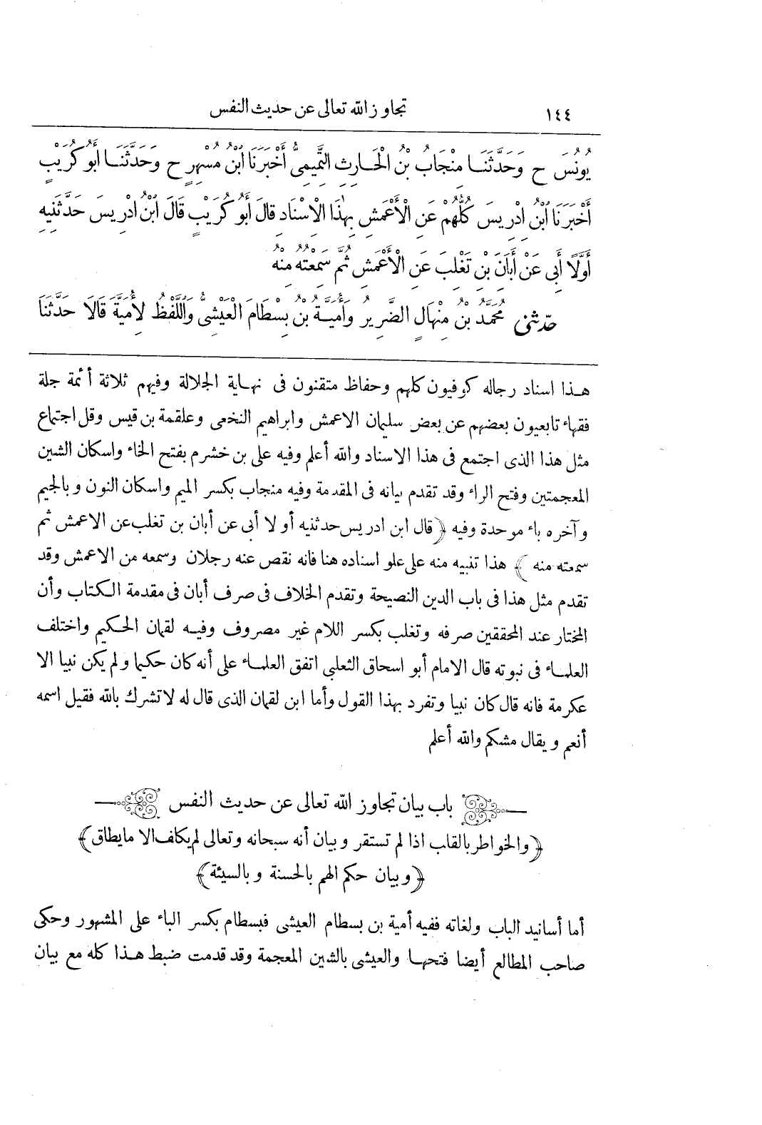 [127] أَمَّا أَسَانِيدُ الْبَابِ وَلُغَاتُهُ فَفِيهِ أُمَيَّةُ بْنُ بِسْطَامَ الْعَيْشِيُّ فَبِسْطَامُ بِكَسْرِ الْبَاءِ عَلَى الْمَشْهُورِ وَحَكَى صَاحِبُ الْمَطَالِعِ أَيْضًا فَتْحَهَا وَالْعَيْشِيُّ بِالشِّينِ الْمُعْجَمَةِ وَقَدْ قَدَّمْتُ ضَبْطَ هَذَا كُلِّهُ مَعَ بَيَانِ)