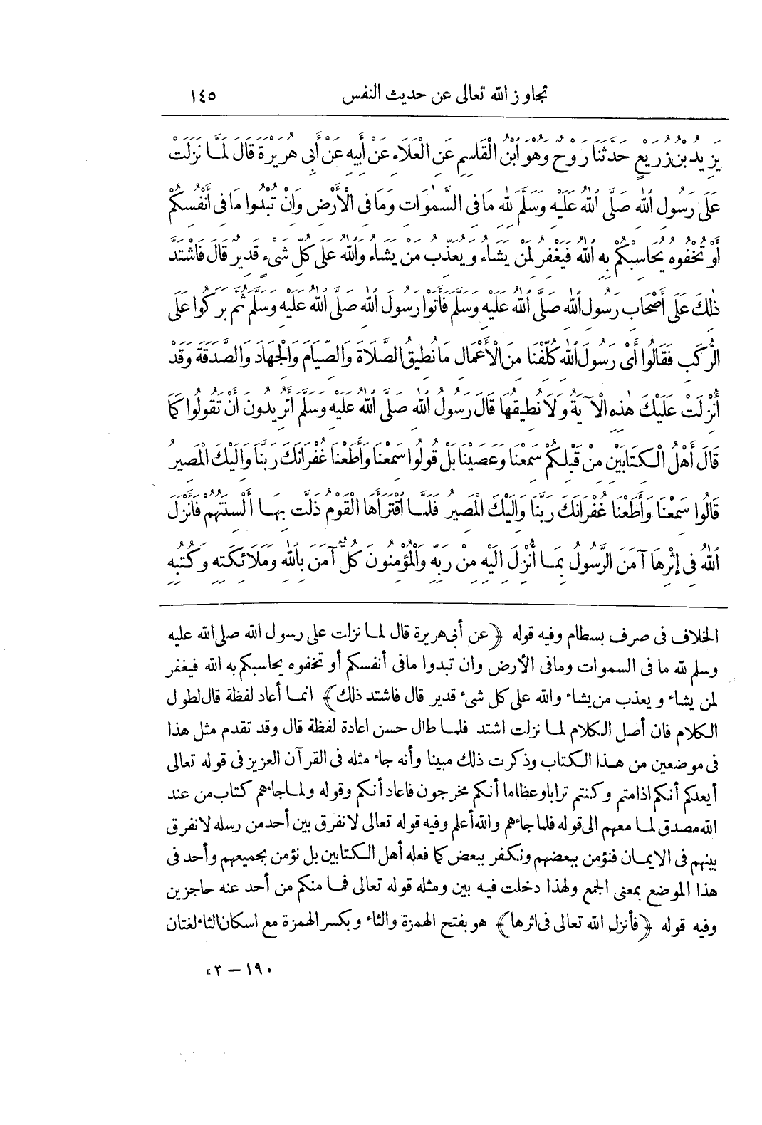 الْخِلَافِ فِي صَرْفِ بِسْطَامَ وَفِيهِ قَوْلُهُ (عَنْ أَبِي هُرَيْرَةَ قَالَ لَمَّا نَزَلَتْ عَلَى رَسُولِ اللَّهِ صَلَّى اللَّهُ عَلَيْهِ وَسَلَّمَ لِلَّهِ مَا فِي السَّمَاوَاتِ وَمَا فِي الْأَرْضِ وَإِنْ تُبْدُوا مَا فِي أَنْفُسِكُمْ أَوْ تُخْفُوهُ يُحَاسِبْكُمْ بِهِ اللَّهُ فَيَغْفِرُ لِمَنْ يَشَاءُ وَيُعَذِّبُ مَنْ يَشَاءُ والله على كل شيء قدير قَالَ فَاشْتَدَّ ذَلِكَ) إِنَّمَا أَعَادَ لَفْظَةَ قَالَ لِطُولِ الْكَلَامِ فَإِنَّ أَصْلَ الْكَلَامِ لَمَّا نَزَلَتِ اشْتَدَّ فَلَمَّا طَالَ حَسُنَ إِعَادَةُ لَفْظَةِ قَالَ وَقَدْ تَقَدَّمَ مِثْلُ هَذَا فِي مَوْضِعَيْنِ مِنْ هَذَا الْكِتَابِ وَذَكَرْتُ ذَلِكَ مُبَيَّنًا وَأَنَّهُ جَاءَ مِثْلُهُ فِي الْقُرْآنِ الْعَزِيزِ فِي قَوْلِهِ تَعَالَى أَيَعِدُكُمْ أَنَّكُمْ إِذَا مِتُّمْ وَكُنْتُمْ تُرَابًا وَعِظَامًا أنكم مخرجون فَأَعَادَ أَنَّكُمْ وَقَوْلِهِ وَلَمَّا جَاءَهُمْ كِتَابٌ مِنْ عند الله مصدق لما معهم إِلَى قَوْلِهِ فَلَمَّا جَاءَهُمْ وَاللَّهُ أَعْلَمُ وَفِيهِ قَوْلُهُ تَعَالَى لَا نُفَرِّقُ بَيْنَ أَحَدٍ مِنْ رسله لَا نُفَرِّقُ بَيْنَهُمْ فِي الْإِيمَانِ فَنُؤْمِنُ بِبَعْضِهِمْ وَنَكْفُرُ بِبَعْضٍ كَمَا فَعَلَهُ أَهْلُ الْكِتَابَيْنِ بَلْ نُؤْمِنُ بِجَمِيعِهِمْ وَأَحَدٍ فِي هَذَا الْمَوْضِعِ بِمَعْنَى الْجَمْعِ وَلِهَذَا دَخَلَتْ فِيهِ بَيْنَ وَمِثْلُهُ قَوْلُهُ تَعَالَى فَمَا مِنْكُمْ مِنْ أَحَدٍ عَنْهُ حَاجِزِينَ وَفِيهِ قَوْلُهُ (فَأَنْزَلَ اللَّهُ تَعَالَى فِي إِثْرِهَا) هُوَ بِفَتْحِ الْهَمْزَةِ وَالثَّاءِ وَبِكَسْرِ الْهَمْزَةِ مَعَ إِسْكَانِ الثَّاءِ لُغَتَانِ