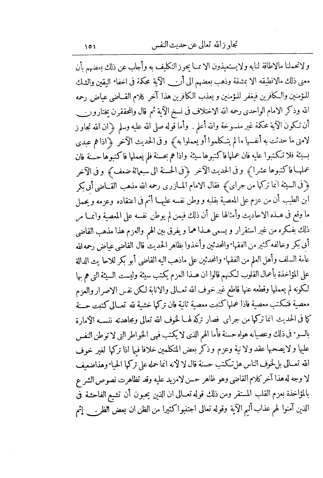 ولا تحملنا مالا طاقة لنا به وَلَا يَسْتَعِيذُونَ إِلَّا مِمَّا يَجُوزُ التَّكْلِيفُ بِهِ وَأَجَابَ عَنْ ذَلِكَ بَعْضُهُمْ بِأَنَّ مَعْنَى ذَلِكَ مالا نُطِيقُهُ إِلَّا بِمَشَقَّةٍ وَذَهَبَ بَعْضُهُمْ إِلَى أَنَّ الْآيَةَ مُحْكَمَةٌ فِي إِخْفَاءِ الْيَقِينِ وَالشَّكِّ لِلْمُؤْمِنِينَ وَالْكَافِرِينَ فَيَغْفِرُ لِلْمُؤْمِنَيْنِ وَيُعَذِّبُ الْكَافِرِينَ هَذَا آخِرُ كَلَامِ الْقَاضِي عِيَاضٍ رَحِمَهُ اللَّهُ وَذَكَرَ الْإِمَامُ الْوَاحِدِيُّ رَحِمَهُ اللَّهُ الِاخْتِلَافَ فِي نَسْخِ الْآيَةِ ثُمَّ قَالَ وَالْمُحَقِّقُونَ يَخْتَارُونَ أَنْ تَكُونَ الْآيَةُ مُحْكَمَةً غَيْرَ مَنْسُوخَةٍ وَاللَّهُ أَعْلَمُ وَأَمَّا قَوْلُهُ صَلَّى اللَّهُ عَلَيْهِ وَسَلَّمَ (إِنَّ اللَّهَ تَجَاوَزَ لِأُمَّتِي مَا حَدَّثَتْ بِهِ أَنْفُسَهَا مَا لَمْ يَتَكَلَّمُوا أَوْ يَعْمَلُوا بِهِ)