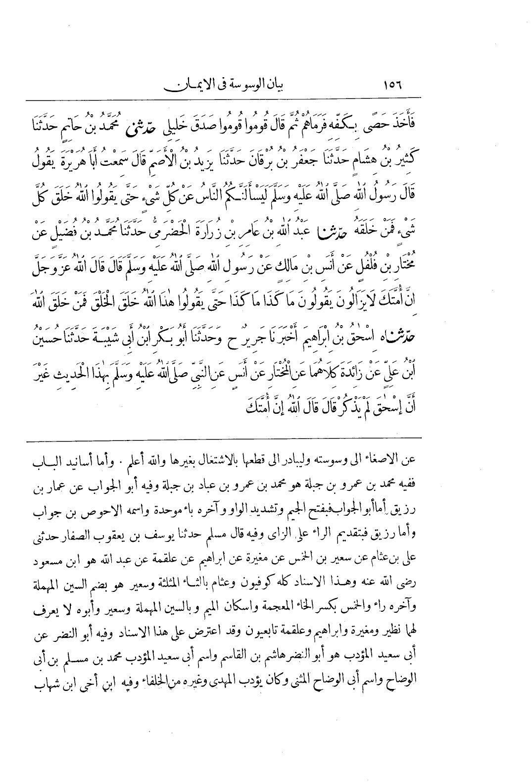 عَنِ الْإِصْغَاءِ إِلَى وَسْوَسَتِهِ وَلْيُبَادِرْ إِلَى قَطْعِهَا بِالِاشْتِغَالِ بِغَيْرِهَا وَاللَّهُ أَعْلَمُ وَأَمَّا أَسَانِيدُ الْبَابِ ففيه محمد بن عمرو بن جبلة هو محمد بن عمرو بن عباد بْنِ جَبَلَةَ وَفِيهِ أَبُو الْجَوَّابِ عَنْ عَمَّارِ بْنِ رُزَيْقٍ أَمَّا أَبُو الْجَوَّابِ فَبِفَتْحِ الْجِيمِ وَتَشْدِيدِ الْوَاوِ وَآخِرُهُ بَاءٌ مُوَحَّدَةٌ وَاسْمُهُ الْأَحْوَصُ بن جواب وأما رزيق فبتقدم الراء على الزاى وَفِيهِ قَالَ مُسْلِمٌ حَدَّثَنَا يُوسُفُ بْنُ يَعْقُوبَ الصَّفَّارُ حَدَّثَنِي عَلِيُّ بْنُ عَثَّامٍ عَنْ سُعَيْرِ بْنِ الْخِمْسِ عَنْ مُغِيرَةَ عَنْ إِبْرَاهِيمَ عَنْ عَلْقَمَةَ عَنْ عَبْدِ اللَّهِ هو بن مَسْعُودٍ رَضِيَ اللَّهُ عَنْهُ وَهَذَا الْإِسْنَادُ كُلُّهُ كوفيون وعثام بالثاء المثلثة وسعير هو بضم السين المهملة وآخره راء والخمس بِكَسْرِ الْخَاءِ الْمُعْجَمَةِ وَإِسْكَانِ الْمِيمِ وَبِالسِّينِ الْمُهْمَلَةِ وَسُعَيْرٌ وَأَبُوهُ لَا يُعْرَفُ لَهُمَا نَظِيرٌ وَمُغِيرَةُ وَإِبْرَاهِيمُ وَعَلْقَمَةُ تَابِعِيُّونَ وَقَدِ اعْتُرِضَ عَلَى هَذَا الْإِسْنَادِ وَفِيهِ أَبُو النَّضْرِ عَنْ أَبِي سَعِيدٍ الْمُؤَدِّبِ هُوَ أَبُو النَّضْرِ هَاشِمُ بْنُ الْقَاسِمِ وَاسْمُ أَبِي سَعِيدٍ الْمُؤَدِّبِ مُحَمَّدُ بْنُ مُسْلِمِ بْنِ أَبِي الْوَضَّاحِ وَاسْمُ أَبِي الْوَضَّاحِ الْمُثَنَّى وَكَانَ يُؤَدِّبُ الْمَهْدِيَّ وَغَيْرَهُ مِنَ الْخُلَفَاءِ وَفِيهِ بن أخى بن شهاب
