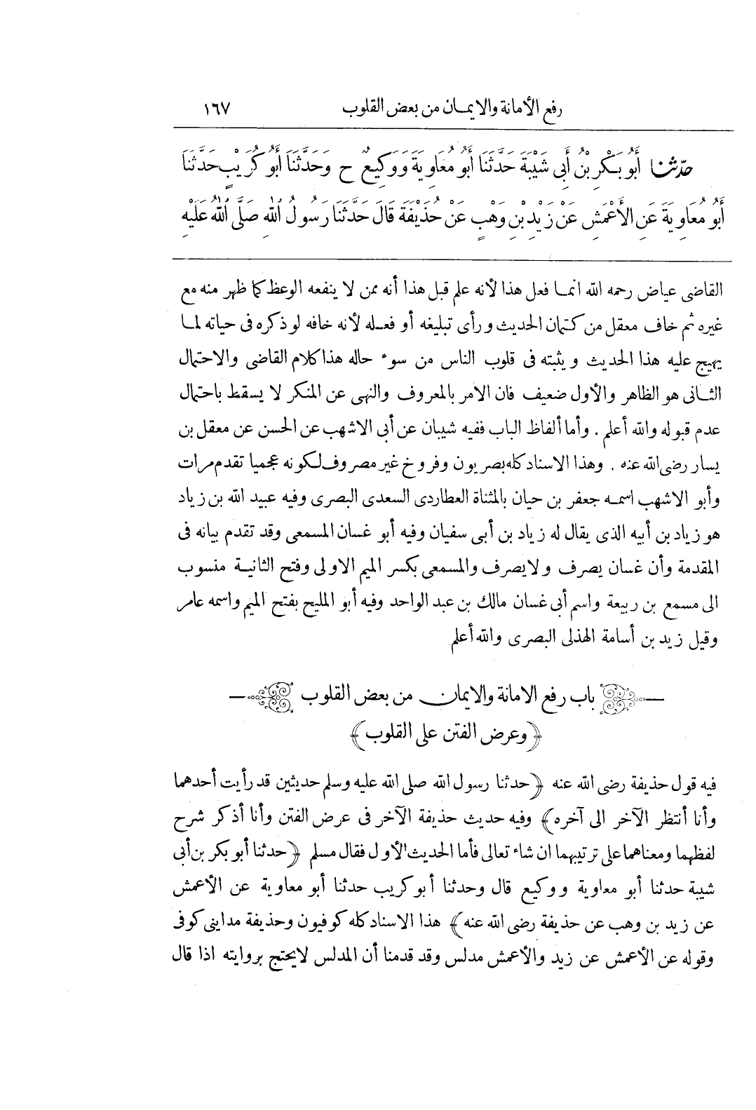 [143] فِيهِ قَوْلُ حُذَيْفَةَ رَضِيَ اللَّهُ عَنْهُ (حَدَّثَنَا رَسُولُ اللَّهِ صَلَّى اللَّهُ عَلَيْهِ وَسَلَّمَ حَدِيثَيْنِ قَدْ رَأَيْتُ أَحَدُهُمَا وَأَنَا أَنْتَظِرُ الْآخَرَ إِلَى آخِرِهِ) وَفِيهِ حَدِيثُ حُذَيْفَةَ الْآخَرُ فِي عَرْضِ الْفِتَنِ وَأَنَا أَذْكُرُ شَرْحَ لَفْظِهِمَا وَمَعْنَاهُمَا على ترتيبهما ان شاء تَعَالَى فَأَمَّا الْحَدِيثُ الْأَوَّلُ فَقَالَ مُسْلِمٌ (حَدَّثَنَا أَبُو بَكْرِ بْنُ أَبِي شَيْبَةَ حَدَّثَنَا أبو مُعَاوِيَةَ وَوَكِيعٌ قَالَ وَحَدَّثَنَا أَبُو كُرَيْبٍ حَدَّثَنَا أَبُو مُعَاوِيَةَ عَنِ الْأَعْمَشِ عَنْ زَيْدِ بْنِ وَهْبٍ عَنْ حُذَيْفَةَ رَضِيَ اللَّهُ عَنْهُ) هَذَا الاسناد كله كوفيون وحذيفة مداينى كُوفِيٌّ وَقَوْلُهُ عَنِ الْأَعْمَشِ عَنْ زَيْدٍ وَالْأَعْمَشُ مُدَلِّسٌ وَقَدْ قَدَّمْنَا أَنَّ الْمُدَلِّسَ لَا يُحْتَجُّ بِرِوَايَتِهِ إِذَا قَالَ)