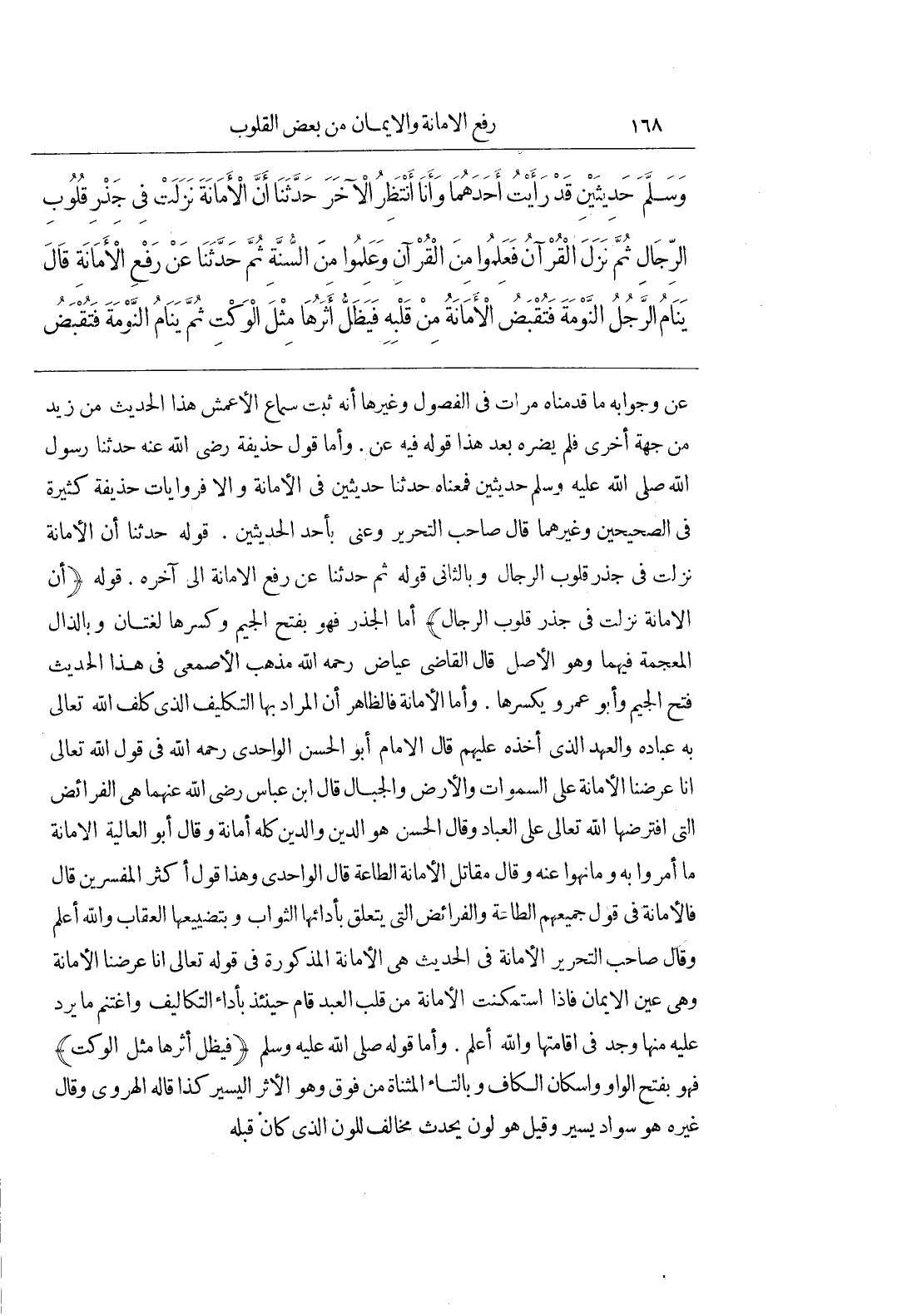 عَنْ وَجَوَابُهُ مَا قَدَّمْنَاهُ مَرَّاتٍ فِي الْفُصُولِ وَغَيْرِهَا أَنَّهُ ثَبَتَ سَمَاعُ الْأَعْمَشِ هَذَا الْحَدِيثَ مِنْ زَيْدٍ مِنْ جِهَةٍ أُخْرَى فَلَمْ يَضُرَّهُ بَعْدَ هَذَا قَوْلُهُ فِيهِ عَنْ وَأَمَّا قَوْلُ حُذَيْفَةَ رَضِيَ اللَّهُ عَنْهُ حَدَّثَنَا رَسُولُ اللَّهِ صَلَّى اللَّهُ عَلَيْهِ وَسَلَّمَ حَدِيثَيْنِ فَمَعْنَاهُ حَدَّثَنَا حَدِيثَيْنِ فِي الْأَمَانَةِ وَإِلَّا فَرِوَايَاتُ حُذَيْفَةَ كَثِيرَةٌ فِي الصَّحِيحَيْنِ وَغَيْرِهِمَا قَالَ صَاحِبُ التَّحْرِيرِ وَعَنَى بِأَحَدِ الْحَدِيثَيْنِ قَوْلَهُ حَدَّثَنَا أَنَّ الْأَمَانَةَ نَزَلَتْ فِي جَذْرِ قُلُوبِ الرِّجَالِ وَبِالثَّانِي قَوْلَهُ ثُمَّ حَدَّثَنَا عَنْ رَفْعِ الْأَمَانَةِ إِلَى آخِرِهِ قَوْلُهُ (أَنَّ الْأَمَانَةَ نَزَلَتْ فِي جَذْرِ قُلُوبِ الرِّجَالِ) أَمَّا الْجَذْرُ فَهُوَ بِفَتْحِ الْجِيمِ وَكَسْرِهَا لُغَتَانِ وَبِالذَّالِ الْمُعْجَمَةِ فِيهِمَا وَهُوَ الْأَصْلُ قَالَ الْقَاضِي عِيَاضٌ رَحِمَهُ اللَّهُ مَذْهَبُ الْأَصْمَعِيِّ فِي هَذَا الْحَدِيثِ فَتْحُ الْجِيمِ وَأَبُو عَمْرٍو يَكْسِرُهَا وَأَمَّا الْأَمَانَةُ فَالظَّاهِرُ أَنَّ الْمُرَادَ بِهَا التَّكْلِيفُ الَّذِي كَلَّفَ اللَّهُ تَعَالَى بِهِ عِبَادَهُ وَالْعَهْدُ الَّذِي أَخَذَهُ عَلَيْهِمْ قَالَ الْإِمَامُ أَبُو الْحَسَنِ الْوَاحِدِيُّ رَحِمَهُ اللَّهُ فِي قَوْلِ اللَّهِ تَعَالَى إِنَّا عرضنا الأمانة على السماوات والأرض والجبال قال بن عَبَّاسٍ رَضِيَ اللَّهُ عَنْهُمَا هِيَ الْفَرَائِضُ الَّتِي افْتَرَضَهَا اللَّهُ تَعَالَى عَلَى الْعِبَادِ وَقَالَ الْحَسَنُ هُوَ الدِّينُ وَالدِّينُ كُلُّهُ أَمَانَةٌ وَقَالَ أَبُو الْعَالِيَةِ الْأَمَانَةُ مَا أُمِرُوا بِهِ وَمَا نُهُوا عَنْهُ وَقَالَ مُقَاتِلٌ الْأَمَانَةُ الطَّاعَةُ قَالَ الْوَاحِدِيُّ وَهَذَا قَوْلُ أَكْثَرِ الْمُفَسِّرِينَ قَالَ فَالْأَمَانَةُ فِي قَوْلِ جَمِيعِهِمُ الطَّاعَةُ وَالْفَرَائِضُ الَّتِي يَتَعَلَّقُ بِأَدَائِهَا الثَّوَابُ وَبِتَضْيِيعِهَا الْعِقَابُ وَاللَّهُ أَعْلَمُ وَقَالَ صَاحِبُ التَّحْرِيرِ الْأَمَانَةُ فِي الْحَدِيثِ هِيَ الْأَمَانَةُ الْمَذْكُورَةُ فى قوله تعالى إنا عرضنا الأمانة وَهِيَ عَيْنُ الْإِيمَانِ فَإِذَا اسْتَمْكَنَتِ الْأَمَانَةُ مِنْ قَلْبِ الْعَبْدِ قَامَ حِينَئِذٍ بِأَدَاءِ التَّكَالِيفِ وَاغْتَنَمَ مَا يَرِدُ عَلَيْهِ مِنْهَا وَجَدَّ فِي إِقَامَتِهَا وَاللَّهُ أَعْلَمُ وَأَمَّا قَوْلُهُ صَلَّى اللَّهُ عَلَيْهِ وَسَلَّمَ فَيَظَلُّ أَثَرُهَا مِثْلَ الْوَكْتِ فَهُوَ بِفَتْحِ الْوَاوِ وَإِسْكَانِ الْكَافِ وَبِالتَّاءِ الْمُثَنَّاةِ مِنْ فَوْقُ وَهُوَ الْأَثَرُ الْيَسِيرُ كَذَا قَالَهُ الْهَرَوِيُّ وَقَالَ غَيْرُهُ هُوَ سَوَادٌ يَسِيرٌ وَقِيلَ هُوَ لَوْنٌ يَحْدُثُ مُخَالِفٌ لِلَّوْنِ الَّذِي كَانَ قَبْلَهُ