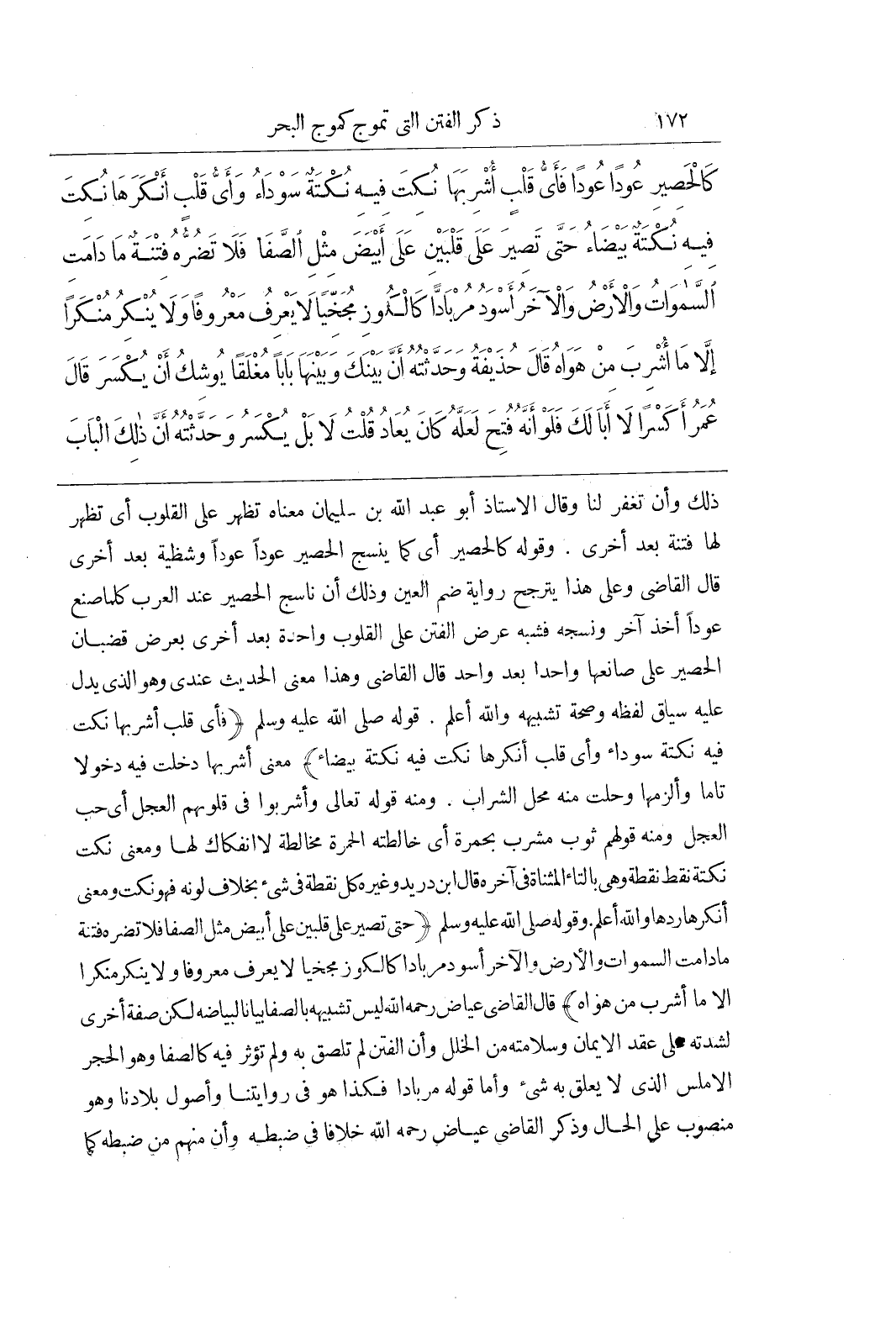 ذَلِكَ وَأَنْ تَغْفِرَ لَنَا وَقَالَ الْأُسْتَاذُ أَبُو عَبْدِ اللَّهِ بْنُ سُلَيْمَانَ مَعْنَاهُ تَظْهَرُ عَلَى الْقُلُوبِ أَيْ تَظْهَرُ لَهَا فِتْنَةٌ بَعْدَ أُخْرَى وَقَوْلُهُ كَالْحَصِيرِ أَيْ كَمَا يُنْسَجُ الْحَصِيرُ عُودًا عُودًا وَشَظِيَّةً بَعْدَ أُخْرَى قَالَ الْقَاضِي وَعَلَى هَذَا يَتَرَجَّحُ رِوَايَةُ ضَمِّ الْعَيْنِ وَذَلِكَ أَنَّ نَاسِجَ الْحَصِيرِ عِنْدَ الْعَرَبِ كُلَّمَا صَنَعَ عُودًا أَخَذَ آخَرَ وَنَسَجَهُ فَشَبَّهَ عَرْضَ الْفِتَنِ عَلَى الْقُلُوبِ وَاحِدَةً بَعْدَ أُخْرَى بِعَرْضِ قُضْبَانِ الْحَصِيرِ عَلَى صَانِعِهَا وَاحِدًا بَعْدَ وَاحِدٍ قَالَ الْقَاضِي وَهَذَا مَعْنَى الْحَدِيثِ عِنْدِي وَهُوَ الَّذِي يَدُلُّ عَلَيْهِ سِيَاقُ لَفْظِهِ وَصِحَّةُ تَشْبِيهِهِ وَاللَّهُ أَعْلَمُ قَوْلُهُ صَلَّى اللَّهُ عَلَيْهِ وَسَلَّمَ (فَأَيُّ قَلْبٍ أُشْرِبَهَا نُكِتَ فِيهِ نُكْتَةٌ سَوْدَاءُ وَأَيُّ قَلْبٍ أَنْكَرَهَا نُكِتَ فِيهِ نُكْتَةٌ بَيْضَاءُ) مَعْنَى أُشْرِبَهَا دَخَلَتْ فِيهِ دُخُولًا تَامًّا وَأُلْزِمَهَا وَحَلَّتْ مِنْهُ مَحَلَّ الشَّرَابِ وَمِنْهُ قَوْلُهُ تَعَالَى وَأُشْرِبُوا فِي قلوبهم العجل أَيْ حُبَّ الْعِجْلِ وَمِنْهُ قَوْلُهُمْ ثَوْبٌ مُشْرَبٌ بِحُمْرَةٍ أَيْ خَالَطَتْهُ الْحُمْرَةُ مُخَالَطَةً لَا انْفِكَاكَ لَهَا وَمَعْنَى نُكِتَ نُكْتَةً نُقِطَ نُقْطَةً وَهِيَ بالتاء المثناة فى آخره قال بن دُرَيْدٍ وَغَيْرُهُ كُلُّ نُقْطَةٍ فِي شَيْءٍ بِخِلَافِ لَوْنِهِ فَهُوَ نَكْتٌ وَمَعْنَى أَنْكَرَهَا رَدَّهَا وَاللَّهُ أَعْلَمُ وَقَوْلُهُ صَلَّى اللَّهُ عَلَيْهِ وَسَلَّمَ (حَتَّى تَصِيرَ عَلَى قَلْبَيْنِ عَلَى أَبْيَضَ مِثْلِ الصَّفَا فَلَا تَضُرُّهُ فِتْنَةٌ مَا دَامَتِ السَّمَاوَاتُ وَالْأَرْضُ وَالْآخَرُ أَسْوَدُ مُرْبَادًّا كَالْكُوزِ مُجَخِّيًا لَا يَعْرِفُ مَعْرُوفًا وَلَا يُنْكِرُ مُنْكَرًا إِلَّا مَا أُشْرِبَ مِنْ هَوَاهُ) قَالَ الْقَاضِي عِيَاضٌ رَحِمَهُ اللَّهُ لَيْسَ تَشْبِيهُهُ بِالصَّفَا بَيَانًا لِبَيَاضِهِ لَكِنْ صِفَةً أُخْرَى لِشِدَّتِهِ عَلَى عَقْدِ الْإِيمَانِ وَسَلَامَتِهِ مِنَ الْخَلَلِ وَأَنَّ الْفِتَنَ لَمْ تَلْصَقْ بِهِ وَلَمْ تُؤَثِّرْ فِيهِ كَالصَّفَا وَهُوَ الْحَجَرُ الْأَمْلَسُ الَّذِي لَا يَعْلَقُ بِهِ شَيْءٌ وَأَمَّا قَوْلُهُ مُرْبَادًّا فَكَذَا هُوَ فِي رِوَايَتِنَا وَأُصُولِ بِلَادِنَا وَهُوَ مَنْصُوبٌ عَلَى الْحَالِ وَذَكَرَ الْقَاضِي عِيَاضٌ رَحِمَهُ اللَّهُ خِلَافًا فِي ضَبْطِهِ وَأَنَّ مِنْهُمْ مَنْ ضبطه كما