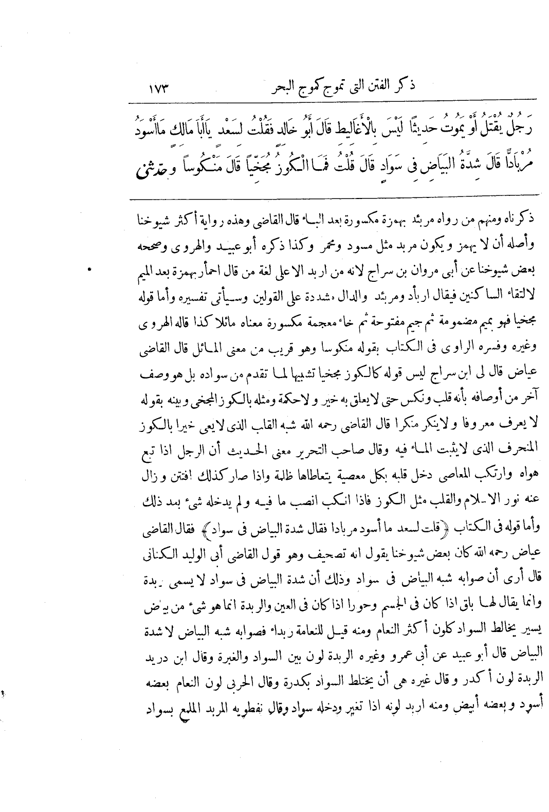 ذَكَرْنَاهُ وَمِنْهُمْ مَنْ رَوَاهُ مُرْبَئِدٌ بِهَمْزَةٍ مَكْسُورَةٍ بَعْدَ الْبَاءِ قَالَ الْقَاضِي وَهَذِهِ رِوَايَةُ أَكْثَرِ شُيُوخِنَا وَأَصْلُهُ أَنْ لَا يُهْمَزَ وَيَكُونُ مُرْبَدٌّ مِثْلُ مُسَوَّدٌ وَمُحْمَرٌّ وَكَذَا ذَكَرَهُ أَبُو عُبَيْدٍ وَالْهَرَوِيُّ وَصَحَّحَهُ بَعْضُ شُيُوخِنَا عَنْ أَبِي مَرْوَانَ بْنِ سَرَّاجٍ لِأَنَّهُ مِنَ ارْبَدَّ إِلَّا عَلَى لُغَةِ مَنْ قَالَ احْمَأَرَّ بِهَمْزَةٍ بَعْدَ الْمِيمِ لِالْتِقَاءِ السَّاكِنِينَ فَيُقَالُ ارْبَأَدَّ وَمُرْبَئِدٌّ وَالدَّالُ مُشَدَّدَةٌ عَلَى الْقَوْلَيْنِ وَسَيَأْتِي تَفْسِيرُهُ وَأَمَّا قَوْلُهُ مُجَخِّيًا فَهُوَ بِمِيمٍ مَضْمُومَةٍ ثُمَّ جِيمٍ مَفْتُوحَةٍ ثُمَّ خَاءٍ مُعْجَمَةٍ مَكْسُورَةٍ مَعْنَاهُ مَائِلًا كَذَا قَالَهُ الْهَرَوِيُّ وَغَيْرُهُ وَفَسَّرَهُ الرَّاوِي فِي الْكِتَابِ بِقَوْلِهِ مَنْكُوسًا وَهُوَ قَرِيبٌ مِنْ مَعْنَى الْمَائِلِ قَالَ القاضي عياض قال لى بن سَرَّاجٍ لَيْسَ قَوْلُهُ كَالْكُوزِ مُجَخِّيًا تَشْبِيهًا لِمَا تَقَدَّمَ مِنْ سَوَادِهِ بَلْ هُوَ وَصْفٌ آخَرُ مِنْ أَوْصَافِهِ بِأَنَّهُ قُلِبَ وَنُكِّسَ حَتَّى لَا يَعْلَقَ بِهِ خَيْرٌ وَلَا حِكْمَةٌ وَمَثَّلَهُ بِالْكُوزِ الْمُجَخِّي وَبَيَّنَهُ بِقَوْلِهِ لَا يَعْرِفُ مَعْرُوفًا وَلَا يُنْكِرُ مُنْكَرًا قَالَ الْقَاضِي رَحِمَهُ اللَّهُ شَبَّهَ الْقَلْبَ الَّذِي لَا يَعِي خَيْرًا بِالْكُوزِ الْمُنْحَرِفِ الَّذِي لَا يَثْبُتُ الْمَاءُ فِيهِ وَقَالَ صَاحِبُ التَّحْرِيرِ مَعْنَى الْحَدِيثِ أَنَّ الرَّجُلَ إِذَا تَبِعَ هَوَاهُ وَارْتَكَبَ الْمَعَاصِيَ دَخَلَ قَلْبَهُ بِكُلِّ مَعْصِيَةٍ يَتَعَاطَاهَا ظُلْمَةٌ وَإِذَا صَارَ كَذَلِكَ افْتُتِنَ وَزَالَ عَنْهُ نُورُ الْإِسْلَامِ وَالْقَلْبُ مِثْلُ الْكُوزِ فَإِذَا انْكَبَّ انْصَبَّ مَا فِيهِ وَلَمْ يَدْخُلْهُ شَيْءٌ بَعْدَ ذَلِكَ وَأَمَّا قَوْلُهُ فِي الْكِتَابِ (قُلْتُ لِسَعْدٍ مَا أَسْوَدُ مُرْبَادًّا فَقَالَ شِدَّةُ الْبَيَاضِ فِي سَوَادٍ) فَقَالَ الْقَاضِي عِيَاضٌ رَحِمَهُ اللَّهُ كَانَ بَعْضُ شُيُوخِنَا يَقُولُ إِنَّهُ تَصْحِيفٌ وَهُوَ قَوْلُ الْقَاضِي أَبِي الْوَلِيدِ الْكِنَانِيِّ قَالَ أَرَى أَنَّ صَوَابَهُ شِبْهُ الْبَيَاضِ فِي سَوَادٍ وَذَلِكَ أَنَّ شِدَّةَ الْبَيَاضِ فِي سَوَادٍ لَا يُسَمَّى رُبْدَةً وَإِنَّمَا يُقَالُ لَهَا بَلَقٌ إِذَا كَانَ فِي الْجِسْمِ وَحَوَرًا إِذَا كَانَ فِي الْعَيْنِ وَالرُّبْدَةُ إِنَّمَا هُوَ شَيْءٌ مِنْ بَيَاضٍ يَسِيرٍ يُخَالِطُ السَّوَادَ كَلَوْنِ أَكْثَرِ النَّعَامِ وَمِنْهُ قِيلَ لِلنَّعَامَةِ رَبْدَاءُ فَصَوَابُهُ شِبْهُ الْبَيَاضِ لَا شِدَّةُ الْبَيَاضِ قَالَ أَبُو عُبَيْدٍ عَنْ أَبِي عَمْرٍو وَغَيْرِهِ الرُّبْدَةُ لَوْنٌ بَيْنَ السَّوَادِ وَالْغَبَرَةِ وَقَالَ بن دُرَيْدٍ الرُّبْدَةُ لَوْنٌ أَكْدَرٌ وَقَالَ غَيْرُهُ هِيَ أَنْ يَخْتَلِطَ السَّوَادُ بِكُدْرَةٍ وَقَالَ الْحَرْبِيُّ لَوْنُ النَّعَامِ بَعْضُهُ أَسْوَدُ وَبَعْضُهُ أَبْيَضُ وَمِنْهُ ارْبَدَّ لَوْنُهُ إِذَا تَغَيَّرَ وَدَخَلَهُ سَوَادٌ وَقَالَ نَفْطَوَيْهِ الْمُرْبَدُ الْمُلَمَّعُ بِسَوَادٍ