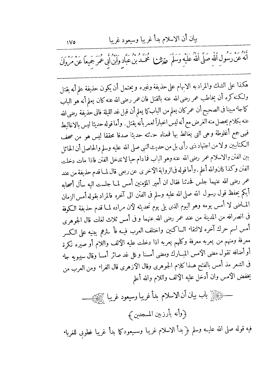 [145] فِيهِ قَوْلُهُ صَلَّى اللَّهُ عَلَيْهِ وَسَلَّمَ (بَدَأَ الْإِسْلَامُ غَرِيبًا وَسَيَعُودُ كَمَا بَدَأَ غَرِيبًا فَطُوبَى لِلْغُرَبَاءِ)