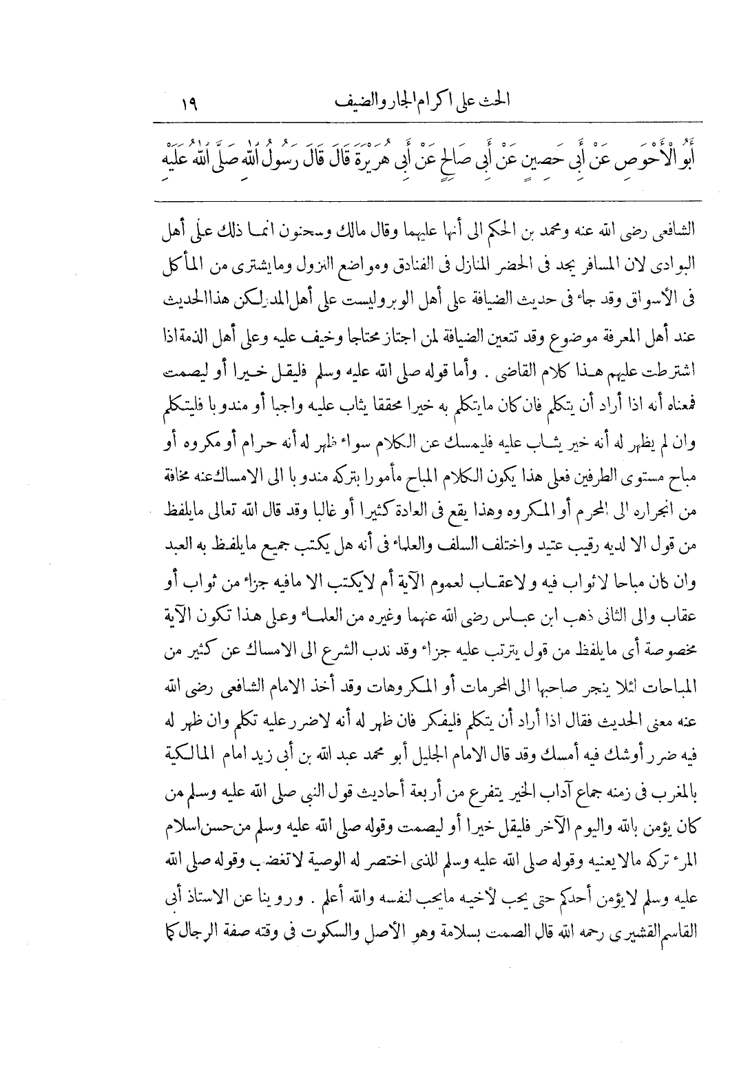 الشَّافِعِيُّ رَضِيَ اللَّهُ عَنْهُ وَمُحَمَّدُ بْنُ الْحَكَمِ إِلَى أَنَّهَا عَلَيْهِمَا وَقَالَ مَالِكٌ وَسُحْنُونٌ إِنَّمَا ذَلِكَ عَلَى أَهْلِ الْبَوَادِي لِأَنَّ الْمُسَافِرَ يَجِدُ فِي الْحَضَرِ الْمَنَازِلَ فِي الْفَنَادِقِ وَمَوَاضِعَ النُّزُولِ وَمَا يَشْتَرِي مِنَ الْمَأْكَلِ فِي الْأَسْوَاقِ وَقَدْ جَاءَ فِي حَدِيثِ الضِّيَافَةِ عَلَى أَهْلِ الْوَبَرِ وليست على أهل المدر لكن هَذَا الْحَدِيثَ عِنْدَ أَهْلِ الْمَعْرِفَةِ مَوْضُوعٌ وَقَدْ تَتَعَيَّنُ الضِّيَافَةُ لِمَنِ اجْتَازَ مُحْتَاجًا وَخِيفَ عَلَيْهِ وَعَلَى أَهْلِ الذِّمَّةِ إِذَا اشْتُرِطَتْ عَلَيْهِمْ هَذَا كَلَامُ الْقَاضِي وَأَمَّا قَوْلُهُ صَلَّى اللَّهُ عَلَيْهِ وَسَلَّمَ فَلْيَقُلْ خَيْرًا أَوْ لِيَصْمُتْ فَمَعْنَاهُ أَنَّهُ إِذَا أَرَادَ أَنْ يَتَكَلَّمَ فَإِنْ كَانَ مَا يَتَكَلَّمُ بِهِ خَيْرًا مُحَقَّقًا يُثَابُ عَلَيْهِ وَاجِبًا اومندوبا فَلْيَتَكَلَّمْ وَإِنْ لَمْ يَظْهَرْ لَهُ أَنَّهُ خَيْرٌ يُثَابُ عَلَيْهِ فَلْيُمْسِكْ عَنِ الْكَلَامِ سَوَاءٌ ظَهَرَ لَهُ أَنَّهُ حَرَامٌ أَوْ مَكْرُوهٌ أَوْ مُبَاحٌ مُسْتَوِي الطَّرَفَيْنِ فَعَلَى هَذَا يَكُونُ الْكَلَامُ الْمُبَاحُ مَأْمُورًا بِتَرْكِهِ مَنْدُوبًا إِلَى الْإِمْسَاكِ عَنْهُ مَخَافَةً مِنِ انْجِرَارِهِ إِلَى الْمُحَرَّمِ أَوِ الْمَكْرُوهِ وَهَذَا يَقَعُ فِي الْعَادَةِ كَثِيرًا أَوْ غَالِبًا وَقَدْ قَالَ اللَّهُ تَعَالَى مَا يَلْفِظُ مِنْ قَوْلٍ الا لديه رقيب عتيد وَاخْتَلَفَ السَّلَفُ وَالْعُلَمَاءُ فِي أَنَّهُ هَلْ يُكْتَبُ جَمِيعُ مَا يَلْفِظُ بِهِ الْعَبْدُ وَإِنْ كَانَ مُبَاحًا لَا ثَوَابَ فِيهِ وَلَا عِقَابَ لِعُمُومِ الآية أم لا يكتب الا مافيه جَزَاءٌ مِنْ ثَوَابٍ أَوْ عِقَابٍ وَإِلَى الثَّانِي ذهب بن عَبَّاسٍ رَضِيَ اللَّهُ عَنْهُمَا وَغَيْرُهُ مِنَ الْعُلَمَاءِ وَعَلَى هَذَا تَكُونُ الْآيَةُ مَخْصُوصَةٌ أَيْ مَا يَلْفِظُ مِنْ قَوْلٍ يَتَرَتَّبُ عَلَيْهِ جَزَاءٌ وَقَدْ نَدَبَ الشَّرْعُ إِلَى الْإِمْسَاكِ عَنْ كَثِيرٍ مِنَ الْمُبَاحَاتِ لِئَلَّا يَنْجَرَّ صَاحِبُهَا إِلَى الْمُحَرَّمَاتِ أَوِ الْمَكْرُوهَاتِ وَقَدْ أَخَذَ الْإِمَامُ الشَّافِعِيُّ رَضِيَ اللَّهُ عَنْهُ مَعْنَى الْحَدِيثِ فَقَالَ إِذَا أَرَادَ أَنْ يَتَكَلَّمَ فَلْيُفَكِّرْ فَإِنْ ظَهَرَ لَهُ أَنَّهُ لَا ضَرَرَ عَلَيْهِ تَكَلَّمَ وَإِنْ ظَهَرَ لَهُ فِيهِ ضرر أوشك فِيهِ أَمْسَكَ وَقَدْ قَالَ الْإِمَامُ الْجَلِيلُ أَبُو مُحَمَّدٍ عَبْدُ اللَّهِ بْنُ أَبِي زَيْدٍ إِمَامُ الْمَالِكِيَّةِ بِالْمَغْرِبِ فِي زَمَنِهِ جِمَاعُ آدَابِ الْخَيْرِ يَتَفَرَّعُ مِنْ أَرْبَعَةِ أَحَادِيثَ قَوْلِ النَّبِيِّ صَلَّى اللَّهُ عَلَيْهِ وَسَلَّمَ مَنْ كَانَ يُؤْمِنُ بِاللَّهِ وَالْيَوْمِ الْآخِرِ فَلْيَقُلْ خَيْرًا أَوْ لِيَصْمُتْ وَقَوْلِهِ صَلَّى اللَّهُ عَلَيْهِ وَسَلَّمَ مِنْ حُسْنِ إِسْلَامِ المرء تركه مالا يَعْنِيهِ وَقَوْلِهِ صَلَّى اللَّهُ عَلَيْهِ وَسَلَّمَ لِلَّذِي اخْتَصَرَ لَهُ الْوَصِيَّةَ لَا تَغْضَبْ وَقَوْلِهِ صَلَّى الله عليه وسلم لَا يُؤْمِنُ أَحَدُكُمْ حَتَّى يُحِبَّ لِأَخِيهِ مَا يُحِبُّ لِنَفْسِهِ وَاللَّهُ أَعْلَمُ وَرُوِّينَا عَنِ الْأُسْتَاذِ أَبِي الْقَاسِمِ الْقُشَيْرِيِّ رَحِمَهُ اللَّهُ قَالَ الصَّمْتُ بِسَلَامَةٍ وَهُوَ الْأَصْلُ وَالسُّكُوتُ فِي وَقْتِهِ صِفَةُ الرِّجَالِ كَمَا
