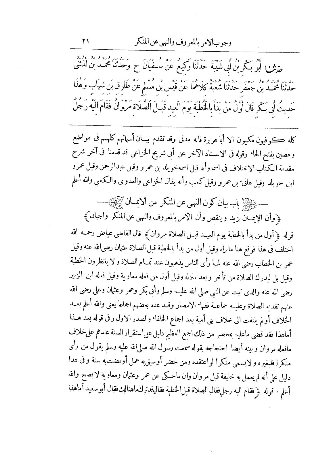 [49] قَوْلُهُ (أَوَّلُ مَنْ بَدَأَ بِالْخُطْبَةِ يَوْمَ الْعِيدِ قَبْلَ الصَّلَاةِ مَرْوَانُ قَالَ الْقَاضِي عِيَاضٌ رَحِمَهُ اللَّهُ اخْتُلِفَ فِي هَذَا فَوَقَعَ هُنَا مَا نَرَاهُ وَقِيلَ أَوَّلُ مَنْ بَدَأَ بِالْخُطْبَةِ قَبْلَ الصَّلَاةِ عُثْمَانُ رَضِيَ اللَّهُ عَنْهُ وَقِيلَ عُمَرُ بْنُ الْخَطَّابِ رَضِيَ اللَّهُ عَنْهُ لَمَّا رَأَى النَّاسَ يَذْهَبُونَ عِنْدَ تَمَامِ الصَّلَاةِ وَلَا يَنْتَظِرُونَ الْخُطْبَةَ وَقِيلَ بَلْ لِيُدْرِكَ الصَّلَاةَ مَنْ تَأَخَّرَ وَبَعُدَ مَنْزِلُهُ وَقِيلَ أَوَّلُ مَنْ فَعَلَهُ مُعَاوِيَةُ وقيل فعله بن الزُّبَيْرِ رَضِيَ اللَّهُ عَنْهُ وَالَّذِي ثَبَتَ عَنِ النَّبِيِّ صَلَّى اللَّهُ عَلَيْهِ وَسَلَّمَ وَأَبِي بَكْرٍ وَعُمَرَ وَعُثْمَانَ وَعَلِيٍّ رَضِيَ اللَّهُ عَنْهُمْ تَقْدِيمُ الصَّلَاةِ وَعَلَيْهِ جَمَاعَةُ فُقَهَاءِ الْأَمْصَارِ وَقَدْ عَدَّهُ بَعْضُهُمْ إِجْمَاعًا يَعْنِي وَاللَّهُ أَعْلَمُ بَعْدَ الْخِلَافِ أولم يَلْتَفِتْ إِلَى خِلَافِ بَنِي أُمَيَّةَ بَعْدَ إِجْمَاعِ الْخُلَفَاءِ وَالصَّدْرِ الْأَوَّلِ وَفِي قَوْلِهِ بَعْدَ هَذَا أَمَّا هَذَا فَقَدْ قَضَى مَا عَلَيْهِ بِمَحْضَرٍ مِنْ ذَلِكَ الْجَمْعِ الْعَظِيمِ دَلِيلٌ عَلَى اسْتِقْرَارِ السُّنَّةِ عِنْدَهُمْ عَلَى خِلَافِ مَا فَعَلَهُ مَرْوَانُ وَبَيَّنَهُ أَيْضًا احْتِجَاجُهُ بِقَوْلِهِ سَمِعْتُ رَسُولَ اللَّهِ صَلَّى اللَّهُ عَلَيْهِ وَسَلَّمَ يَقُولُ مَنْ رَأَى مِنْكُمْ مُنْكَرًا فَلْيُغَيِّرْهُ وَلَا يُسَمَّى مُنْكَرًا لَوِ اعتقده ومن حضر أوسبق بِهِ عَمَلٌ أَوْ مَضَتْ بِهِ سُنَّةٌ وَفِي هَذَا دَلِيلٌ عَلَى أَنَّهُ لَمْ يَعْمَلْ بِهِ خَلِيفَةٌ قَبْلَ مَرْوَانَ وَأَنَّ مَا حُكِيَ عَنْ عُمَرَ وَعُثْمَانَ وَمُعَاوِيَةَ لَا يَصِحُّ وَاللَّهُ أَعْلَمُ قَوْلُهُ (فَقَامَ إِلَيْهِ رَجُلٌ فَقَالَ الصَّلَاةُ قَبْلَ الْخُطْبَةِ فَقَالَ قَدْ تُرِكَ مَا هُنَالِكَ فَقَالَ أَبُو سَعِيدٍ أَمَّا هَذَا)