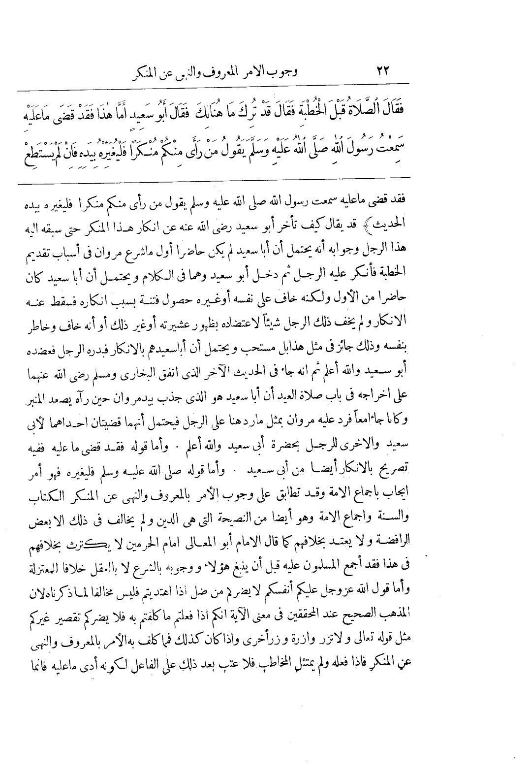 فَقَدْ قَضَى مَا عَلَيْهِ سَمِعْتُ رَسُولَ اللَّهِ صَلَّى اللَّهُ عَلَيْهِ وَسَلَّمَ يَقُولُ مَنْ رَأَى مِنْكُمْ مُنْكَرًا فَلْيُغَيِّرْهُ بِيَدِهِ الْحَدِيثَ) قَدْ يُقَالُ كَيْفَ تَأَخَّرَ أَبُو سَعِيدٍ رَضِيَ اللَّهُ عَنْهُ عَنْ إِنْكَارِ هَذَا الْمُنْكَرِ حَتَّى سَبَقَهُ إِلَيْهِ هَذَا الرَّجُلُ وَجَوَابُهُ أَنَّهُ يُحْتَمَلُ أَنَّ أَبَا سَعِيدٍ لَمْ يَكُنْ حَاضِرًا أَوَّلَ مَا شَرَعَ مَرْوَانُ فِي أَسْبَابِ تَقْدِيمِ الْخُطْبَةِ فَأَنْكَرَ عَلَيْهِ الرَّجُلُ ثُمَّ دَخَلَ أَبُو سَعِيدٍ وَهُمَا فِي الْكَلَامِ وَيُحْتَمَلُ أَنَّ أَبَا سَعِيدٍ كَانَ حَاضِرًا مِنَ الْأَوَّلِ وَلَكِنَّهُ خَافَ عَلَى نَفْسِهِ أَوْ غَيْرِهِ حُصُولَ فِتْنَةٍ بِسَبَبِ إِنْكَارِهِ فَسَقَطَ عَنْهُ الْإِنْكَارُ وَلَمْ يَخَفْ ذَلِكَ الرَّجُلُ شَيْئًا لِاعْتِضَادِهِ بِظُهُورِ عَشِيرَتِهِ أَوْ غَيْرِ ذَلِكَ أَوْ أَنَّهُ خَافَ وَخَاطَرَ بِنَفْسِهِ وَذَلِكَ جَائِزٌ فِي مِثْلِ هَذَا بَلْ مُسْتَحَبٌّ وَيُحْتَمَلُ أَنَّ أَبَا سَعِيدٍ هَمَّ بِالْإِنْكَارِ فَبَدَرَهُ الرَّجُلُ فَعَضَّدَهُ أَبُو سَعِيدٍ والله أعلم ثم أنه جَاءَ فِي الْحَدِيثِ الْآخَرِ الَّذِي اتَّفَقَ الْبُخَارِيُّ وَمُسْلِمٌ رَضِيَ اللَّهُ عَنْهُمَا عَلَى إِخْرَاجِهِ فِي بَابِ صَلَاةِ الْعِيدِ أَنَّ أَبَا سَعِيدٍ هُوَ الَّذِي جَذَبَ بِيَدِ مَرْوَانَ حِينَ رَآهُ يَصْعَدُ الْمِنْبَرَ وَكَانَا جَاءَا مَعًا فَرَدَّ عَلَيْهِ مَرْوَانُ بِمِثْلِ مَا رَدَّ هُنَا عَلَى الرَّجُلِ فَيُحْتَمَلُ أَنَّهُمَا قَضِيَّتَانِ إِحْدَاهُمَا لِأَبِي سَعِيدٍ وَالْأُخْرَى لِلرَّجُلِ بِحَضْرَةِ أَبِي سَعِيدٍ وَاللَّهُ أَعْلَمُ وَأَمَّا قَوْلُهُ فَقَدْ قَضَى مَا عَلَيْهِ فَفِيهِ تَصْرِيحٌ بِالْإِنْكَارِ أَيْضًا مِنْ أَبِي سَعِيدٍ وَأَمَّا قَوْلُهُ صَلَّى اللَّهُ عَلَيْهِ وَسَلَّمَ فَلْيُغَيِّرْهُ فَهُوَ أَمْرُ إِيجَابٍ بِإِجْمَاعِ الْأُمَّةِ وَقَدْ تَطَابَقَ عَلَى وُجُوبِ الْأَمْرِ بِالْمَعْرُوفِ وَالنَّهْيِ عَنِ الْمُنْكَرِ الْكِتَابُ وَالسُّنَّةُ وَإِجْمَاعُ الْأُمَّةِ وَهُوَ أَيْضًا مِنَ النَّصِيحَةِ الَّتِي هِيَ الدِّينُ وَلَمْ يُخَالِفْ فِي ذَلِكَ إِلَّا بَعْضُ الرَّافِضَةِ وَلَا يُعْتَدُّ بِخِلَافِهِمْ كَمَا قَالَ الْإِمَامُ أَبُو الْمَعَالِي إِمَامُ الْحَرَمَيْنِ لَا يُكْتَرَثُ بِخِلَافِهِمْ فِي هَذَا فَقَدْ أَجْمَعَ الْمُسْلِمُونَ عَلَيْهِ قَبْلَ أَنْ يَنْبُغَ هَؤُلَاءِ وَوُجُوبُهُ بِالشَّرْعِ لَا بِالْعَقْلِ خِلَافًا لِلْمُعْتَزِلَةِ وَأَمَّا قَوْلُ اللَّهِ عَزَّ وَجَلَّ عَلَيْكُمْ أَنْفُسَكُمْ لَا يَضُرُّكُمْ مَنْ ضَلَّ إِذَا اهتديتم فَلَيْسَ مُخَالِفًا لِمَا ذَكَرْنَاهُ لِأَنَّ الْمَذْهَبَ الصَّحِيحَ عِنْدَ الْمُحَقِّقِينَ فِي مَعْنَى الْآيَةِ أَنَّكُمْ إِذَا فَعَلْتُمْ مَا كُلِّفْتُمْ بِهِ فَلَا يَضُرُّكُمْ تَقْصِيرُ غَيْرِكُمْ مِثْلُ قَوْلِهِ تَعَالَى وَلَا تَزِرُ وَازِرَةٌ وزر أخرى وَإِذَا كَانَ كَذَلِكَ فَمِمَّا كُلِّفَ بِهِ الْأَمْرُ بِالْمَعْرُوفِ وَالنَّهْيُ عَنِ الْمُنْكَرِ فَإِذَا فَعَلَهُ وَلَمْ يَمْتَثِلِ الْمُخَاطَبُ فَلَا عَتْبَ بَعْدَ ذَلِكَ عَلَى الْفَاعِلِ لِكَوْنِهِ أَدَّى مَا عَلَيْهِ فَإِنَّمَا