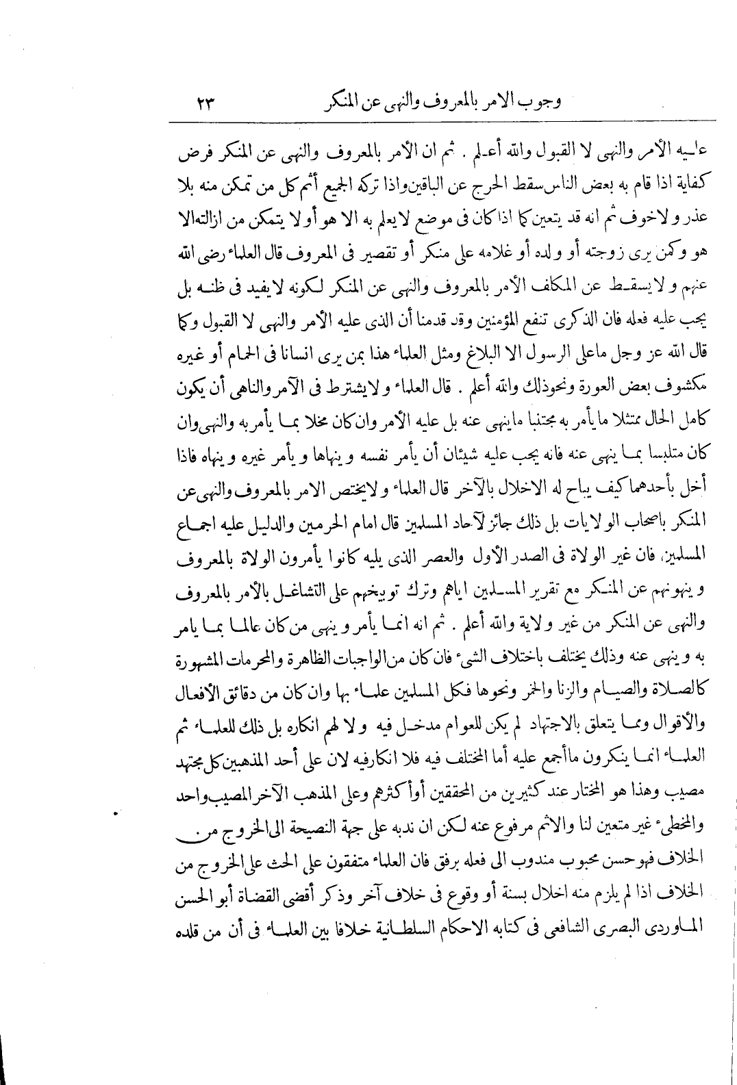 عَلَيْهِ الْأَمْرُ وَالنَّهْيُ لَا الْقَبُولُ وَاللَّهُ أَعْلَمُ ثُمَّ إِنَّ الْأَمْرَ بِالْمَعْرُوفِ وَالنَّهْيَ عَنِ الْمُنْكَرِ فَرْضُ كِفَايَةٍ إِذَا قَامَ بِهِ بَعْضُ النَّاسِ سَقَطَ الْحَرَجُ عَنِ الْبَاقِينَ وَإِذَا تَرَكَهُ الْجَمِيعُ أَثِمَ كُلُّ مَنْ تَمَكَّنَ مِنْهُ بِلَا عُذْرٍ وَلَا خَوْفٍ ثُمَّ إِنَّهُ قَدْ يَتَعَيَّنُ كَمَا إِذَا كَانَ فِي مَوْضِعٍ لَا يَعْلَمُ بِهِ الا هو أولا يَتَمَكَّنُ مِنْ إِزَالَتِهِ إِلَّا هُوَ وَكَمَنْ يَرَى زَوْجَتَهُ أَوْ وَلَدَهُ أَوْ غُلَامَهُ عَلَى مُنْكَرٍ أَوْ تَقْصِيرٍ فِي الْمَعْرُوفِ قَالَ الْعُلَمَاءُ رَضِيَ اللَّهُ عَنْهُمْ وَلَا يَسْقُطُ عَنِ الْمُكَلَّفِ الْأَمْرُ بِالْمَعْرُوفِ وَالنَّهْيُ عَنِ الْمُنْكَرِ لِكَوْنِهِ لَا يُفِيدُ فِي ظَنِّهِ بَلْ يَجِبُ عَلَيْهِ فِعْلُهُ فَإِنَّ الذِّكْرَى تَنْفَعُ الْمُؤْمِنِينَ وَقَدْ قَدَّمْنَا أَنَّ الَّذِي عَلَيْهِ الْأَمْرُ وَالنَّهْيُ لَا الْقَبُولُ وَكَمَا قَالَ اللَّهُ عَزَّ وَجَلَّ مَا عَلَى الرَّسُولِ إِلَّا البلاغ وَمَثَّلَ الْعُلَمَاءُ هَذَا بِمَنْ يَرَى إِنْسَانًا فِي الْحَمَّامِ أَوْ غَيْرِهِ مَكْشُوفَ بَعْضِ الْعَوْرَةِ وَنَحْوِ ذَلِكَ وَاللَّهُ أَعْلَمُ قَالَ الْعُلَمَاءُ وَلَا يُشْتَرَطُ فِي الْآمِرِ وَالنَّاهِي أَنْ يَكُونَ كَامِلَ الْحَالِ مُمْتَثِلًا مَا يَأْمُرُ بِهِ مُجْتَنِبًا مَا يَنْهَى عَنْهُ بَلْ عَلَيْهِ الْأَمْرُ وَإِنْ كَانَ مُخِلًّا بِمَا يَأْمُرُ بِهِ وَالنَّهْيُ وَإِنْ كَانَ مُتَلَبِّسًا بِمَا يَنْهَى عَنْهُ فَإِنَّهُ يَجِبُ عَلَيْهِ شَيْئَانِ أَنْ يَأْمُرَ نَفْسَهُ وَيَنْهَاهَا وَيَأْمُرَ غَيْرَهُ وَيَنْهَاهُ فَإِذَا أَخَلَّ بِأَحَدِهِمَا كَيْفَ يُبَاحُ لَهُ الْإِخْلَالُ بِالْآخَرِ قَالَ الْعُلَمَاءُ وَلَا يَخْتَصُّ الْأَمْرُ بِالْمَعْرُوفِ وَالنَّهْيُ عَنِ الْمُنْكَرِ بِأَصْحَابِ الْوِلَايَاتِ بَلْ ذَلِكَ جَائِزٌ لِآحَادِ الْمُسْلِمِينَ قَالَ إِمَامُ الْحَرَمَيْنِ وَالدَّلِيلُ عَلَيْهِ إِجْمَاعُ الْمُسْلِمِينَ فَإِنَّ غَيْرَ الْوُلَاةِ فِي الصَّدْرِ الْأَوَّلِ وَالْعَصْرِ الَّذِي يَلِيهِ كَانُوا يَأْمُرُونَ الْوُلَاةَ بِالْمَعْرُوفِ وَيَنْهَوْنَهُمْ عَنِ الْمُنْكَرِ مَعَ تَقْرِيرِ الْمُسْلِمِينَ إِيَّاهُمْ وَتَرْكِ تَوْبِيخِهِمْ عَلَى التَّشَاغُلِ بِالْأَمْرِ بِالْمَعْرُوفِ وَالنَّهْي عَنِ الْمُنْكَرِ مِنْ غَيْرِ وِلَايَةٍ وَاللَّهُ أَعْلَمُ ثُمَّ إِنَّهُ إِنَّمَا يَأْمُرُ وَيَنْهَى مَنْ كَانَ عَالِمًا بِمَا يَأْمُرُ بِهِ وَيَنْهَى عَنْهُ وَذَلِكَ يَخْتَلِفُ بِاخْتِلَافِ الشَّيْءِ فَإِنْ كَانَ مِنَ الْوَاجِبَاتِ الظَّاهِرَةِ وَالْمُحَرَّمَاتِ الْمَشْهُورَةِ كَالصَّلَاةِ وَالصِّيَامِ وَالزِّنَا وَالْخَمْرِ وَنَحْوِهَا فَكُلُّ الْمُسْلِمِينَ عُلَمَاءُ بِهَا وَإِنْ كَانَ مِنْ دَقَائِقِ الْأَفْعَالِ وَالْأَقْوَالِ وَمِمَّا يَتَعَلَّقُ بِالِاجْتِهَادِ لَمْ يَكُنْ لِلْعَوَامِّ مَدْخَلٌ فِيهِ وَلَا لَهُمْ إِنْكَارُهُ بَلْ ذَلِكَ لِلْعُلَمَاءِ ثُمَّ الْعُلَمَاءُ إِنَّمَا يُنْكِرُونَ مَا أُجْمِعَ عَلَيْهِ أَمَّا الْمُخْتَلَفُ فِيهِ فَلَا إِنْكَارَ فِيهِ لِأَنَّ عَلَى أَحَدِ الْمَذْهَبَيْنِ كُلُّ مُجْتَهِدٍ مُصِيبٌ وَهَذَا هُوَ الْمُخْتَارُ عِنْدَ كَثِيرِينَ مِنَ الْمُحَقِّقِينَ أَوْ أَكْثَرِهِمْ وعلى المذهب الآخر المصيب واحد والمخطىء غَيْرُ مُتَعَيَّنٌ لَنَا وَالْإِثْمُ مَرْفُوعٌ عَنْهُ لَكِنْ إِنْ نَدَبَهُ عَلَى جِهَةِ النَّصِيحَةِ إِلَى الْخُرُوجِ مِنَ الْخِلَافِ فَهُوَ حَسَنٌ مَحْبُوبٌ مَنْدُوبٌ إِلَى فِعْلِهِ بِرِفْقٍ فَإِنَّ الْعُلَمَاءَ مُتَّفِقُونَ عَلَى الْحَثِّ عَلَى الْخُرُوجِ مِنَ الْخِلَافِ إِذَا لَم