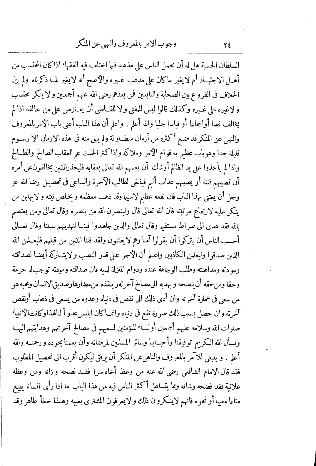 السُّلْطَانُ الْحِسْبَةَ هَلْ لَهُ أَنْ يَحْمِلَ النَّاسَ عَلَى مَذْهَبِهِ فِيمَا اخْتَلَفَ فِيهِ الْفُقَهَاءُ إِذَا كَانَ الْمُحْتَسِبُ مِنْ أَهْلِ الِاجْتِهَادِ أَمْ لَا يُغَيِّرُ مَا كَانَ عَلَى مَذْهَبِ غَيْرِهِ وَالْأَصَحُّ أَنَّهُ لَا يُغَيِّرُ لِمَا ذَكَرْنَاهُ وَلَمْ يَزَلِ الْخِلَافُ فِي الْفُرُوعِ بَيْنَ الصَّحَابَةِ وَالتَّابِعِينَ فَمَنْ بَعْدَهُمْ رَضِيَ اللَّهُ عَنْهُمْ أَجْمَعِينَ وَلَا يُنْكِرُ مُحْتَسِبٌ وَلَا غَيْرُهُ عَلَى غَيْرِهِ وَكَذَلِكَ قَالُوا لَيْسَ لِلْمُفْتِي وَلَا لِلْقَاضِي أَنْ يَعْتَرِضَ عَلَى مَنْ خَالَفَهُ إِذَا لَمْ يُخَالِفْ نَصًّا أَوْ اجماعا أوقياسا جَلِيًّا وَاللَّهُ أَعْلَمُ وَاعْلَمْ أَنَّ هَذَا الْبَابَ أَعْنِي بَابَ الْأَمْرِ بِالْمَعْرُوفِ وَالنَّهْيِ عَنِ الْمُنْكَرِ قَدْ ضُيِّعَ أَكْثَرُهُ مِنْ أَزْمَانٍ مُتَطَاوِلَةٍ وَلَمْ يَبْقَ مِنْهُ فِي هَذِهِ الْأَزْمَانِ إِلَّا رُسُومٌ قَلِيلَةٌ جِدًّا وَهُوَ بَابٌ عَظِيمٌ بِهِ قِوَامُ الأمر وملاكه واذا كثر الخبث عَمَّ الْعِقَابُ الصَّالِحَ وَالطَّالِحَ وَإِذَا لَمْ يَأْخُذُوا عَلَى يَدِ الظَّالِمِ أَوْشَكَ أَنْ يَعُمَّهُمُ اللَّهُ تَعَالَى بِعِقَابِهِ فَلْيَحْذَرِ الَّذِينَ يُخَالِفُونَ عَنْ أَمْرِهِ أَنْ تُصِيبَهُمْ فِتْنَةٌ أَوْ يُصِيبَهُمْ عَذَابٌ أَلِيمٌ فَيَنْبَغِي لِطَالِبِ الْآخِرَةِ وَالسَّاعِي فِي تَحْصِيلِ رِضَا اللَّهِ عَزَّ وَجَلَّ أَنْ يَعْتَنِيَ بِهَذَا الْبَابِ فَإِنَّ نَفْعَهُ عَظِيمٌ لَا سِيَّمَا وَقَدْ ذَهَبَ معظمه ويخلص نيته ولا يهابن مَنْ يُنْكِرُ عَلَيْهِ لِارْتِفَاعِ مَرْتَبَتِهِ فَإِنَّ اللَّهَ تعالى قال ولينصرن الله من ينصره وَقَالَ تَعَالَى وَمَنْ يَعْتَصِمْ بِاللَّهِ فَقَدْ هُدِيَ إلى صراط مستقيم وَقَالَ تَعَالَى وَالَّذِينَ جَاهَدُوا فِينَا لَنَهْدِيَنَّهُمْ سُبُلَنَا وَقَالَ تَعَالَى أَحَسِبَ النَّاسُ أَنْ يُتْرَكُوا أَنْ يَقُولُوا آمَنَّا وَهُمْ لَا يُفْتَنُونَ وَلَقَدْ فَتَنَّا الَّذِينَ مِنْ قَبْلِهِمْ فَلَيَعْلَمَنَّ اللَّهُ الَّذِينَ صَدَقُوا وليعلمن الكاذبين وَاعْلَمْ أَنَّ الْأَجْرَ عَلَى قَدْرِ النَّصَبِ وَلَا يُتَارِكُهُ أَيْضًا لِصَدَاقَتِهِ وَمَوَدَّتِهِ وَمُدَاهَنَتِهِ وَطَلَبِ الْوَجَاهَةِ عِنْدَهُ وَدَوَامِ الْمَنْزِلَةِ لَدَيْهِ فَإِنَّ صَدَاقَتَهُ وَمَوَدَّتَهُ تُوجِبُ لَهُ حُرْمَةً وَحَقًّا وَمَنْ حَقِّهِ أَنْ يَنْصَحَهُ وَيَهْدِيَهُ إِلَى مَصَالِحِ آخِرَتِهِ وَيُنْقِذهُ مِنْ مَضَارِّهَا وَصَدِيقُ الْإِنْسَانِ وَمُحِبُّهُ هُوَ مَنْ سَعَى فِي عِمَارَةِ آخِرَتِهِ وَإِنْ أَدَّى ذَلِكَ إِلَى نَقْصٍ فِي دُنْيَاهُ وَعَدُوُّهُ مَنْ يَسْعَى فِي ذَهَابِ أَوْ نَقْصِ آخِرَتِهِ وَإِنْ حَصَلَ بِسَبَبِ ذَلِكَ صُورَةُ نَفْعٍ فِي دُنْيَاهُ وَإِنَّمَا كَانَ إِبْلِيسُ عَدُوًّا لَنَا لِهَذَا وَكَانَتِ الْأَنْبِيَاءُ صَلَوَاتُ اللَّهِ وَسَلَامُهُ عَلَيْهِمْ أَجْمَعِينَ أَوْلِيَاءُ لِلْمُؤْمِنِينَ لِسَعْيِهِمْ فِي مَصَالِحِ آخِرَتِهِمْ وَهِدَايَتِهِمْ إِلَيْهَا وَنَسْأَلُ اللَّهَ الْكَرِيمَ تَوْفِيقَنَا وَأَحْبَابَنَا وَسَائِرَ الْمُسْلِمِينَ لِمَرْضَاتِهِ وَأَنْ يَعُمَّنَا بِجُودِهِ وَرَحْمَتِهِ وَاللَّهُ أَعْلَمُ وَيَنْبَغِي لِلْآمِرِ بِالْمَعْرُوفِ وَالنَّاهِي عَنِ الْمُنْكَرِ أَنْ يَرْفُقَ لِيَكُونَ أَقْرَبَ إِلَى تَحْصِيلِ الْمَطْلُوبِ فَقَدْ قَالَ الْإِمَامُ الشَّافِعِيُّ رَضِيَ اللَّهُ عَنْهُ مَنْ وَعَظَ أَخَاهُ سِرًّا فَقَدْ نَصَحَهُ وَزَانَهُ وَمَنْ وَعَظَهُ عَلَانِيَةً فَقَدْ فَضَحَهُ وَشَانَهُ وَمِمَّا يَتَسَاهَلُ أَكْثَرُ النَّاسِ فِيهِ مِنْ هَذَا الْبَابِ مَا إِذَا رَأَى إِنْسَانًا يَبِيعُ مَتَاعًا مَع