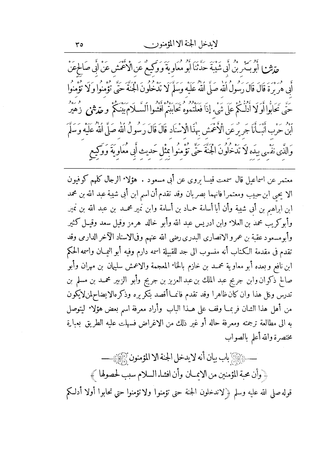 [54] قَوْلُهُ صَلَّى اللَّهُ عَلَيْهِ وَسَلَّمَ (لَا تَدْخُلُونَ الْجَنَّةَ حَتَّى تُؤْمِنُوا وَلَا تُؤْمِنُوا حَتَّى تَحَابُّوا أولا أدلكم)