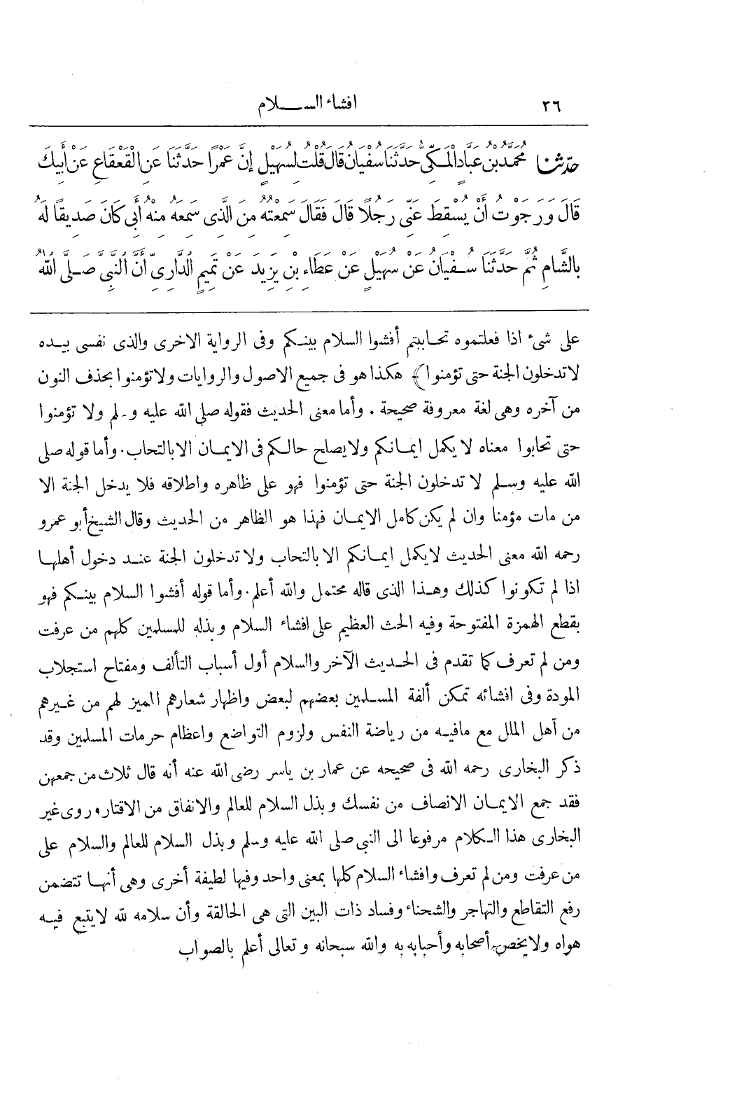 عَلَى شَيْءٍ إِذَا فَعَلْتُمُوهُ تَحَابَبْتُمْ أَفْشُوا السَّلَامَ بَيْنَكُمْ وَفِي الرِّوَايَةِ الْأُخْرَى وَالَّذِي نَفْسِي بِيَدِهِ لَا تَدْخُلُونَ الْجَنَّةَ حَتَّى تُؤْمِنُوا) هَكَذَا هُوَ فِي جَمِيعِ الْأُصُولِ وَالرِّوَايَاتِ وَلَا تُؤْمِنُوا بِحَذْفِ النُّونِ مِنْ آخِرِهِ وَهِيَ لُغَةٌ مَعْرُوفَةٌ صَحِيحَةٌ وَأَمَّا مَعْنَى الْحَدِيثِ فَقَوْلُهُ صَلَّى اللَّهُ عَلَيْهِ وَسَلَّمَ وَلَا تُؤْمِنُوا حَتَّى تَحَابُّوا مَعْنَاهُ لَا يَكْمُلُ إِيمَانُكُمْ وَلَا يَصْلُحُ حَالُكُمْ فِي الْإِيمَانِ إِلَّا بِالتَّحَابِّ وَأَمَّا قَوْلُهُ صَلَّى اللَّهُ عَلَيْهِ وسلم لاتدخلون الْجَنَّةَ حَتَّى تُؤْمِنُوا فَهُوَ عَلَى ظَاهِرِهِ وَإِطْلَاقِهِ فَلَا يَدْخُلُ الْجَنَّةَ إِلَّا مَنْ مَاتَ مُؤْمِنًا وَإِنْ لَمْ يَكُنْ كَامِلَ الْإِيمَانِ فَهَذَا هُوَ الظَّاهِرُ مِنَ الْحَدِيثِ وَقَالَ الشَّيْخُ أَبُو عَمْرٍو رَحِمَهُ اللَّهُ مَعْنَى الْحَدِيثِ لَا يَكْمُلُ إِيمَانُكُمْ إِلَّا بِالتَّحَابِّ وَلَا تَدْخُلُونَ الْجَنَّةَ عِنْدَ دُخُولِ أَهْلِهَا إِذَا لَمْ تَكُونُوا كَذَلِكَ وَهَذَا الَّذِي قَالَهُ مُحْتَمَلٌ وَاللَّهُ أَعْلَمُ وَأَمَّا قَوْلُهُ أَفْشُوا السلام بينكم فهو بقط الْهَمْزَةِ الْمَفْتُوحَةِ وَفِيهِ الْحَثُّ الْعَظِيمُ عَلَى إِفْشَاءِ السَّلَامِ وَبَذْلِهِ لِلْمُسْلِمِينَ كُلِّهِمْ مَنْ عَرَفْتَ وَمَنْ لَمْ تَعْرِفْ كَمَا تَقَدَّمَ فِي الْحَدِيثِ الْآخَرِ وَالسَّلَامُ أَوَّلُ أَسْبَابِ التَّأَلُّفِ وَمِفْتَاحُ اسْتِجْلَابِ الْمَوَدَّةِ وَفِي إِفْشَائِهِ تَمَكُّنُ أُلْفَةِ الْمُسْلِمِينَ بَعْضُهُمْ لِبَعْضٍ وَإِظْهَارُ شِعَارِهِمُ الْمُمَيِّزِ لَهُمْ مِنْ غَيْرِهِمْ مِنْ أَهْلِ الْمِلَلِ مَعَ مَا فِيهِ مِنْ رِيَاضَةِ النَّفْسِ وَلُزُومِ التَّوَاضُعِ وَإِعْظَامِ حُرُمَاتِ الْمُسْلِمِينَ وَقَدْ ذَكَرَ الْبُخَارِيُّ رَحِمَهُ اللَّهُ فِي صَحِيحِهِ عَنْ عَمَّارِ بْنِ يَاسِرٍ رَضِيَ اللَّهُ عَنْهُ أَنَّهُ قَالَ ثَلَاثٌ مَنْ جَمَعَهُنَّ فَقَدْ جَمَعَ الْإِيمَانَ الْإِنْصَافُ مِنْ نَفْسِكَ وَبَذْلُ السَّلَامِ لِلْعَالَمِ وَالْإِنْفَاقُ من الاقتار وروى غَيْرُ الْبُخَارِيِّ هَذَا الْكَلَامَ مَرْفُوعًا إِلَى النَّبِيِّ صَلَّى اللَّهُ عَلَيْهِ وَسَلَّمَ وَبَذْلُ السَّلَامِ لِلْعَالَمِ وَالسَّلَامُ عَلَى مَنْ عَرَفْتَ وَمَنْ لَمْ تَعْرِفْ وَإِفْشَاءُ السَّلَامِ كُلُّهَا بِمَعْنَى وَاحِدٍ وَفِيهَا لَطِيفَةٌ أُخْرَى وَهِيَ أَنَّهَا تَتَضَمَّنُ رَفْعَ التَّقَاطُعِ وَالتَّهَاجُرِ وَالشَّحْنَاءِ وَفَسَادِ ذَاتِ الْبَيْنِ الَّتِي هِيَ الْحَالِقَةُ وَأَنَّ سَلَامَهُ لِلَّهِ لَا يَتْبَعُ فِيهِ هَوَاهُ وَلَا يَخُصُّ أَصْحَابَهُ وَأَحْبَابَهُ بِهِ وَاللَّهُ سُبْحَانَهُ وَتَعَالَى أَعْلَمُ بِالصَّوَابِ