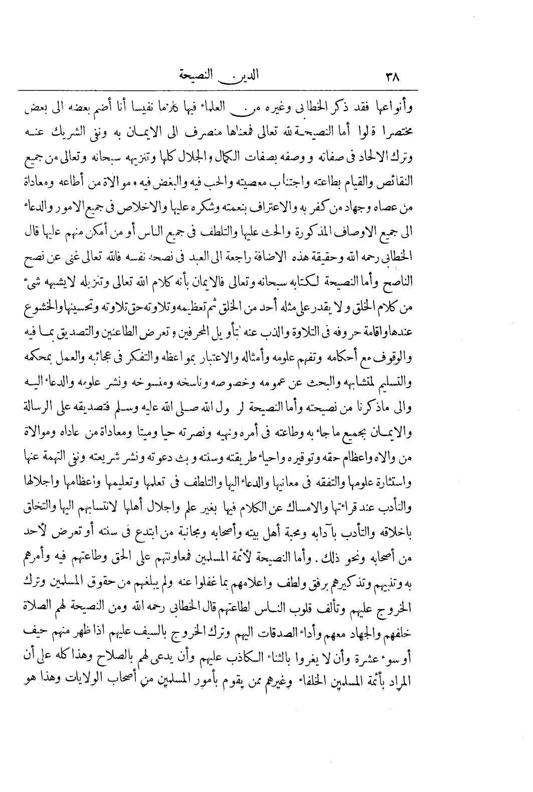 وَأَنْوَاعُهَا فَقَدْ ذَكَرَ الْخَطَّابِيُّ وَغَيْرُهُ مِنَ الْعُلَمَاءِ فِيهَا كَلَامًا نَفِيسًا أَنَا أَضُمُّ بَعْضَهُ إِلَى بَعْضٍ مُخْتَصَرًا قَالُوا أَمَّا النَّصِيحَةُ لِلَّهِ تَعَالَى فَمَعْنَاهَا مُنْصَرِفٌ إِلَى الْإِيمَانِ بِهِ وَنَفْيِ الشَّرِيكِ عَنْهُ وَتَرْكِ الْإِلْحَادِ فِي صِفَاتِهِ وَوَصْفِهِ بِصِفَاتِ الْكَمَالِ وَالْجَلَالِ كُلِّهَا وَتَنْزِيهِهِ سُبْحَانَهُ وَتَعَالَى مِنْ جَمِيعِ النَّقَائِصِ وَالْقِيَامِ بِطَاعَتِهِ وَاجْتِنَابِ مَعْصِيَتِهِ وَالْحُبِّ فيه والبغض فيه وموالاة من أطاعه ومعادة مَنْ عَصَاهُ وَجِهَادِ مَنْ كَفَرَ بِهِ وَالِاعْتِرَافِ بِنِعْمَتِهِ وَشُكْرِهِ عَلَيْهَا وَالْإِخْلَاصِ فِي جَمِيعِ الْأُمُورِ وَالدُّعَاءِ إِلَى جَمِيعِ الْأَوْصَافِ الْمَذْكُورَةِ وَالْحَثِّ عَلَيْهَا وَالتَّلَطُّفِ فِي جَمِيعِ النَّاسِ أَوْ مَنْ أَمْكَنَ مِنْهُمْ عَلَيْهَا قَالَ الْخَطَّابِيُّ رَحْمَهُ اللَّهُ وَحَقِيقَةُ هَذِهِ الْإِضَافَةِ رَاجِعَةٌ إِلَى الْعَبْدِ فِي نُصْحِهِ نَفْسَهُ فَاللَّهُ تَعَالَى غَنِيٌّ عَنْ نُصْحِ النَّاصِحِ وأما النصيحة لكتابه سبحانه وتعالى فالإيمان بأن كَلَامُ اللَّهِ تَعَالَى وَتَنْزِيلُهُ لَا يُشْبِههُ شَيْءٌ مِنْ كَلَامِ الْخَلْقِ وَلَا يَقْدِرُ عَلَى مِثْلِهِ أَحَدٌ مِنَ الْخَلْقِ ثُمَّ تَعْظِيمُهُ وَتِلَاوَتُهُ حَقَّ تِلَاوَتِهِ وَتَحْسِينُهَا وَالْخُشُوعُ عِنْدَهَا وَإِقَامَةُ حُرُوفِهِ فِي التِّلَاوَةِ وَالذَّبُّ عَنْهُ لِتَأْوِيلِ الْمُحَرِّفِينَ وَتَعَرُّضِ الطَّاعِنِينَ وَالتَّصْدِيقُ بِمَا فِيهِ وَالْوُقُوفُ مَعَ أَحْكَامِهِ وَتَفَهُّمُ عُلُومِهِ وَأَمْثَالِهِ وَالِاعْتِبَارُ بِمَوَاعِظِهِ وَالتَّفَكُّرُ فِي عَجَائِبِهِ وَالْعَمَلُ بِمُحْكَمِهِ وَالتَّسْلِيمُ لِمُتَشَابِهِهِ وَالْبَحْثُ عَنْ عُمُومِهِ وَخُصُوصِهِ وَنَاسِخِهِ وَمَنْسُوخِهِ وَنَشْرُ عُلُومِهِ وَالدُّعَاءُ إِلَيْهِ والى ما ذكرناه مِنْ نَصِيحَتِهِ وَأَمَّا النَّصِيحَةُ لِرَسُولِ اللَّهِ صَلَّى اللَّهُ عَلَيْهِ وَسَلَّمَ فَتَصْدِيقُهُ عَلَى الرِّسَالَةِ وَالْإِيمَانُ بِجَمِيعِ مَا جَاءَ بِهِ وَطَاعَتُهُ فِي أَمْرِهِ ونهيه ونصرته حيا وميتا ومعاداة عن عَادَاهُ وَمُوَالَاةُ مَنْ وَالَاهُ وَإِعْظَامُ حَقِّهِ وَتَوْقِيرُهُ وَإِحْيَاءُ طَرِيقَتِهِ وَسُنَّتِهِ وَبَثُّ دَعْوَتِهِ وَنَشْرُ شَرِيعَتِهِ وَنَفْيُ التُّهْمَةِ عَنْهَا وَاسْتِثَارَةُ عُلُومِهَا وَالتَّفَقُّهُ فِي مَعَانِيهَا وَالدُّعَاءُ إِلَيْهَا وَالتَّلَطُّفُ فِي تَعَلُّمِهَا وَتَعْلِيمِهَا وَإِعْظَامُهَا وَإِجْلَالُهَا وَالتَّأَدُّبُ عِنْدَ قِرَاءَتِهَا وَالْإِمْسَاكُ عَنِ الكلام فيها بغير علم واجلال أهلها لانتسابها إِلَيْهَا وَالتَّخَلُّقُ بِأَخْلَاقِهِ وَالتَّأَدُّبُ بِآدَابِهِ وَمَحَبَّةُ أَهْلِ بَيْتِهِ وَأَصْحَابِهِ وَمُجَانَبَةُ مَنِ ابْتَدَعَ فِي سُنَّتِهِ أوتعرض لِأَحَدٍ مِنْ أَصْحَابِهِ وَنَحْوُ ذَلِكَ وَأَمَّا النَّصِيحَةُ لِأَئِمَّةِ الْمُسْلِمِينَ فَمُعَاوَنَتُهُمْ عَلَى الْحَقِّ وَطَاعَتُهُمْ فِيهِ وأمرهم به وتنبيهم وَتَذْكِيرُهُمْ بِرِفْقٍ وَلُطْفٍ وَإِعْلَامُهُمْ بِمَا غَفَلُوا عَنْهُ وَلَمْ يَبْلُغْهُمْ مِنْ حُقُوقِ الْمُسْلِمِينَ وَتَرْكُ الْخُرُوجِ عَلَيْهِمْ وَتَأَلُّفُ قُلُوبِ النَّاسِ لِطَاعَتِهِمْ قَالَ الْخَطَّابِيُّ رَحِمَهُ اللَّهُ وَمِنَ النَّصِيحَةِ لَهُمُ الصَّلَاةُ خَلْفَهُمْ وَالْجِهَادُ مَعَهُمْ وَأَدَاءُ الصَّدَقَاتِ إِلَيْهِمْ وَتَرْكُ الْخُرُوجِ بِالسَّيْفِ عَلَيْهِمْ إِذَا ظَهَرَ مِنْهُمْ حَيْفٌ أَوْ سُوءُ عِشْرَةٍ وَأَنْ لَا يُغَرُّوا بِالثَّنَاءِ الْكَاذِبِ عَلَيْهِمْ وَأَنْ يُدْعَى لَهُمْ بِالصَّلَا