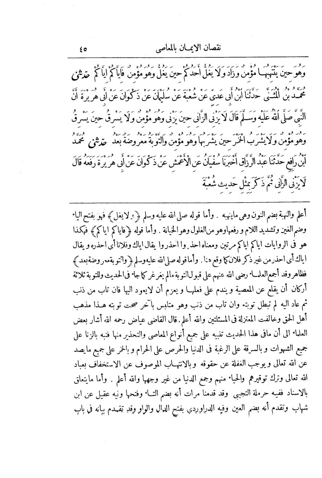 أَعْلَمُ وَالنُّهْبَةُ بِضَمِّ النُّونِ وَهِيَ مَا يَنْهَبُهُ وَأَمَّا قَوْلُهُ صَلَّى اللَّهُ عَلَيْهِ وَسَلَّمَ (وَلَا يَغُلُّ) فَهُوَ بِفَتْحِ الْيَاءِ وَضَمِّ الْغَيْنِ وَتَشْدِيدِ اللَّامِ وَرَفْعِهَا وَهُوَ مِنَ الْغُلُولِ وَهُوَ الْخِيَانَةُ وَأَمَّا قَوْلُهُ (فَإِيَّاكُمْ إِيَّاكُمْ) فَهَكَذَا هُوَ فِي الرِّوَايَاتِ إِيَّاكُمْ إِيَّاكُمْ مَرَّتَيْنِ وَمَعْنَاهُ احْذَرُوا احْذَرُوا يُقَالُ إِيَّاكَ وَفُلَانًا أَيِ احْذَرْهُ وَيُقَالُ إِيَّاكَ أَيِ احْذَرْ مِنْ غَيْرِ ذِكْرِ فُلَانٍ كَمَا وَقَعَ هُنَا وَأَمَّا قَوْلُهُ صَلَّى اللَّهُ عَلَيْهِ وَسَلَّمَ (وَالتَّوْبَةُ مَعْرُوضَةٌ بَعْدُ) فَظَاهِرٌ وَقَدْ أَجْمَعَ الْعُلَمَاءُ رَضِيَ اللَّهُ عَنْهُمْ عَلَى قَبُولِ التَّوْبَةِ مَا لَمْ يُغَرْغِرْ كَمَا جَاءَ فِي الْحَدِيثِ وَلِلتَّوْبَةِ ثَلَاثَةُ أَرْكَانٍ أَنْ يُقْلِعَ عَنِ الْمَعْصِيَةِ وَيَنْدَمَ عَلَى فِعْلِهَا وَيَعْزِمَ أَنْ لَا يَعُودَ إِلَيْهَا فَإِنْ تَابَ مِنْ ذَنْبٍ ثُمَّ عَادَ إِلَيْهِ لَمْ تَبْطُلْ تَوْبَتُهُ وَإِنْ تَابَ مِنْ ذَنْبٍ وَهُوَ مُتَلَبِّسٌ بِآخَرَ صَحَّتْ تَوْبَتُهُ هَذَا مذهب أهل الحق وخالفت المعتزلة فى المسئلتين وَاللَّهُ أَعْلَمُ قَالَ الْقَاضِي عِيَاضٌ رَحِمَهُ اللَّهُ أَشَارَ بَعْضُ الْعُلَمَاءِ إِلَى أَنَّ مَا فِي هذا الْحَدِيثِ تَنْبِيهٌ عَلَى جَمِيعِ أَنْوَاعِ الْمَعَاصِي وَالتَّحْذِيرِ منها فنبه بالزنى عَلَى جَمِيعِ الشَّهَوَاتِ وَبِالسَّرِقَةِ عَلَى الرَّغْبَةِ فِي الدُّنْيَا وَالْحِرْصِ عَلَى الْحَرَامِ وَبِالْخَمْرِ عَلَى جَمِيعِ مَا يَصُدُّ عَنِ اللَّهِ تَعَالَى وَيُوجِبُ الْغَفْلَةِ عَنْ حُقُوقِهِ وَبِالِانْتِهَابِ الْمَوْصُوفِ عَنْ الِاسْتِخْفَافِ بِعِبَادِ اللَّهِ تَعَالَى وَتَرْكِ تَوْقِيرِهِمْ وَالْحَيَاءِ مِنْهُمْ وَجَمْعِ الدُّنْيَا مِنْ غَيْرِ وَجْهِهَا وَاللَّهُ أَعْلَمُ وَأَمَّا مَا يَتَعَلَّقُ بِالْإِسْنَادِ فَفِيهِ حَرْمَلَةُ التُّجِيبِيُّ وَقَدْ قَدَّمْنَا مَرَّاتٍ أَنَّهُ بِضَمِّ التَّاءِ وَفَتْحِهَا وَفِيهِ عقيل عن بن شهاب وتقدم أنه بضم العين وفيه الدراؤردى بِفَتْحِ الدَّالِ وَالْوَاوِ وَقَدْ تَقَدَّمَ بَيَانُهُ فِي باب