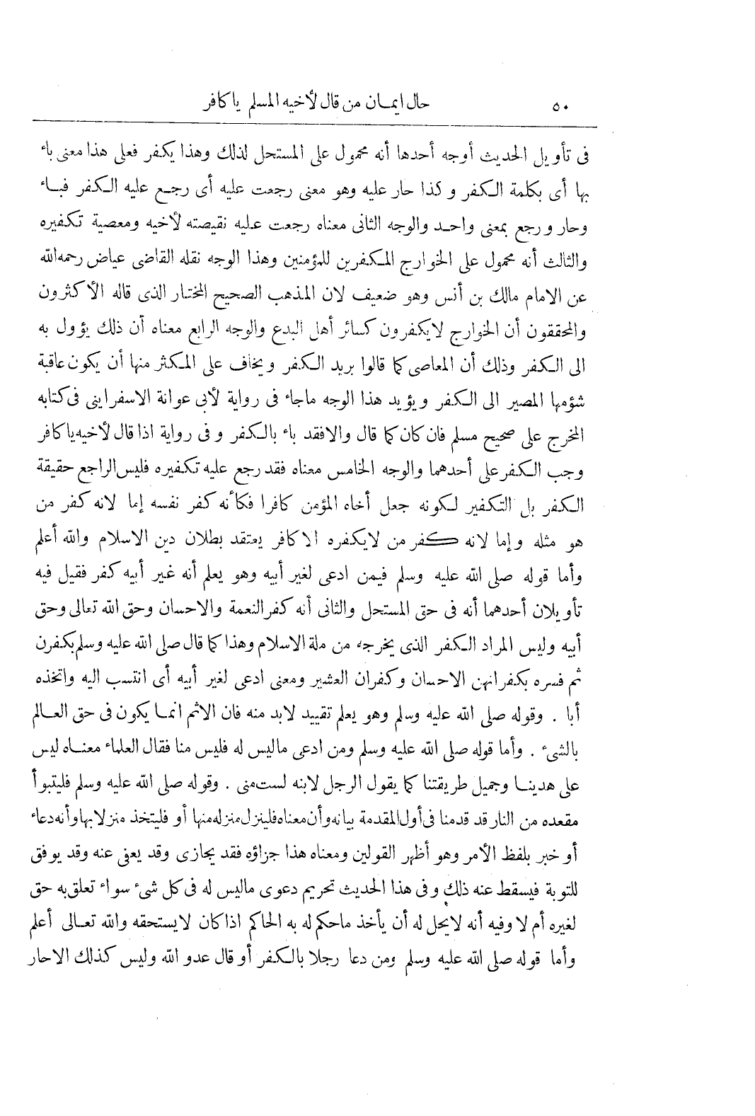 فِي تَأْوِيلِ الْحَدِيثِ أَوْجُهٌ أَحَدُهَا أَنَّهُ مَحْمُولٌ عَلَى الْمُسْتَحِلِّ لِذَلِكَ وَهَذَا يُكَفَّرُ فَعَلَى هَذَا مَعْنَى بَاءَ بِهَا أَيْ بِكَلِمَةِ الْكُفْرِ وَكَذَا حَارَ عَلَيْهِ وَهُوَ مَعْنَى رَجَعَتْ عَلَيْهِ أَيْ رَجَعَ عَلَيْهِ الْكُفْرُ فَبَاءَ وَحَارَ وَرَجَعَ بِمَعْنًى وَاحِدٍ وَالْوَجْهُ الثَّانِي مَعْنَاهُ رَجَعَتْ عَلَيْهِ نَقِيصَتُهُ لِأَخِيهِ وَمَعْصِيَةُ تَكْفِيرِهِ وَالثَّالِثُ أَنَّهُ مَحْمُولٌ عَلَى الْخَوَارِجِ الْمُكَفِّرِينَ لِلْمُؤْمِنِينَ وَهَذَا الْوَجْهُ نَقَلَهُ الْقَاضِي عِيَاضٌ رَحِمَهُ اللَّهُ عَنِ الْإِمَامِ مَالِكِ بْنِ أَنَسٍ وَهُوَ ضَعِيفٌ لِأَنَّ الْمَذْهَبَ الصَّحِيحَ الْمُخْتَارَ الَّذِي قَالَهُ الْأَكْثَرُونَ وَالْمُحَقِّقُونَ أَنَّ الْخَوَارِجَ لَا يُكَفَّرُونَ كَسَائِرِ أَهْلِ الْبِدَعِ وَالْوَجْهُ الرَّابِعُ مَعْنَاهُ أن ذلك يؤول بِهِ إِلَى الْكُفْرِ وَذَلِكَ أَنَّ الْمَعَاصِيَ كَمَا قَالُوا بَرِيدُ الْكُفْرِ وَيُخَافُ عَلَى الْمُكْثِرِ مِنْهَا أَنْ يَكُونَ عَاقِبَةَ شُؤْمِهَا الْمَصِيرُ إِلَى الْكُفْرِ وَيُؤَيِّدُ هَذَا الْوَجْهَ مَا جَاءَ فِي رِوَايَةٍ لِأَبِي عَوَانَةَ الْإِسْفَرَايِنِيِّ فِي كِتَابِهِ الْمُخَرَّجُ عَلَى صَحِيحِ مُسْلِمٍ فَإِنْ كَانَ كَمَا قَالَ وَإِلَّا فَقَدْ بَاءَ بِالْكُفْرِ وَفِي رِوَايَةٍ إِذَا قَالَ لِأَخِيهِ يَا كَافِرُ وَجَبَ الْكُفْرُ عَلَى أَحَدِهِمَا وَالْوَجْهُ الْخَامِسُ مَعْنَاهُ فَقَدْ رَجَعَ عَلَيْهِ تَكْفِيرُهُ فَلَيْسَ الرَّاجِعُ حَقِيقَةُ الْكُفْرِ بَلِ التَّكْفِيرُ لِكَوْنِهِ جَعَلَ أَخَاهُ الْمُؤْمِنَ كَافِرًا فَكَأَنَّهُ كَفَّرَ نَفْسَهُ إِمَّا لِأَنَّهُ كَفَّرَ مَنْ هُوَ مِثْلَهُ وَإِمَّا لِأَنَّهُ كَفَّرَ مَنْ لَا يُكَفِّرُهُ إِلَّا كَافِرٌ يَعْتَقِدُ بُطْلَانَ دِينِ الْإِسْلَامِ وَاللَّهُ أَعْلَمُ وَأَمَّا قَوْلُهُ صَلَّى اللَّهُ عَلَيْهِ وَسَلَّمَ فِيمَنِ ادَّعَى لِغَيْرِ أَبِيهِ وَهُوَ يَعْلَمُ أَنَّهُ غَيْرُ أَبِيهِ كَفَرَ فَقِيلَ فِيهِ تَأْوِيلَانِ أَحَدُهُمَا أَنَّهُ فِي حَقِّ الْمُسْتَحِلِّ وَالثَّانِي أَنَّهُ كُفْرُ النِّعْمَةِ وَالْإِحْسَانِ وَحَقِّ اللَّهِ تَعَالَى وَحَقِّ أَبِيهِ وَلَيْسَ الْمُرَادُ الْكُفْرُ الَّذِي يُخْرِجُهُ مِنْ مِلَّةِ الْإِسْلَامِ وَهَذَا كما قال صلى الله عليه وسلم بكفرن ثُمَّ فَسَّرَهُ بِكُفْرَانِهِنَّ الْإِحْسَانَ وَكُفْرَانِ الْعَشِيرِ وَمَعْنَى ادَّعَى لِغَيْرِ أَبِيهِ أَيِ انْتَسَبَ إِلَيْهِ وَاتَّخَذَهُ أَبًا وَقَوْلُهُ صَلَّى اللَّهُ عَلَيْهِ وَسَلَّمَ وَهُوَ يعلم تقييد لابد مِنْهُ فَإِنَّ الْإِثْمَ إِنَّمَا يَكُونُ فِي حَقِّ الْعَالِمِ بِالشَّيْءِ وَأَمَّا قَوْلُهُ صَلَّى اللَّهُ عَلَيْهِ وَسَلَّمَ وَمَنِ ادَّعَى مَا لَيْسَ لَهُ فَلَيْسَ مِنَّا فَقَالَ الْعُلَمَاءُ مَعْنَاهُ لَيْسَ عَلَى هَدْيِنَا وَجَمِيلِ طَرِيقَتِنَا كَمَا يَقُولُ الرَّجُلُ لِابْنِهِ لَسْتَ مِنِّي وَقَوْلُهُ صَلَّى اللَّهُ عَلَيْهِ وَسَلَّمَ فَلْيَتَبَوَّأْ مَقْعَدَهُ مِنَ النَّارِ قَدْ قَدَّمْنَا فِي أَوَّلِ الْمُقَدِّمَةِ بَيَانَهُ وَأَنَّ مَعْنَاهُ فَلْيَنْزِلْ مَنْزِلَهُ مِنْهَا أو فليتخذ منزلا بها وأنه دعاء أوخبر بِلَفْظِ الْأَمْرِ وَهُوَ أَظْهَرُ الْقَوْلَيْنِ وَمَعْنَاهُ هَذَا جَزَاؤُهُ فَقَدْ يُجَازَى وَقَدْ يُعْفَى عَنْهُ وَقَدْ يُوَفَّقُ لِلتَّوْبَةِ فَيَسْقُطُ عَنْهُ ذَلِكَ وَفِي هَذَا الحديث تحريم دعوى ماليس لَهُ فِي كُلِّ شَيْءٍ سَوَاءٌ تَعَلَّقَ بِهِ حَقٌّ لِغَيْرِهِ أَمْ لَا وَفِيهِ أَنَّهُ لَا يَحِلُّ لَهُ أَنْ يَأْخُذَ مَا حَكَمَ لَهُ بِهِ الْحَاكِمُ إِذَا كَانَ لَا يَسْتَحِقُّهُ وَاللَّهُ تَعَالَى أَعْلَم