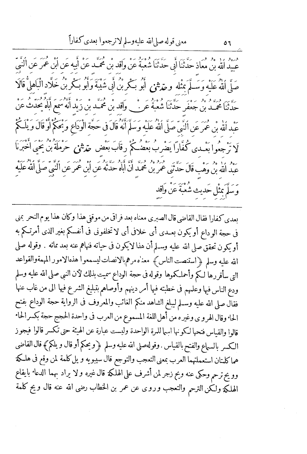 بَعْدِي كُفَّارًا فَقَالَ الْقَاضِي قَالَ الصُّبَرِيُّ مَعْنَاهُ بَعْدَ فِرَاقِي مِنْ مَوْقِفِي هَذَا وَكَانَ هَذَا يَوْمُ النَّحْرِ بِمِنًى فِي حِجَّةِ الْوَدَاعِ أَوْ يَكُونُ بَعْدِي أَيْ خِلَافِي أَيْ لَا تَخْلُفُونِي فِي أَنْفُسِكُمْ بِغَيْرِ الَّذِي أَمَرْتُكُمْ بِهِ أَوْ يَكُونُ تَحَقَّقَ صَلَّى اللَّهُ عَلَيْهِ وَسَلَّمَ أَنَّ هَذَا لَا يَكُونُ فِي حَيَاتِهِ فَنَهَاهُمْ عَنْهُ بَعْدَ مَمَاتِهِ وَقَوْلُهُ صَلَّى اللَّهُ عَلَيْهِ وَسَلَّمَ (اسْتَنْصِتِ النَّاسَ) مَعْنَاهُ مُرْهُمْ بِالْإِنْصَاتِ لِيَسْمَعُوا هَذِهِ الْأُمُورَ الْمُهِمَّةِ وَالْقَوَاعِدَ الَّتِي سَأُقَرِّرُهَا لَكُمْ وَأُحَمِّلُكُمُوهَا وَقَوْلُهُ فِي حَجَّةِ الْوَدَاعِ سُمِّيَتْ بِذَلِكَ لِأَنَّ النَّبِيَّ صَلَّى اللَّهُ عَلَيْهِ وَسَلَّمَ وَدَّعَ النَّاسَ فِيهَا وَعَلَّمَهُمْ فِي خُطْبَتِهِ فِيهَا أَمْرَ دِينَهُمْ وَأَوْصَاهُمْ بِتَبْلِيغِ الشَّرْعِ فِيهَا إِلَى مَنْ غَابَ عَنْهَا فَقَالَ صَلَّى اللَّهُ عَلَيْهِ وَسَلَّمَ لِيُبَلِّغِ الشَّاهِدُ مِنْكُمُ الْغَائِبَ وَالْمَعْرُوفُ فِي الرِّوَايَةِ حَجَّةُ الْوَدَاعِ بِفَتْحِ الْحَاءِ وَقَالَ الْهَرَوِيُّ وَغَيْرُهُ مِنْ أَهْلِ اللُّغَةِ الْمَسْمُوعُ مِنَ الْعَرَبِ فِي وَاحِدَةِ الْحِجَجِ حِجَّةٌ بِكَسْرِ الْحَاءِ قَالُوا وَالْقِيَاسُ فَتْحُهَا لِكَوْنِهَا اسْمًا لِلْمَرَّةِ الْوَاحِدَةِ وَلَيْسَتْ عِبَارَةً عَنِ الْهَيْئَةِ حَتَّى تُكْسَرَ قَالُوا فَيَجُوزُ الْكَسْرُ بِالسَّمَاعِ وَالْفَتْحُ بِالْقِيَاسِ وَقَوْلُهُ صَلَّى اللَّهُ عَلَيْهِ وَسَلَّمَ (وَيْحَكُمْ أَوْ قَالَ وَيْلَكُمْ) قَالَ الْقَاضِي هُمَا كَلِمَتَانِ اسْتَعْمَلَتْهُمَا الْعَرَبُ بِمَعْنَى التَّعَجُّبِ وَالتَّوَجُّعِ قَالَ سِيبَوَيْهِ وَيْلٌ كَلِمَةٌ لِمَنْ وَقَعَ فِي هَلَكَةٍ وويح تَرَحُّمٌ وَحُكِيَ عَنْهُ وَيْحٌ زَجْرٌ لِمَنْ أَشْرَفَ عَلَى الْهَلَكَةِ قَالَ غَيْرُهُ وَلَا يُرَادُ بِهِمَا الدُّعَاءُ بِإِيقَاعِ الْهَلَكَةِ وَلَكِنِ التَّرَحُّمُ وَالتَّعَجُّبُ وَرُوِيَ عَنْ عُمَرَ بْنِ الْخَطَّابِ رَضِيَ اللَّهُ عَنْهُ قَالَ وَيْحٌ كَلِمَةُ