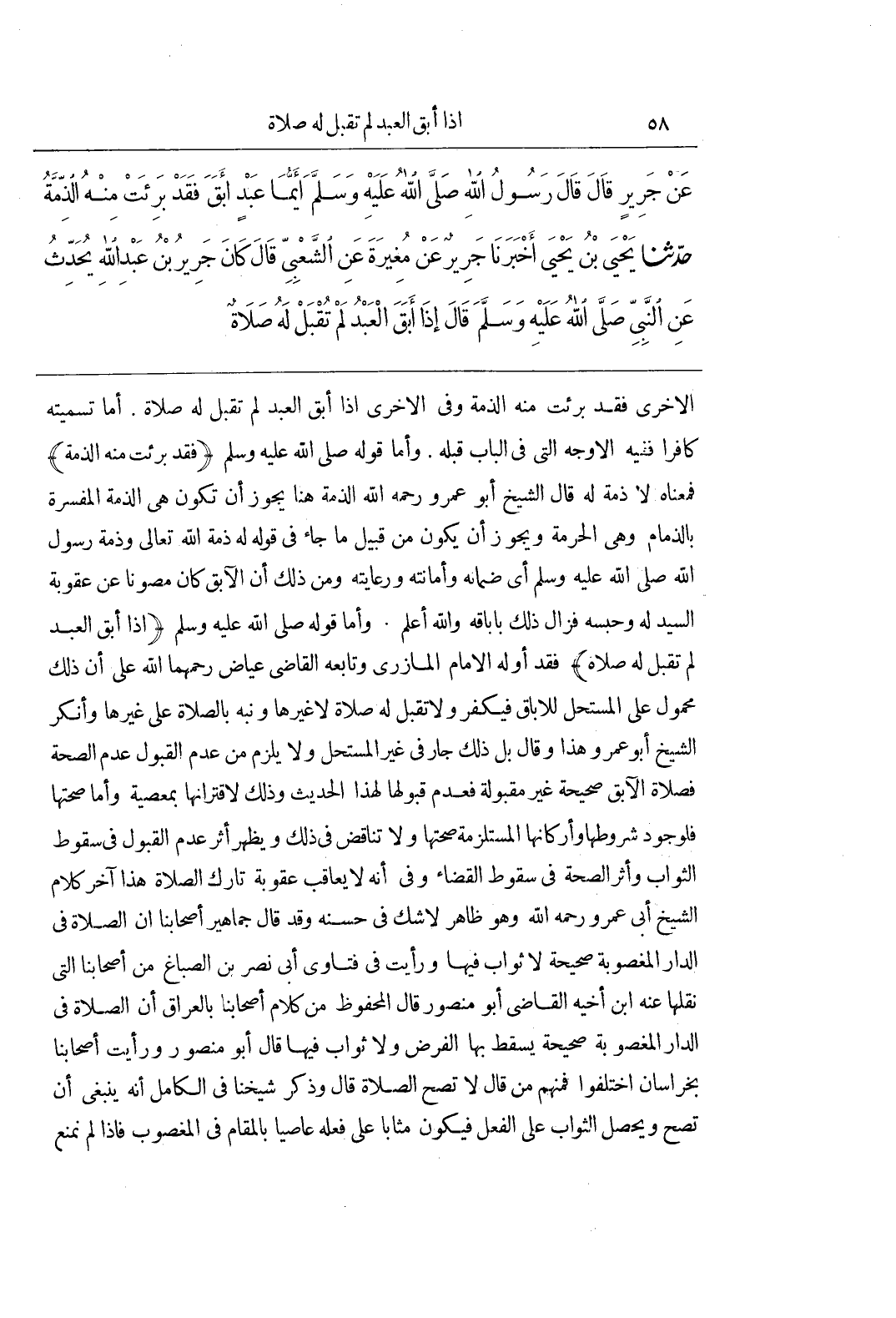 الْأُخْرَى فَقَدْ بَرِئَتْ مِنْهُ الذِّمَّةُ وَفِي الْأُخْرَى إِذَا أَبَقَ الْعَبْدُ لَمْ تُقْبَلْ لَهُ صَلَاةٌ أَمَّا تَسْمِيَتُهُ كَافِرًا فَفِيهِ الْأَوْجُهُ الَّتِي فِي الْبَابِ قَبْلِهِ وَأَمَّا