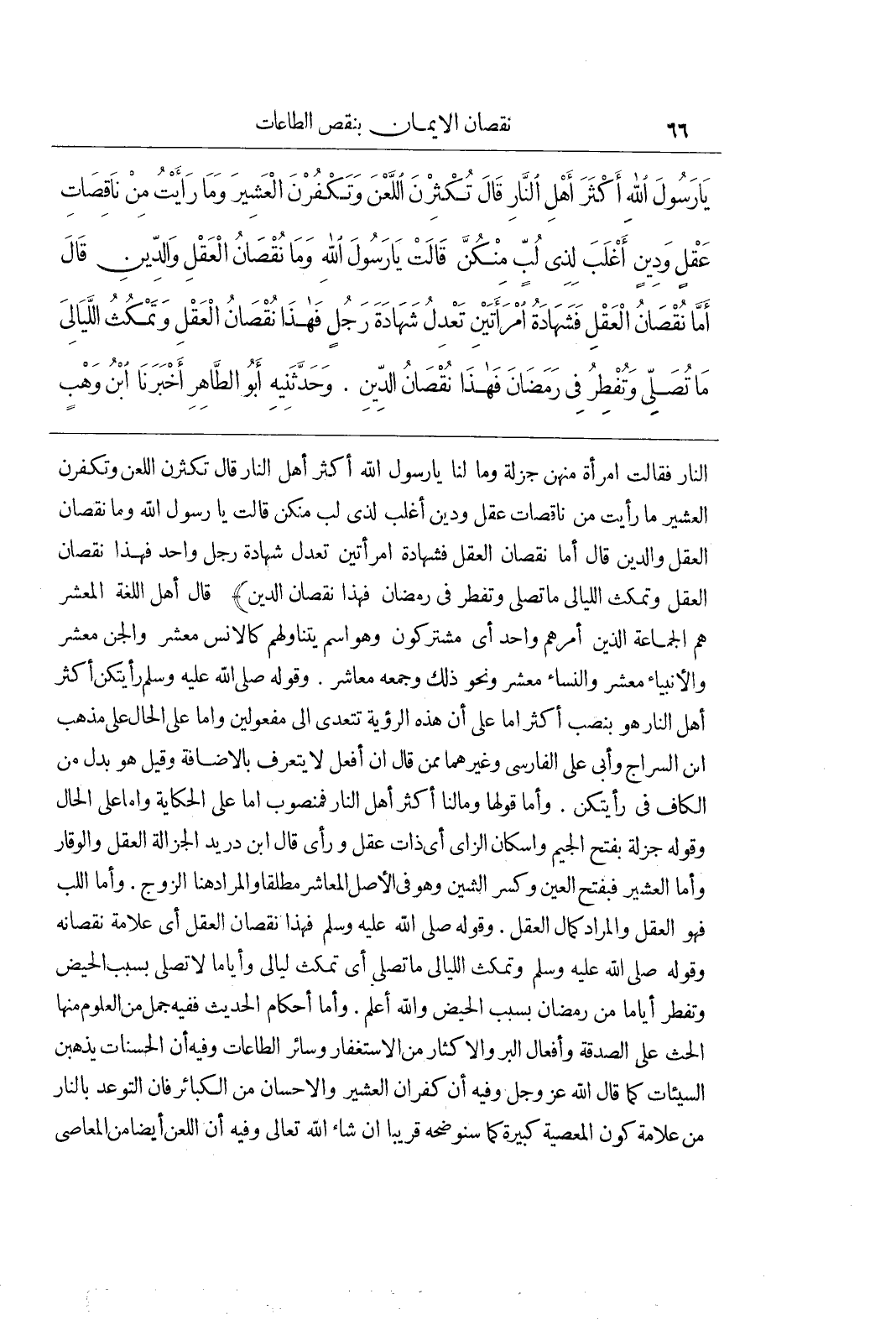 النَّارِ فَقَالَتِ امْرَأَةٌ مِنْهُنَّ جَزْلَةٌ وَمَا لَنَا يَا رَسُولَ اللَّهِ أَكْثَرَ أَهْلِ النَّارِ قَالَ تُكْثِرْنَ اللَّعْنَ وَتَكْفُرْنَ الْعَشِيرَ مَا رَأَيْتُ مِنْ نَاقِصَاتِ عَقْلٍ وَدِينٍ أَغْلَبَ لِذِي لُبٍّ مِنْكُنَّ قَالَتْ يَا رَسُولَ اللَّهِ وَمَا نُقْصَانُ الْعَقْلِ وَالدِّينِ قَالَ أَمَّا نُقْصَانُ الْعَقْلِ فَشَهَادَةُ امْرَأَتَيْنِ تَعْدِلُ شَهَادَةُ رَجُلٍ وَاحِدٍ فَهَذَا نُقْصَانُ الْعَقْلِ وَتَمْكُثُ اللَّيَالِيَ مَا تُصَلِّي وَتُفْطِرُ فِي رَمَضَانَ فَهَذَا نُقْصَانُ الدِّينِ) قَالَ أَهْلُ اللُّغَةِ الْمَعْشَرُ هُمُ الْجَمَاعَةُ الَّذِينَ أَمْرُهُمْ وَاحِدٌ أَيْ مُشْتَرِكُونَ وَهُوَ اسْمٌ يَتَنَاوَلُهُمْ كَالْإِنْسِ مَعْشَرٌ وَالْجِنُّ مَعْشَرٌ وَالْأَنْبِيَاءُ مَعْشَرٌ وَالنِّسَاءُ مَعْشَرٌ وَنَحْوُ ذَلِكَ وَجَمْعُهُ مَعَاشِرُ وَقَوْلُهُ صَلَّى اللَّهُ عَلَيْهِ وَسَلَّمَ رَأَيْتُكُنَّ أكثر اهل النار هو بِنَصْبِ أَكْثَرَ إِمَّا عَلَى أَنَّ هَذِهِ الرُّؤْيَةَ تَتَعَدَّى إِلَى مَفْعُولَيْنِ وَإِمَّا عَلَى الْحَالِ عَلَى مذهب بن السَّرَّاجِ وَأَبِي عَلِيٍّ الْفَارِسِيِّ وَغَيْرِهِمَا مِمَّنْ قَالَ إِنَّ أَفْعَلَ لَا يَتَعَرَّفُ بِالْإِضَافَةِ وَقِيلَ هُوَ بَدَلٌ مِنَ الْكَافِ فِي رَأَيْتُكُنَّ وَأَمَّا قَوْلُهَا ومالنا أَكْثَرَ أَهْلِ النَّارِ فَمَنْصُوبٌ إِمَّا عَلَى الْحِكَايَةِ وَإِمَّا عَلَى الْحَالِ وَقَوْلُهُ جَزْلَةٌ بِفَتْحِ الْجِيمِ وَإِسْكَانِ الزَّايِ أَيْ ذَاتُ عَقْلٍ وَرَأْيٍ قَالَ بن دُرَيْدٍ الْجَزَالَةُ الْعَقْلُ وَالْوَقَارُ وَأَمَّا الْعَشِيرُ فَبِفَتْحِ العين وكسرالشين وَهُوَ فِي الْأَصْلِ الْمُعَاشِرُ مُطْلَقًا وَالْمُرَادُ هُنَا الزَّوْجُ وَأَمَّا اللُّبُّ فَهُوَ الْعَقْلُ وَالْمُرَادُ كَمَالُ الْعَقْلِ وَقَوْلُهُ صَلَّى اللَّهُ عَلَيْهِ وَسَلَّمَ فَهَذَا نُقْصَانُ الْعَقْلِ أَيْ عَلَامَةُ نُقْصَانِهِ وَقَوْلُهُ صَلَّى اللَّهُ عَلَيْهِ وَسَلَّمَ وَتَمْكُثُ اللَّيَالِيَ مَا تُصَلِّي أَيْ تَمْكُثُ لَيَالِيَ وَأَيَّامًا لَا تُصَلِّي بِسَبَبِ الْحَيْضِ وَتُفْطِرُ أَيَّامًا مِنْ رَمَضَانَ بِسَبَبِ الْحَيْضِ وَاللَّهُ أَعْلَمُ وَأَمَّا أَحْكَامُ الْحَدِيثِ فَفِيهِ جُمَلٌ مِنَ الْعُلُومِ مِنْهَا الْحَثُّ عَلَى الصَّدَقَةِ وَأَفْعَالِ الْبِرِّ وَالْإِكْثَارِ مِنَ الِاسْتِغْفَارِ وَسَائِرِ الطَّاعَاتِ وَفِيهِ أَنَّ الْحَسَنَاتِ يُذْهِبْنَ السَّيِّئَاتِ كَمَا قَالَ اللَّهُ عزوجل وَفِيهِ أَنَّ كُفْرَانَ الْعَشِيرِ وَالْإِحْسَانَ مِنَ الْكَبَائِرِ فَإِنَّ التَّوَعُّدَ بِالنَّارِ مِنْ عَلَامَةِ كَوْنِ الْمَعْصِيَةِ كَبِيرَةً كَمَا سَنُوَضِّحُهُ قَرِيبًا إِنْ شَاءَ اللَّهُ تَعَالَى وَفِيهِ أَنَّ اللَّعْنَ أَيْضًا مِنَ الْمَعَاصِي