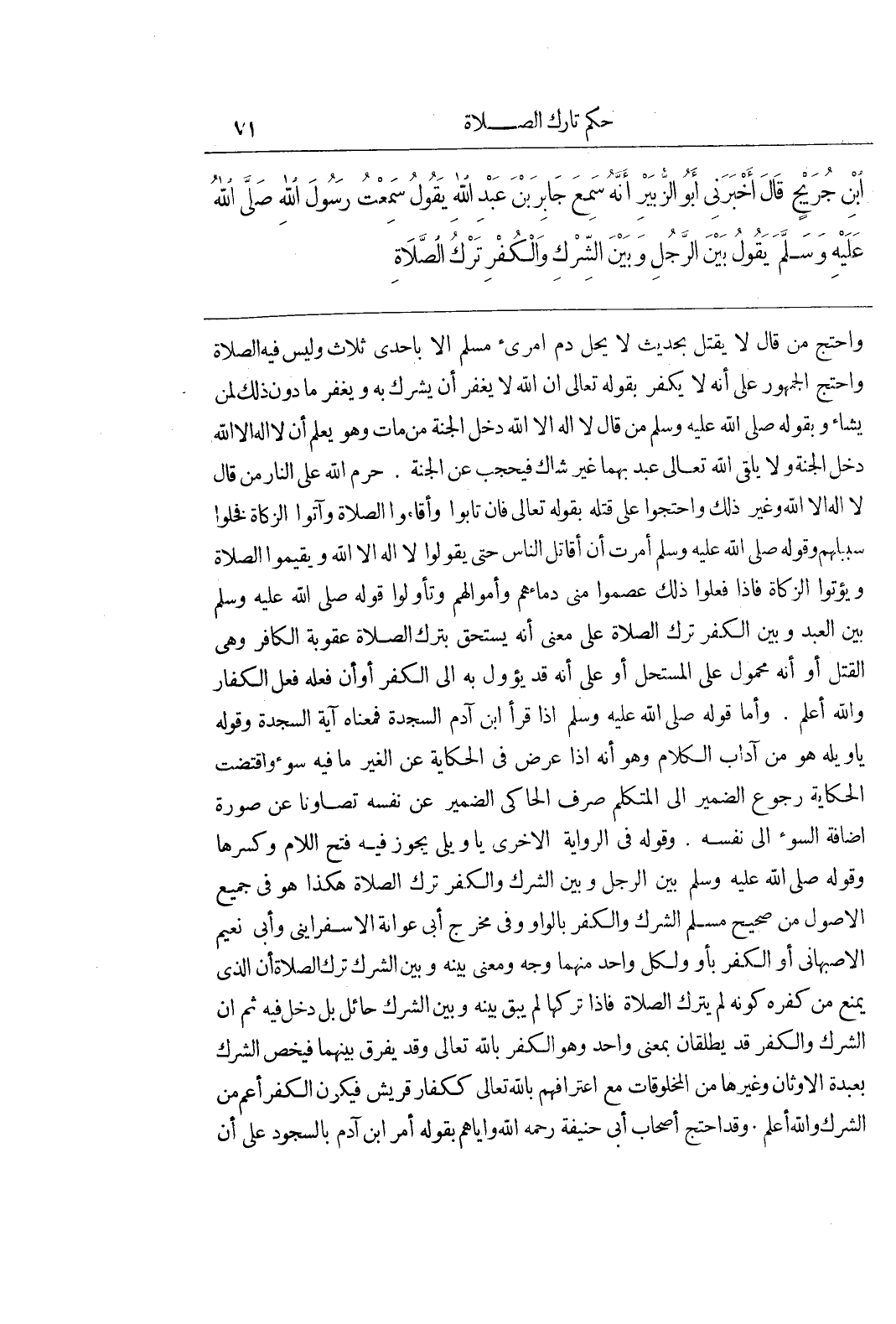 وَاحْتَجَّ مَنْ قَالَ لَا يُقْتَلُ بِحَدِيثِ لَا يَحِلُّ دَمِ امْرِئٍ مُسْلِمٍ إِلَّا بِإِحْدَى ثَلَاثٍ وَلَيْسَ فِيهِ الصَّلَاةُ وَاحْتَجَّ الْجُمْهُورُ عَلَى أَنَّهُ لَا يَكْفُرُ بِقَوْلِهِ تَعَالَى إِنَّ اللَّهَ لَا يَغْفِرُ أَنْ يُشْرَكَ بِهِ وَيَغْفِرُ مَا دُونَ ذلك لمن يشاء وَبِقَوْلِهِ صَلَّى اللَّهُ عَلَيْهِ وَسَلَّمَ مَنْ قَالَ لا إله الا الله دخل الجنة مَنْ مَاتَ وَهُوَ يَعْلَمُ أَنْ لَا إِلَهَ إِلَّا اللَّهُ دَخَلَ الْجَنَّةَ وَلَا يَلْقَى اللَّهَ تَعَالَى عَبْدٌ بِهِمَا غَيْرَ شَاكٍّ فَيُحْجَبُ عَنِ الْجَنَّةِ حَرَّمَ اللَّهُ عَلَى النَّارِ مَنْ قَالَ لَا إِلَهَ إِلَّا اللَّهُ وَغَيْرِ ذَلِكَ وَاحْتَجُّوا على قتله بقوله تعالى فإن تابوا وأقام الصلاة وآتوا الزكاة فخلوا سبيلهم وَقَوْلُهُ صَلَّى اللَّهُ عَلَيْهِ وَسَلَّمَ أُمِرْتُ أَنْ أُقَاتِلَ النَّاسَ حَتَّى يَقُولُوا لَا إِلَهَ إِلَّا اللَّهُ ويقيموا الصلاة ويؤتوا الزكاة فإذا فعلوا ذَلِكَ عَصَمُوا مِنِّي دِمَاءَهُمْ وَأَمْوَالَهُمْ وَتَأَوَّلُوا قَوْلَهُ صَلَّى اللَّهُ عَلَيْهِ وَسَلَّمَ بَيْنَ الْعَبْدِ وَبَيْنَ الْكُفْرِ تَرْكُ الصَّلَاةِ عَلَى مَعْنَى أَنَّهُ يَسْتَحِقُّ بِتَرْكِ الصَّلَاةِ عُقُوبَةَ الْكَافِرِ وَهِيَ الْقَتْلُ أَوْ أَنَّهُ مَحْمُولٌ عَلَى الْمُسْتَحِلِّ أَوْ عَلَى أَنَّهُ قد يؤول بِهِ إِلَى الْكُفْرِ أَوْ أَنَّ فِعْلَهُ فِعْلُ الْكُفَّارِ وَاللَّهُ أَعْلَمُ وَأَمَّا قَوْلُهُ صَلَّى اللَّهُ عَلَيْهِ وسلم اذا قرأ بن آدم السجدة فمعناه آية السجدة وقوله ياويله هُوَ مِنْ آدَابِ الْكَلَامِ وَهُوَ أَنَّهُ إِذَا عَرَضَ فِي الْحِكَايَةِ عَنِ الْغَيْرِ مَا فِيهِ سُوءٌ وَاقْتَضَتِ الْحِكَايَةُ رُجُوعَ الضَّمِيرِ إِلَى الْمُتَكَلِّمِ صَرَفَ الْحَاكِي الضَّمِيرَ عَنْ نَفْسِهِ تَصَاوُنًا عَنْ صُورَةِ إِضَافَةِ السُّوءِ إِلَى نَفْسِهِ وَقَوْلُهُ فِي الرِّوَايَةِ الْأُخْرَى يَا وَيْلِي يَجُوزُ فِيهِ فَتْحُ اللَّامِ وَكَسْرُهَا وقَوْلُهُ صَلَّى اللَّهُ عَلَيْهِ وَسَلَّمَ بين الرجل وبين الشرك والكفر ترك الصلاة هَكَذَا هُوَ فِي جَمِيعِ الْأُصُولِ مِنْ صَحِيحِ مُسْلِمٍ الشِّرْكُ وَالْكُفْرُ بِالْوَاوِ وَفِي مُخَرَّجِ أَبِي عوانة الاسفراينى وأبى نعيم الاصبهانى أوالكفر بِأَوْ وَلِكُلِّ وَاحِدٍ مِنْهُمَا وَجْهٌ وَمَعْنَى بَيْنَهُ وَبَيْنَ الشِّرْكِ تَرْكُ الصَّلَاةِ أَنَّ الَّذِي يَمْنَعُ مِنْ كُفْرِهِ كَوْنُهُ لَمْ يَتْرُكِ الصَّلَاةَ فَإِذَا تَرَكَهَا لَمْ يَبْقَ بَيْنَهُ وَبَيْنَ الشِّرْكِ حَائِلٌ بَلْ دَخَلَ فِيهِ ثُمَّ إِنَّ الشِّرْكَ وَالْكُفْرَ قَدْ يُطْلَقَانِ بِمَعْنًى وَاحِدٍ وَهُوَ الْكُفْرُ بِاللَّهِ تَعَالَى وَقَدْ يُفَرَّقُ بَيْنَهُمَا فَيُخَصُّ الشِّرْكُ بِعَبَدَةِ الْأَوْثَانِ وَغَيْرِهَا مِنَ الْمَخْلُوقَاتِ مَعَ اعْتِرَافِهِمْ بِاللَّهِ تَعَالَى كَكُفَّارِ قُرَيْشٍ فَيَكُونُ الْكُفْرُ أَعَمُّ مِنَ الشِّرْكِ وَاللَّهُ أَعْلَمُ وَقَدِ احْتَجَّ أَصْحَابُ أَبِي حنيفة رحمه الله واياهم بقوله أمر بن آدَمَ بِالسُّجُودِ عَلَى أَنَّ