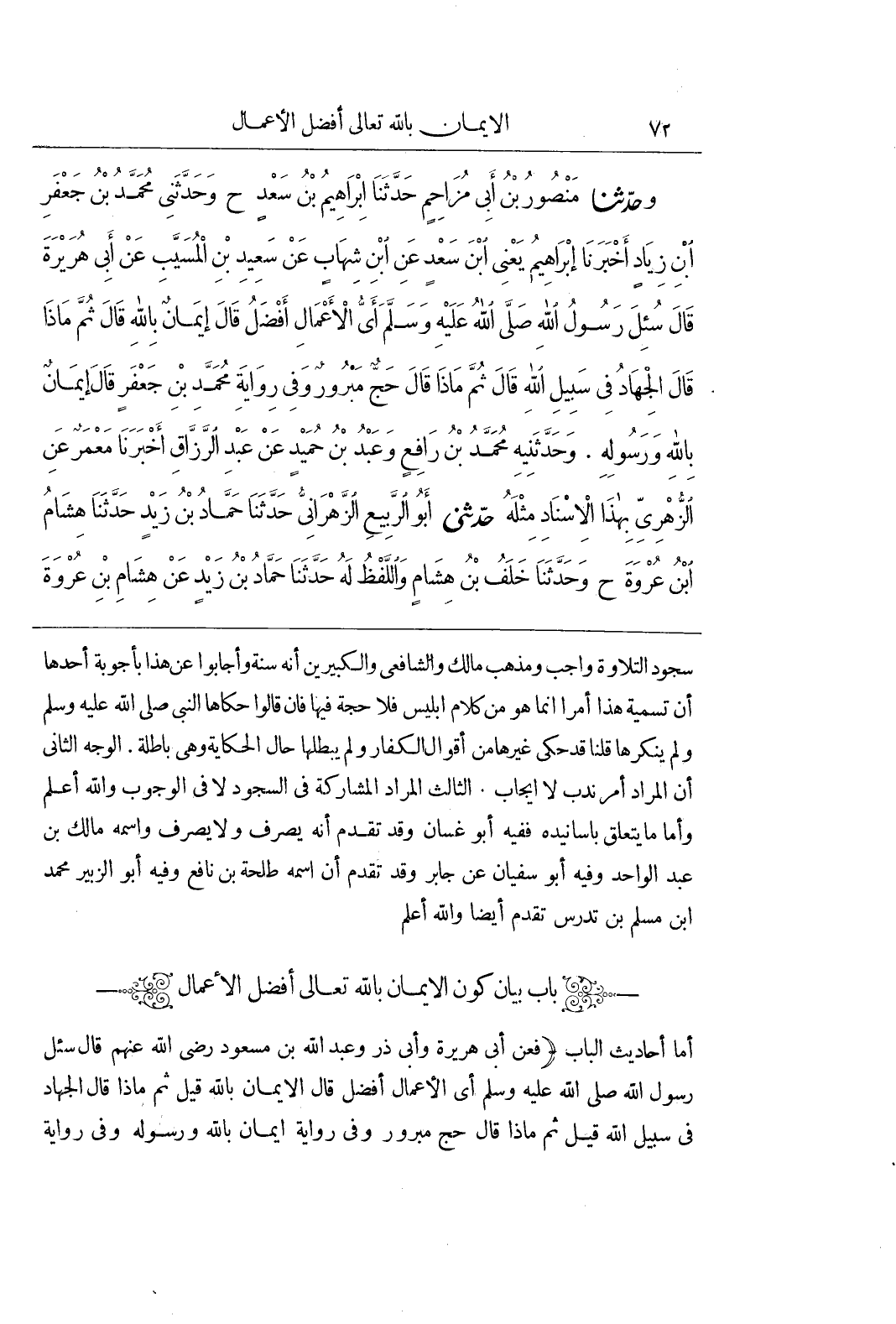 [83] أَمَّا أَحَادِيثُ الْبَابِ (فَعَنْ أَبِي هُرَيْرَةَ وَأَبِي ذَرٍّ وَعَبْدِ اللَّهِ بْنِ مَسْعُودٍ رَضِيَ اللَّهُ عَنْهُمْ قَالَ سُئِلَ رَسُولُ اللَّهِ صَلَّى اللَّهُ عَلَيْهِ وَسَلَّمَ أَيُّ الْأَعْمَالِ أَفْضَلُ قَالَ الْإِيمَانُ بِاللَّهِ قِيلَ ثُمَّ مَاذَا قَالَ الْجِهَادُ فِي سَبِيلِ اللَّهِ قِيلَ ثُمَّ مَاذَا قَالَ حَجٌّ مَبْرُورٌ وَفِي رِوَايَةٍ إِيمَانٌ بِاللَّهِ وَرَسُولِهِ وَفِي رِوَايَةٍ)