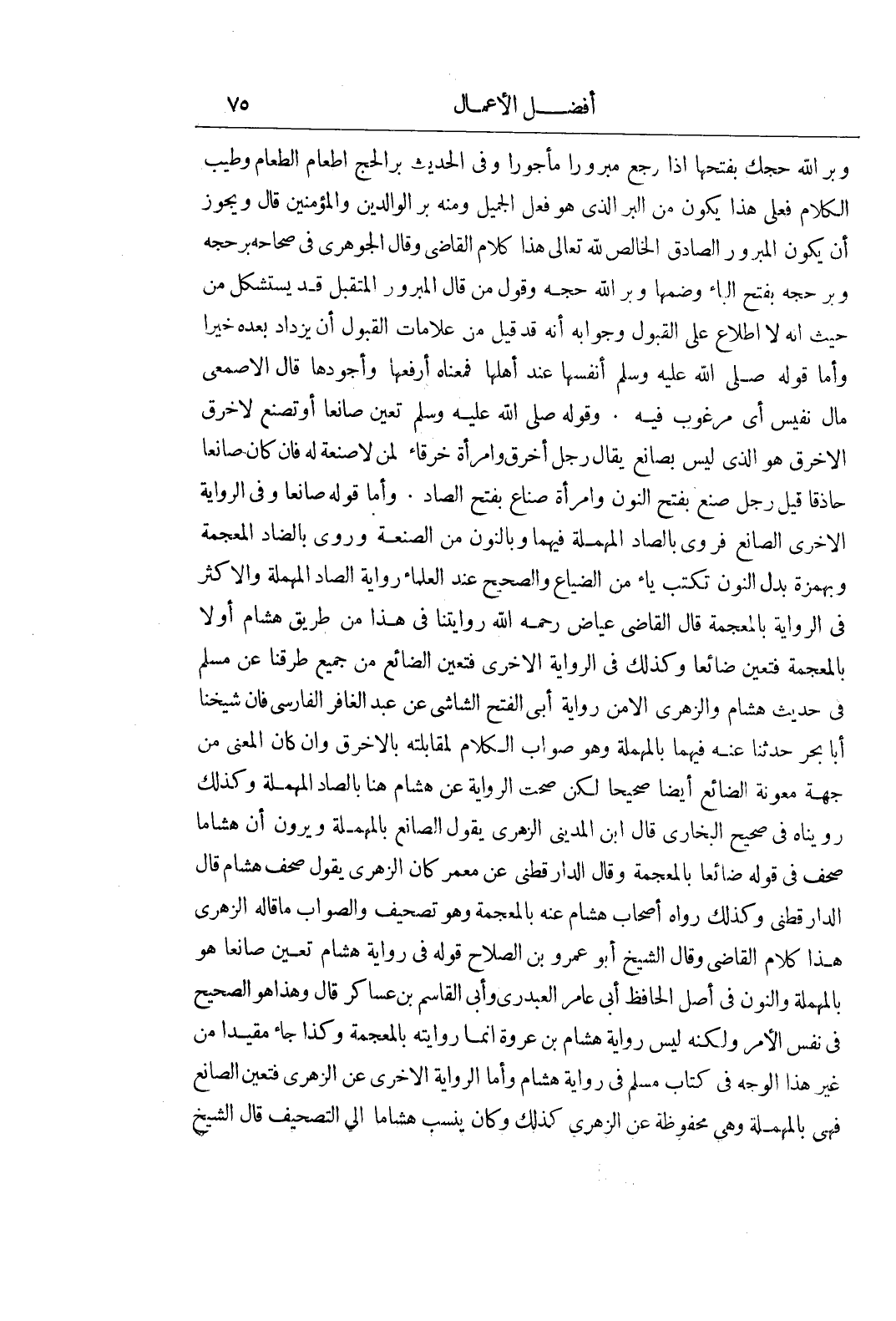 وَبَرَّ اللَّهُ حَجَّكَ بِفَتْحِهَا إِذَا رَجَعَ مَبْرُورًا مَأْجُورًا وَفِي الْحَدِيثِ بِرُّ الْحَجِّ إِطْعَامُ الطَّعَامِ وَطِيبُ الْكَلَامِ فَعَلَى هَذَا يَكُونُ مِنَ الْبِرِّ الَّذِي هُوَ فِعْلُ الْجَمِيلِ وَمِنْهُ بِرُّ الْوَالِدَيْنِ وَالْمُؤْمِنِينَ قَالَ وَيَجُوزُ أَنْ يَكُونَ الْمَبْرُورُ الصَّادِقُ الْخَالِصُ لِلَّهِ تَعَالَى هَذَا كَلَامُ الْقَاضِي وَقَالَ الْجَوْهَرِيُّ فِي صِحَاحِهِ بُرَّ حَجُّهُ وَبَرَّ حَجُّهُ بفتح الباء وضمها وبر الله حجه وقول من قال المبرور المتقبل قد يستشكل من حيث إِنَّهُ لَا اطِّلَاعَ عَلَى الْقَبُولِ وَجَوَابُهُ أَنَّهُ قَدْ قِيلَ مِنْ عَلَامَاتِ الْقَبُولِ أَنْ يَزْدَادَ بَعْدَهُ خَيْرًا وَأَمَّا قَوْلُهُ صَلَّى اللَّهُ عَلَيْهِ وَسَلَّمَ أَنْفَسُهَا عِنْدَ أَهْلِهَا فَمَعْنَاهُ أَرْفَعُهَا وَأَجْوَدُهَا قَالَ الْأَصْمَعِيُّ مَالٌ نَفِيسٌ أَيْ مَرْغُوبٌ فِيهِ وَقَوْلُهُ صَلَّى اللَّهُ عَلَيْهِ وَسَلَّمَ تُعِينُ صَانِعًا أَوْ تَصْنَعُ لِأَخْرَقَ الْأَخْرَقُ هُوَ الَّذِي لَيْسَ بِصَانِعٍ يُقَالُ رَجُلٌ أَخْرَقُ وَامْرَأَةٌ خَرْقَاءُ لِمَنْ لَا صَنْعَةَ لَهُ فَإِنْ كَانَ صَانِعًا حَاذِقًا قِيلَ رَجُلٌ صَنَعٌ بِفَتْحِ النُّونِ وَامْرَأَةٌ صَنَاعٌ بِفَتْحِ الصَّادِ وَأَمَّا قَوْلُهُ صَانِعًا وَفِي الرِّوَايَةِ الْأُخْرَى الصَّانِعُ فَرُوِيَ بِالصَّادِ الْمُهْمَلَةِ فِيهِمَا وَبِالنُّونِ مِنَ الصَّنْعَةِ وَرُوِيَ بِالضَّادِ الْمُعْجَمَةِ وَبِهَمْزَةٍ بَدَلَ النُّونِ تُكْتَبُ يَاءٌ مِنَ الضَّيَاعِ وَالصَّحِيحُ عِنْدَ الْعُلَمَاءِ رِوَايَةُ الصَّادِ الْمُهْمَلَةِ وَالْأَكْثَرُ فِي الرِّوَايَةِ بِالْمُعْجَمَةِ قَالَ الْقَاضِي عِيَاضٌ رَحِمَهُ اللَّهُ رِوَايَتُنَا فِي هَذَا مِنْ طَرِيقِ هِشَامٍ أَوَّلًا بِالْمُعْجَمَةِ فَتُعِينُ ضَائِعًا وَكَذَلِكَ فِي الرِّوَايَةِ الْأُخْرَى فَتُعِينُ الضَّائِعَ مِنْ جَمِيعِ طُرُقِنَا عَنْ مُسْلِمٍ فِي حَدِيثِ هِشَامٍ وَالزُّهْرِيِّ إِلَّا مِنْ رِوَايَةِ أَبِي الْفَتْحِ الشَّاشِيِّ عَنْ عَبْدِ الْغَافِرِ الْفَارِسِيِّ فَإِنَّ شَيْخَنَا أَبَا بَحْرٍ حَدَّثَنَا عَنْهُ فِيهِمَا بِالْمُهْمَلَةِ وَهُوَ صَوَابُ الْكَلَامِ لِمُقَابَلَتِهِ بِالْأَخْرَقِ وَإِنْ كَانَ الْمَعْنَى مِنْ جِهَةِ مَعُونَةِ الضَّائِعِ أَيْضًا صَحِيحًا لَكِنْ صَحَّتِ الرِّوَايَةُ عَنْ هِشَامٍ هُنَا بِالصَّادِ الْمُهْمَلَةِ وَكَذَلِكَ رُوِّينَاهُ فِي صَحِيحِ الْبُخَارِيِّ قَالَ بن الْمَدِينِيِّ الزُّهْرِيُّ يَقُولُ الصَّانِعُ بِالْمُهْمَلَةِ وَيَرَوْنَ أَنَّ هِشَامًا صَحَّفَ فِي قَوْلِهِ ضَائِعًا بِالْمُعْجَمَةِ وَقَالَ الدَّارَقُطْنِيُّ عَنْ مَعْمَرٍ كَانَ الزُّهْرِيُّ يَقُولُ صَحَّفَ هشام قال الدار قطنى وَكَذَلِكَ رَوَاهُ أَصْحَابُ هِشَامٍ عَنْهُ بِالْمُعْجَمَةِ وَهُوَ تَصْحِيفٌ وَالصَّوَابُ مَا قَالَهُ الزُّهْرِيُّ هَذَا كَلَامُ القاضي وقال الشيخ أبوعمرو بْنُ الصَّلَاحِ قَوْلُهُ فِي رِوَايَةِ هِشَامٍ تُعِينُ صَانِعًا هُوَ بِالْمُهْمَلَةِ وَالنُّونُ فِي أَصْلِ الْحَافِظِ أَبِي عَامِرٍ الْعَبْدَرِيِّ وَأَبِي الْقَاسِمِ بْنِ عَسَاكِرَ قَالَ وَهَذَا هُوَ الصَّحِيحُ فِي نَفْسِ الْأَمْرِ وَلَكِنَّهُ لَيْسَ رِوَايَةُ هِشَامِ بْنِ عُرْوَةَ إِنَّمَا رِوَايَتُهُ بِالْمُعْجَمَةِ وَكَذَا جَاءَ مُقَيَّدًا مِنْ غَيْرِ هَذَا الْوَجْهِ فِي كِتَابِ مُسْلِمٍ فِي رِوَايَةِ هِشَامٍ وَأَمَّا الرِّوَايَةُ الْأُخْرَى عَنِ الزُّهْرِيِّ فَتُعِينُ الصَّانِعَ فَهِيَ بِالْمُهْمَلَةِ وَهِيَ مَحْفُوظَةٌ عَنِ الزُّهْرِيِّ كَذَلِكَ وَكَانَ يَنْسُبُ هِشَامًا إِلَى التَّصْحِيفِ قَالَ الشيخ