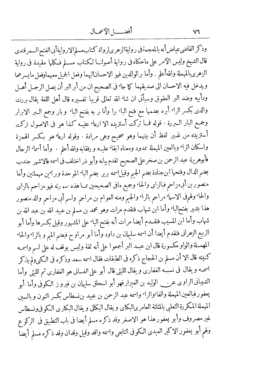 وَذَكَرَ الْقَاضِي عِيَاضٌ أَنَّهُ بِالْمُعْجَمَةِ فِي رِوَايَةِ الزُّهْرِيِّ لِرُوَاةِ كِتَابِ مُسْلِمٍ إِلَّا رِوَايَةَ أَبِي الْفَتْحِ السَّمَرْقَنْدِيِّ قَالَ الشَّيْخُ وَلَيْسَ الْأَمْرُ عَلَى مَا حَكَاهُ فِي رِوَايَةِ أُصُولِنَا لِكِتَابِ مُسْلِمٍ فكلها مقيدة فى رواية الزهري بالمهملة وَاللَّهُ أَعْلَمُ وَأَمَّا بِرُّ الْوَالِدَيْنِ فَهُوَ الْإِحْسَانُ اليهما وَفِعْلُ الْجَمِيلِ مَعَهُمَا وَفِعْلُ مَا يَسُرُّهُمَا وَيَدْخُلُ فِيهِ الْإِحْسَانُ إِلَى صَدِيقِهِمَا كَمَا جَاءَ فِي الصَّحِيحِ إِنَّ مِنْ أَبَرِّ الْبِرِّ أَنْ يَصِلَ الرَّجُلُ أَهْلَ وُدِّ أَبِيهِ وَضِدُّ الْبِرِّ الْعُقُوقِ وَسَيَأْتِي إِنْ شَاءَ اللَّهُ تَعَالَى قَرِيبًا تَفْسِيرُهُ قَالَ أَهْلُ اللُّغَةِ يُقَالُ بَرِرْتُ وَالِدِي بِكَسْرِ الرَّاءِ أَبَرُّهُ بِضَمِّهَا مَعَ فَتْحِ الْبَاءِ بِرًّا وَأَنَا بَرٌّ بِهِ بِفَتْحِ الْبَاءِ وَبَارٌّ وَجَمْعُ الْبَرِّ الْأَبْرَارُ وَجَمْعُ الْبَارِّ الْبَرَرَةُ قَوْلُهُ فَمَا تَرَكْتُ أَسْتَزِيدُهُ إِلَّا إِرْعَاءً عَلَيْهِ كَذَا هُوَ فِي الْأُصُولِ تَرَكْتُ أَسْتَزِيدُهُ مِنْ غَيْرِ لَفْظِ أَنْ بَيْنَهُمَا وَهُوَ صَحِيحٌ وَهِيَ مُرَادَةٌ وَقَوْلُهُ إِرْعَاءً هُوَ بِكَسْرِ الْهَمْزَةِ وَإِسْكَانِ الرَّاءِ وَبِالْعَيْنِ الْمُهْمَلَةِ مَمْدُودٌ وَمَعْنَاهُ إِبْقَاءً عَلَيْهِ وَرِفْقًا بِهِ وَاللَّهُ أَعْلَمُ وَأَمَّا أَسْمَاءُ الرِّجَالِ فَأَبُو هُرَيْرَةَ عَبْدُ الرَّحْمَنِ بْنُ صَخْرٍ عَلَى الصَّحِيحِ تَقَدَّمَ بَيَانُهُ وَأَبُو ذَرٍّ اخْتُلِفَ فِي اسْمِهِ فَالْأَشْهَرُ جندب بضم الدال وفتحها بن جُنَادَةَ بِضَمِّ الْجِيمِ وَقِيلَ اسْمُهُ بُرَيْرٌ بِضَمِّ الْبَاءِ الْمُوَحَّدَةِ وَبِرَاءَيْنِ مُهْمَلَتَيْنِ وَأَمَّا مَنْصُورُ بْنُ أَبِي مُزَاحِمٍ فَبِالزَّايِ وَالْحَاءِ وَجَمِيعُ مَا فِي الصَّحِيحَيْنِ مِمَّا هَذِهِ صُورَتُهُ فَهُوَ مُزَاحِمٌ بِالزَّايِ والحاء ولهم فى الاسماء مراجم بالراء والجيم وَمِنْهُ الْعَوَّامُ بْنُ مُرَاجِمٍ وَاسْمُ أَبِي مُزَاحِمٍ وَالِدُ مَنْصُورٍ هَذَا بَشِيرٌ بِفَتْحِ الْبَاءِ وَأَمَّا بن شهاب فتقدم مرات وَهُوَ مُحَمَّدُ بْنُ مُسْلِمِ بْنِ عُبَيْدِ اللَّهِ بن عبد الله بن شهاب وأما بن الْمُسَيَّبِ فَتَقَدَّمَ أَيْضًا مَرَّاتٍ أَنَّهُ بِفَتْحِ الْيَاءِ عَلَى الْمَشْهُورِ وَقِيلَ بِكَسْرِهَا وَأَمَّا أَبُو الرَّبِيعِ الزَّهْرَانِيُّ فَتَقَدَّمَ أَيْضًا أَنَّ اسْمَهُ سُلَيْمَانُ بْنُ دَاوُدَ وَأَمَّا أَبُو مُرَاوِحٍ فَبِضَمِّ الْمِيمِ وَبِالرَّاءِ والحاء المهملة والواو مكسورة قال بن عَبْدِ الْبَرِّ أَجْمَعُوا عَلَى أَنَّهُ ثِقَةٌ وَلَيْسَ يُوقَفُ لَهُ عَلَى اسْمٍ وَاسْمُهُ كُنْيَتُهُ قَالَ إِلَّا أَنَّ مُسْلِمَ بْنَ الْحَجَّاجِ ذَكَرَهُ فِي الطَّبَقَاتِ فَقَالَ اسْمُهُ سَعْدٌ وَذَكَرَهُ فِي الْكُنَى وَلَمْ يَذْكُرِ اسْمَهُ وَيُقَالُ فِي نَسَبِهِ الْغِفَارِيُّ ويقال الليثى قال أبو على الغسانى هوالغفارى ثُمَّ اللَّيْثِيُّ وَأَمَّا الشَّيْبَانِيُّ الرَّاوِي عَنِ الْوَلِيدِ بن العيزار فهو أبواسحاق سُلَيْمَانُ بْنُ فَيْرُوزَ الْكُوفِيُّ وَأَمَّا أَبُو يَعْفُورٍ فَبِالْعَيْنِ الْمُهْمَلَةِ وَالْفَاءِ وَالرَّاءِ وَاسْمُهُ عَبْدُ الرَّحْمَنِ بْنُ عُبَيْدِ بْنِ نِسْطَاسَ بِكَسْرِ النُّونِ وَبِالسِّينِ الْمُهْمَلَةِ الْمُكَرَّرَةِ الثَّعْلَبِيُّ بِالْمُثَلَّثَةِ الْعَامِرِيُّ الْبَكَّايُ وَيُقَالُ الْبَكَالِيُّ وَيُقَالُ الْبَكَّارِيُّ الْكُوفِيُّ وَنِسْطَاسُ غَيْرُ مَصْرُوفٍ وَأَبُو يَعْفُورٍ هَذَا هُوَ الْأَصْغَرُ وَقَدْ ذَكَرَهُ مُسْلِمٌ أَيْضًا فِي بَابِ التَّطْبِيقِ فِي الرُّكُوعِ وَلَهُمْ أَبُو يَعْفُو