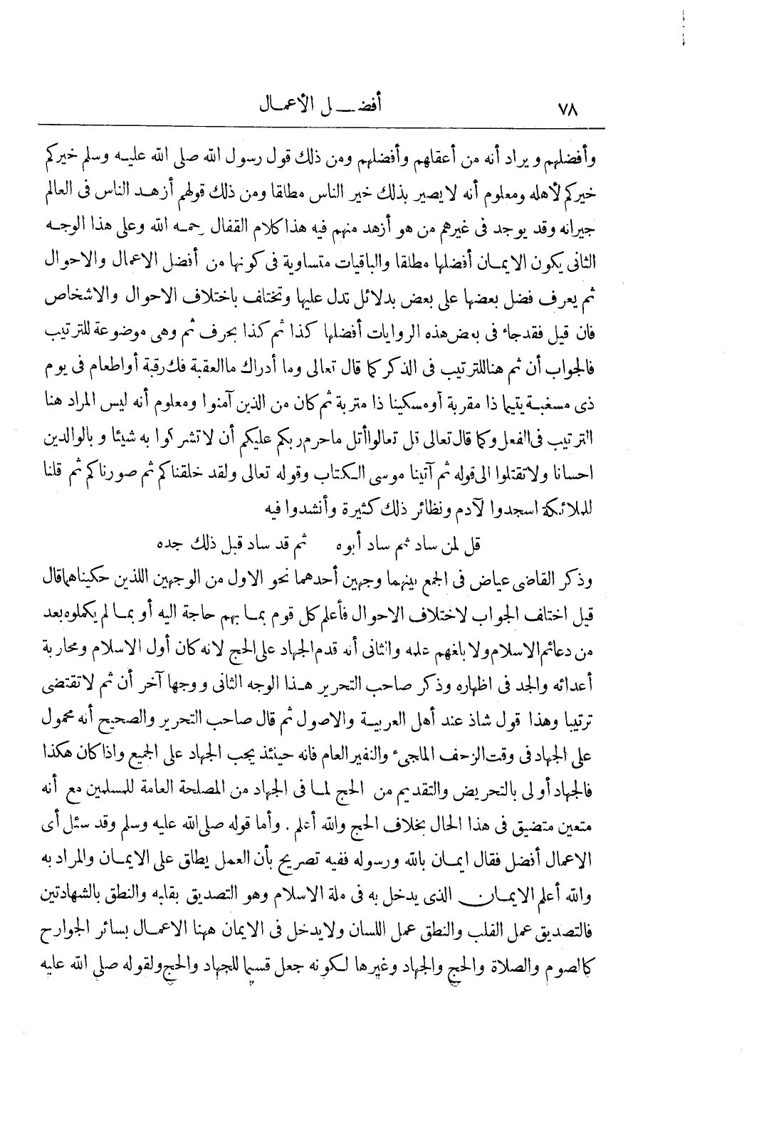 وَأَفْضَلُهُمْ وَيُرَادُ أَنَّهُ مِنْ أَعْقَلِهِمْ وَأَفْضَلِهِمْ وَمَنْ ذَلِكَ قَوْلُ رَسُولِ اللَّهِ صَلَّى اللَّهُ عَلَيْهِ وَسَلَّمَ خَيْرُكُمْ خَيْرُكُمْ لِأَهْلِهِ وَمَعْلُومٌ أَنَّهُ لَا يَصِيرُ بِذَلِكَ خِيرَ النَّاسِ مُطْلَقًا وَمِنْ ذَلِكَ قَوْلُهُمْ أَزْهَدُ النَّاسِ فِي الْعَالِمِ جِيرَانُهُ وَقَدْ يُوجَدُ فِي غَيْرِهِمْ مَنْ هُوَ أَزْهَدُ مِنْهُمْ فِيهِ هَذَا كَلَامُ الْقَفَّالِ رَحِمَهُ اللَّهُ وَعَلَى هَذَا الْوَجْهِ الثَّانِي يَكُونُ الْإِيمَانُ أَفْضَلَهَا مُطْلَقًا وَالْبَاقِيَاتُ مُتَسَاوِيَةٌ فِي كَوْنِهَا مِنْ أَفْضَلِ الْأَعْمَالِ وَالْأَحْوَالِ ثُمَّ يُعْرَفُ فَضْلُ بَعْضِهَا عَلَى بَعْضٍ بِدَلَائِلَ تَدُلُّ عَلَيْهَا وَتَخْتَلِفُ بِاخْتِلَافِ الْأَحْوَالِ وَالْأَشْخَاصِ فَإِنْ قِيلَ فَقَدْ جَاءَ فِي بَعْضِ هَذِهِ الرِّوَايَاتِ أَفْضَلُهَا كَذَا ثُمَّ كَذَا بِحَرْفٍ ثُمَّ وَهِيَ مَوْضُوعَةٌ لِلتَّرْتِيبِ فَالْجَوَابُ أَنَّ ثُمَّ هُنَا لِلتَّرْتِيبِ فِي الذِّكْرِ كَمَا قَالَ تَعَالَى وَمَا أَدْرَاكَ مَا الْعَقَبَةُ فَكُّ رَقَبَةٍ أَوْ إِطْعَامٌ فِي يَوْمٍ ذِي مَسْغَبَةٍ يَتِيمًا ذَا مَقْرَبَةٍ أَوْ مِسْكِينًا ذَا مَتْرَبَةٍ ثُمَّ كَانَ مِنَ الذين آمنوا وَمَعْلُومٌ أَنَّهُ لَيْسَ الْمُرَادُ هُنَا التَّرْتِيبُ فِي الْفِعْلِ وَكَمَا قَالَ تَعَالَى قُلْ تَعَالَوْا أَتْلُ ما حرم ربكم عليكم ان لا تُشْرِكُوا بِهِ شَيْئًا وَبِالْوَالِدَيْنِ إِحْسَانًا وَلَا تَقْتُلُوا إلى قوله ثم آتينا موسى الكتاب وَقَوْلُهُ تَعَالَى وَلَقَدْ خَلَقْنَاكُمْ ثُمَّ صَوَّرْنَاكُمْ ثُمَّ قلنا للملائكة اسجدوا لآدم وَنَظَائِرُ ذَلِكَ كَثِيرَةٌ وَأَنْشَدُوا فِيهِ ... قُلْ لِمَنْ سَادَ ثُمَّ سَادَ أَبُوهُ ... ثُمَّ قَدْ سَادَ قَبْلَ ذَلِكَ جَدُّهُ ...