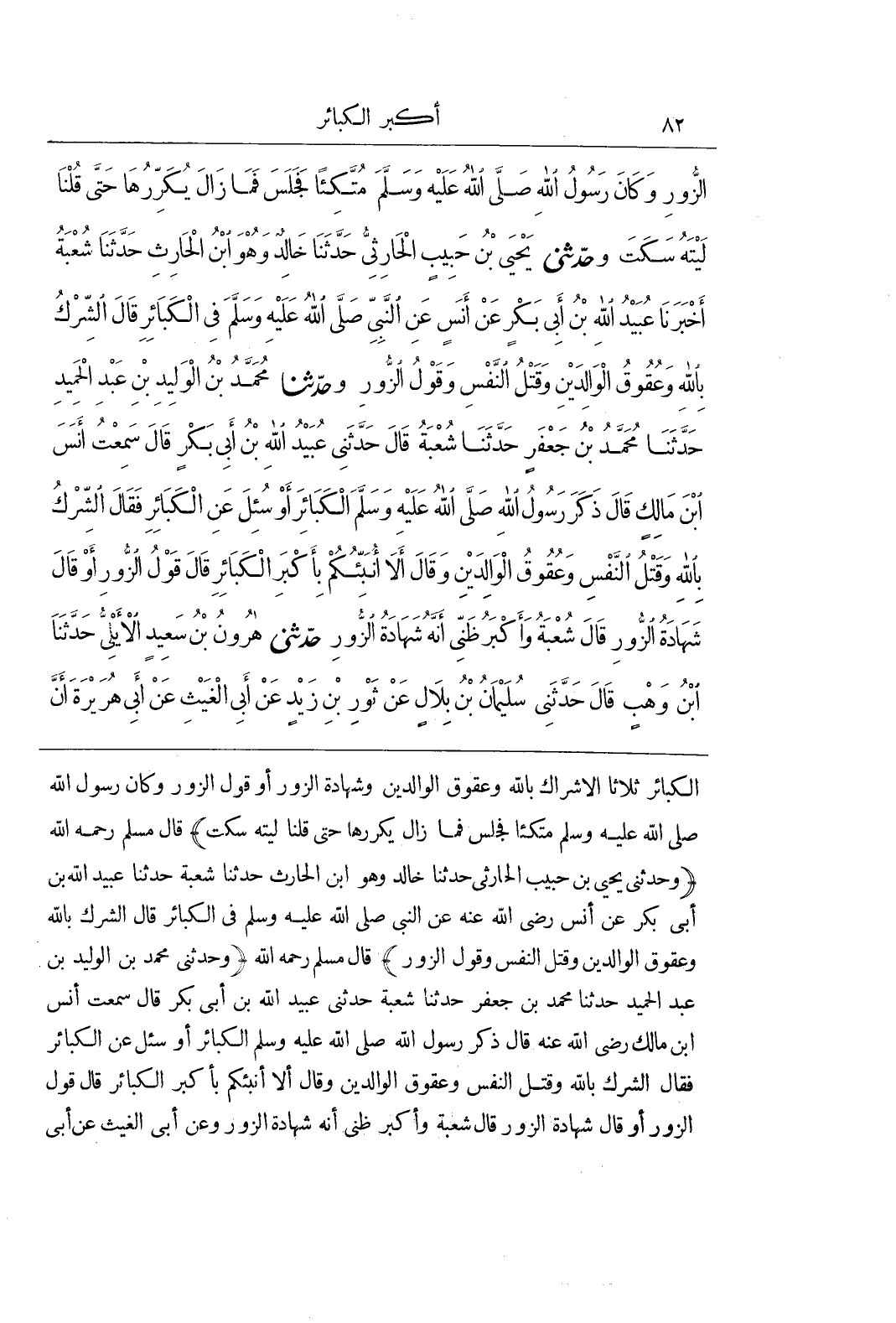 [88] (وَحَدَّثَنِي يَحْيَى بْنُ حَبِيبٍ الْحَارِثِيُّ حَدَّثَنَا خَالِدٌ وَهُوَ بن الْحَارِثِ حَدَّثَنَا شُعْبَةُ حَدَّثَنَا عُبَيْدُ اللَّهِ بْنُ أَبِي بَكْرٍ عَنْ أَنَسٍ رَضِيَ اللَّهُ عَنْهُ عَنِ النَّبِيِّ صَلَّى اللَّهُ عَلَيْهِ وَسَلَّمَ فِي الْكَبَائِرِ قَالَ الشِّرْكُ بِاللَّهِ وَعُقُوقُ الْوَالِدَيْنِ وَقَتْلُ النَّفْسِ وَقَوْلُ الزُّورِ) قَالَ مُسْلِمٌ رَحِمَهُ اللَّهُ (وحدثنى مُحَمَّدُ بْنُ الْوَلِيدِ بْنِ عَبْدِ الْحَمِيدِ حَدَّثَنَا محمد بن جعفر حدثنا شعبة حدثنى عبيد اللَّهِ بْنُ أَبِي بَكْرٍ قَالَ سَمِعْتُ أَنَسَ بْنَ مَالِكٍ رَضِيَ اللَّهُ عَنْهُ قَالَ ذَكَرَ رَسُولُ اللَّهِ صَلَّى اللَّهُ عَلَيْهِ وَسَلَّمَ الْكَبَائِرَ أَوْ سُئِلَ عَنِ الْكَبَائِرِ فَقَالَ الشِّرْكُ بِاللَّهِ وَقَتْلُ النَّفْسِ وَعُقُوقُ الْوَالِدَيْنِ وَقَالَ أَلَا أُنَبِّئكُمْ بأكبر الكبائر قال قول الزُّورُ أَوْ قَالَ شَهَادَةُ الزُّورِ قَالَ شُعْبَةُ وَأَكْبَرُ ظَنِّيَ أَنَّهُ شَهَادَةُ الزُّورِ