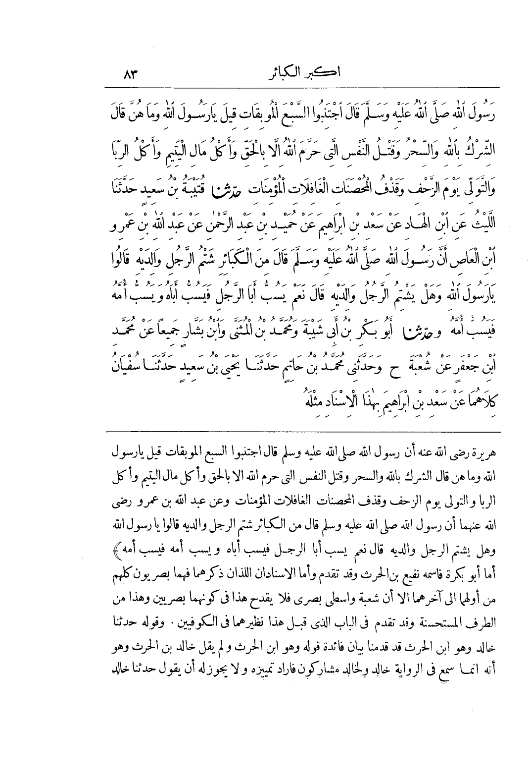 هُرَيْرَةَ رَضِيَ اللَّهُ عَنْهُ أَنَّ رَسُولَ اللَّهِ صَلَّى اللَّهُ عَلَيْهِ وَسَلَّمَ قَالَ اجْتَنِبُوا السَّبْعَ الْمُوبِقَاتِ قِيلَ يَا رَسُولَ اللَّهِ وَمَا هُنَّ قَالَ الشِّرْكُ بِاللَّهِ وَالسِّحْرُ وَقَتْلُ النَّفْسِ الَّتِي حَرَّمَ اللَّهُ إِلَّا بِالْحَقِّ وَأَكْلُ مَالِ الْيَتِيمِ وَأَكْلُ الرِّبَا وَالتَّوَلِّي يَوْمَ الزَّحْفِ وَقَذْفُ الْمُحْصَنَاتِ الْغَافِلَاتِ الْمُؤْمِنَاتِ وَعَنْ عَبْدِ اللَّهِ بْنِ عَمْرٍو رَضِيَ اللَّهُ عَنْهُمَا أَنَّ رَسُولَ اللَّهِ صَلَّى اللَّهُ عَلَيْهِ وَسَلَّمَ قَالَ مِنَ الْكَبَائِرِ شَتْمُ الرَّجُلِ وَالِدَيْهِ قَالُوا يَا رَسُولَ اللَّهِ وَهَلْ يَشْتُمُ الرَّجُلُ وَالِدَيْهِ قَالَ نَعَمْ يَسُبُّ أَبَا الرَّجُلِ فَيَسُبُّ أَبَاهُ وَيَسُبُّ أُمَّهُ فَيَسُبُّ أُمَّهُ) أما أبو بكرة فاسمه نفيع بن الحرث وَقَدْ تَقَدَّمَ وَأَمَّا الْإِسْنَادَانِ الَّلذِانِ ذَكَرَهُمَا فَهُمْا بصريون كلهم من أولهما إلى آخرهما إِلَّا أَنَّ شُعْبَةَ وَاسِطِيٌّ بَصْرِيٌّ فَلَا يَقْدَحُ هذا فى كونهما بَصْرِيِّينَ وَهَذَا مِنَ الطُّرَفِ الْمُسْتَحْسَنَةِ وَقَدْ تَقَدَّمَ فِي الْبَابِ الَّذِي قَبْلَ هَذَا نَظِيرُهُمْا فِي الكوفيين وقوله حدثنا خالد وهو بن الحرث قد قدمنا بيان فائدة قوله وهو بن الحرث ولم يقل خالد بن الحرث وَهُوَ أَنَّهُ إِنَّمَا سَمِعَ فِي الرِّوَايَةِ خَالِدَ وَلِخَالِدٍ مُشَارِكُونَ فَأَرَادَ تَمْيِيزَهُ وَلَا يَجُوزُ لَهُ أن يقول حدثنا خالد