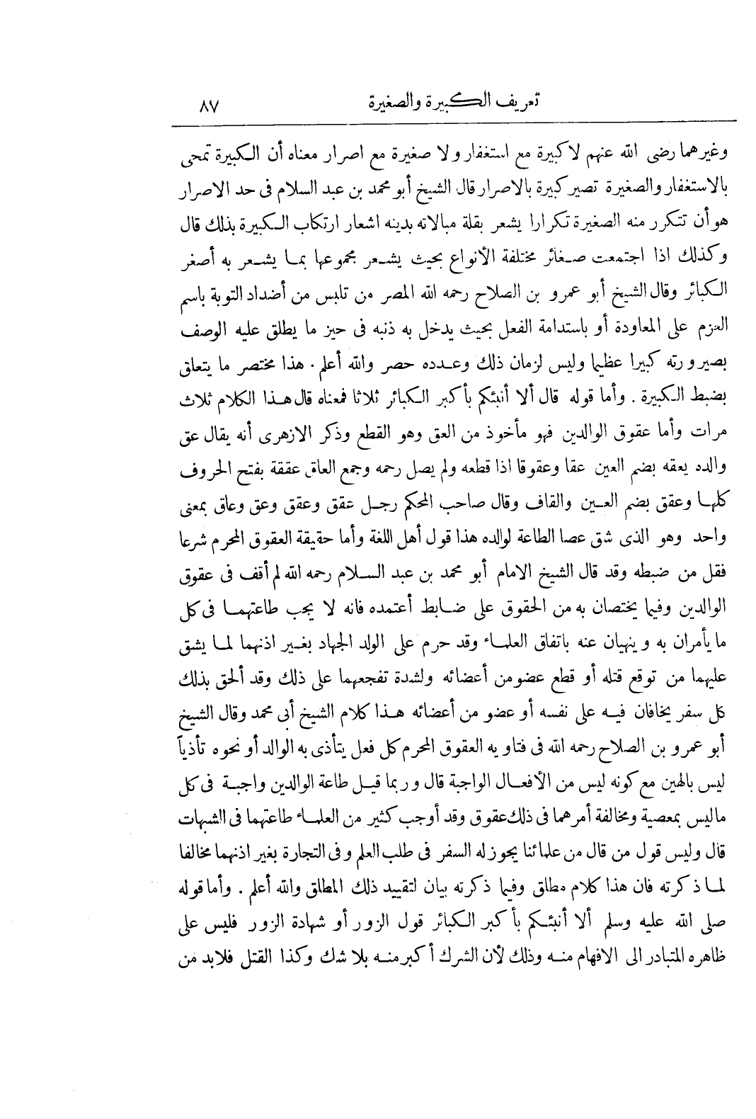 وَغَيْرِهِمَا رَضِيَ اللَّهُ عَنْهُمْ لَا كَبِيرَةَ مَعَ اسْتِغْفَارٍ وَلَا صَغِيرَةَ مَعَ إِصْرَارٍ مَعْنَاهُ أَنَّ الْكَبِيرَةَ تُمْحَى بِالِاسْتِغْفَارِ وَالصَّغِيرَةَ تَصِيرُ كَبِيرَةً بِالْإِصْرَارِ قَالَ الشَّيْخُ أَبُو مُحَمَّدِ بْنُ عَبْدِ السَّلَامِ فِي حَدِّ الْإِصْرَارِ هُوَ أَنْ تَتَكَرَّرَ مِنْهُ الصَّغِيرَةُ تَكْرَارًا يُشْعِرُ بِقِلَّةِ مُبَالَاتِهِ بِدِينِهِ إِشْعَارَ ارْتِكَابِ الْكَبِيرَةِ بِذَلِكَ قَالَ وَكَذَلِكَ إِذَا اجْتَمَعَتْ صَغَائِرُ مُخْتَلِفَةُ الْأَنْوَاعِ بِحَيْثُ يُشْعِرُ مَجْمُوعُهَا بِمَا يُشْعِرُ بِهِ أَصْغَرُ الْكَبَائِرِ وَقَالَ الشَّيْخُ أَبُو عَمْرِو بْنُ الصَّلَاحِ رَحِمَهُ اللَّهُ الْمُصِرُّ مَنْ تَلَبَّسَ مِنْ أَضْدَادِ التَّوْبَةِ بِاسْمِ الْعَزْمِ عَلَى الْمُعَاوَدَةِ أَوْ بِاسْتِدَامَةِ الْفِعْلِ بِحَيْثُ يَدْخُلُ بِهِ ذَنْبُهُ فِي حَيِّزِ مَا يُطْلَقُ عَلَيْهِ الْوَصْفُ بِصَيْرُورَتِهِ كَبِيرًا عَظِيمًا وَلَيْسَ لِزَمَانِ ذَلِكَ وَعَدَدِهِ حَصْرٌ وَاللَّهُ أَعْلَمُ هَذَا مُخْتَصَرُ مَا يَتَعَلَّقُ بِضَبْطِ الْكَبِيرَةِ وَأَمَّا قَوْلُهُ قَالَ أَلَا أُنَبِّئكُمْ بِأَكْبَرِ الْكَبَائِرِ ثَلَاثًا فَمَعْنَاهُ قَالَ هَذَا الْكَلَامُ ثَلَاثَ مَرَّاتٍ وَأَمَّا عُقُوقُ الْوَالِدَيْنِ فَهُوَ مَأْخُوذٌ مِنْ الْعَقِّ وَهُوَ الْقَطْعُ وَذَكَرَ الْأَزْهَرِيُّ أَنَّهُ يُقَالُ عَقَّ وَالِدَهُ يَعُقُّهُ بِضَمِّ الْعَيْنِ عَقًّا وَعُقُوقًا إِذَا قَطَعَهُ وَلَمْ يَصِلُ رَحِمَهُ وَجَمْعُ العاق عققة بفتح الحروف كلها وعقق بِضَمِّ الْعَيْنِ وَالْقَافِ وَقَالَ صَاحِبُ الْمُحْكَمِ رَجُلٌ عُقُقٌ وَعَقَقٌ وَعَقٌّ وَعَاقٌّ بِمَعْنًى وَاحِدٍ وَهُوَ الَّذِي شَقَّ عَصَا الطَّاعَةِ لِوَالِدِهِ هَذَا قَوْلُ أَهْلِ اللُّغَةِ وَأَمَّا حَقِيقَةُ الْعُقُوقِ الْمُحَرَّمِ شَرْعًا فَقَلَّ مَنْ ضَبَطَهُ وَقَدْ قَالَ الشَّيْخُ الْإِمَامُ أَبُو مُحَمَّدِ بْنُ عَبْدِ السَّلَامِ رَحِمَهُ اللَّهُ لَمْ أَقِفْ فِي عُقُوقِ الْوَالِدَيْنِ وَفِيمَا يَخْتَصَّانِ بِهِ مِنَ الْحُقُوقِ عَلَى ضَابِطٍ أَعْتَمِدهُ فَإِنَّهُ لَا يَجِبُ طَاعَتهُمَا فِي كُلِّ مَا يَأْمُرَانِ بِهِ وَيَنْهَيَانِ عَنْهُ بِاتِّفَاقِ الْعُلَمَاءِ وَقَدْ حَرُمَ على الولد الجهاد بغير اذنهما لما يشق عَلَيْهِمَا مِنْ تَوَقُّعِ قَتْلِهِ أَوْ قَطْعِ عُضْوٍ مِنْ أَعْضَائِهِ وَلِشِدَّةِ تَفَجُّعِهِمَا عَلَى ذَلِكَ وَقَدْ أُلْحِقَ بِذَلِكَ كُلُّ سَفَرٍ يَخَافَانِ فِيهِ عَلَى نَفْسِهِ أَوْ عُضْوٍ مِنْ أَعْضَائِهِ هَذَا كَلَامُ الشيخ أبى محمد وَقَالَ الشَّيْخُ أَبُو عَمْرِو بْنُ الصَّلَاحِ رَحِمَهُ اللَّهُ فِي فَتَاوِيهِ الْعُقُوقُ الْمُحَرَّمُ كُلُّ فِعْلٍ يَتَأَذَّى بِهِ الْوَالِدُ أَوْ نَحْوُهُ تَأَذِّيًا لَيْسَ بِالْهَيِّنِ مَعَ كَوْنِهِ لَيْسَ مِنَ الْأَفْعَالِ الْوَاجِبَةِ قَالَ وَرُبَّمَا قِيلَ طَاعَةُ الْوَالِدَيْنِ وَاجِبَةٌ فِي كُلِّ مَا لَيْسَ بِمَعْصِيَةٍ وَمُخَالَفَةُ أَمْرِهِمَا فِي ذَلِكَ عُقُوقٌ وَقَدْ أَوْجَبَ كَثِيرٌ مِنَ الْعُلَمَاءِ طَاعَتُهُمَا فِي الشُّبُهَاتِ قَالَ وَلَيْسَ قَوْلُ مَنْ قَالَ مِنْ عُلَمَائِنَا يَجُوزُ لَهُ السَّفَرُ فِي طَلَبِ الْعِلْمِ وَفِي التِّجَارَةِ بِغَيْرِ إِذْنِهِمَا مُخَالِفًا لِمَا ذَكَرْتُهُ فَإِنَّ هَذَا كَلَامٌ مُطْلَقٌ وَفِيمَا ذَكَرْتُهُ بَيَانٌ لِتَقْيِيدِ ذَلِكَ الْمُطْلَقِ وَاللَّهُ أَعْلَمُ وَأَمَّا قَوْلُهُ صَلَّى اللَّهُ عَلَيْهِ وَسَلَّمَ أَلَا أُنَبِّئُكُمْ بِأَكْبَرِ الْكَبَائِرِ قَوْلُ الزُّورِ أَوْ شَهَادَةُ الزُّورِ فَلَيْسَ عَلَى ظَاهِرِهِ الْمُتَبَادَرِ إِلَى الْأَفْهَامِ مِنْهُ وَذَلِكَ لِأَنَّ الشِّرْكَ 