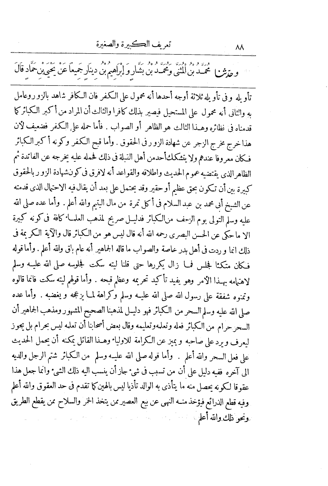 تَأْوِيلِهِ وَفِي تَأْوِيلِهِ ثَلَاثَةُ أَوْجُهٍ أَحَدُهَا أَنَّهُ مَحْمُولٌ عَلَى الْكُفْرِ فَإِنَّ الْكَافِرَ شَاهِدٌ بِالزُّورِ وعامل به والثانى أنه محمول على المستحيل فَيَصِيرُ بِذَلِكَ كَافِرًا وَالثَّالِثُ أَنَّ الْمُرَادَ مِنْ أَكْبَرِ الْكَبَائِرِ كَمَا قَدَّمْنَاهُ فِي نَظَائِرِهِ وَهَذَا الثَّالِثُ هُوَ الظَّاهِرُ أَوِ الصَّوَابُ فَأَمَّا حَمْلُهُ عَلَى الْكُفْرِ فَضَعِيفٌ لِأَنَّ هَذَا خَرَجَ مَخْرَجَ الزَّجْرِ عَنْ شَهَادَةِ الزُّورِ فِي الْحُقُوقِ وَأَمَّا قُبْحُ الْكُفْرِ وَكَوْنُهُ أَكْبَرَ الْكَبَائِرِ فَكَانَ مَعْرُوفًا عِنْدَهُمْ وَلَا يَتَشَكَّكُ أَحَدٌ مِنْ أَهْلِ الْقِبْلَةِ فِي ذَلِكَ فَحَمْلُهُ عَلَيْهِ يُخْرِجُهُ عَنِ الْفَائِدَةِ ثُمَّ الظَّاهِرُ الَّذِي يَقْتَضِيهِ عُمُومُ الْحَدِيثِ وَإِطْلَاقُهُ وَالْقَوَاعِدُ أَنَّهُ لَا فَرْقَ فِي كَوْنِ شَهَادَةِ الزُّورِ بِالْحُقُوقِ كَبِيرَةً بَيْنَ أَنْ تَكُونَ بِحَقٍّ عَظِيمٍ أَوْ حَقِيرٍ وَقَدْ يُحْتَمَلُ عَلَى بُعْدٍ أَنْ يُقَالَ فِيهِ الِاحْتِمَالُ الَّذِي قَدَّمْتُهُ عَنِ الشَّيْخِ أَبِي مُحَمَّدِ بْنِ عَبْدِ السَّلَامِ فِي أَكْلِ تَمْرَةٍ مِنْ مَالِ الْيَتِيمِ وَاللَّهُ أَعْلَمُ وَأَمَّا عَدُّهُ صَلَّى اللَّهُ عَلَيْهِ وَسَلَّمَ التَّوَلِّيَ يَوْمَ الزَّحْفِ مِنَ الْكَبَائِرِ فَدَلِيلٌ صَرِيحٌ لِمَذْهَبِ الْعُلَمَاءِ كَافَّةً فِي كَوْنِهِ كَبِيرَةً إِلَّا مَا حُكِيَ عَنِ الْحَسَنِ الْبَصْرِيِّ رَحِمَهُ اللَّهُ أَنَّهُ قَالَ لَيْسَ هُوَ مِنَ الْكَبَائِرِ قَالَ وَالْآيَةُ الْكَرِيمَةُ فِي ذَلِكَ إِنَّمَا وَرَدَتْ فِي أَهْلِ بَدْرٍ خَاصَّةً وَالصَّوَابُ مَا قَالَهُ الْجَمَاهِيرُ أَنَّهُ بَاقٍ وَاللَّهُ أَعْلَمُ وَأَمَّا قَوْلُهُ فَكَانَ مُتَّكِئًا فَجَلَسَ فَمَا زَالَ يُكَرِّرُهَا حَتَّى قُلْنَا لَيْتَهُ سَكَتَ فَجُلُوسُهُ صَلَّى اللَّهُ عَلَيْهِ وَسَلَّمَ لِاهْتِمَامِهِ بِهَذَا الْأَمْرِ وَهُوَ يُفِيدُ تَأْكِيدَ تَحْرِيمِهِ وَعِظَمَ قُبْحِهِ وَأَمَّا قَوْلُهُمْ لَيْتَهُ سَكَتَ فَإِنَّمَا قَالُوهُ وَتَمَنَّوْهُ شَفَقَةً عَلَى رَسُولِ اللَّهِ صَلَّى اللَّهُ عَلَيْهِ وَسَلَّمَ وَكَرَاهَةً لِمَا يُزْعِجُهُ وَيُغْضِبُهُ وَأَمَّا عَدُّهُ صَلَّى اللَّهُ عَلَيْهِ وَسَلَّمَ السِّحْرَ مِنَ الْكَبَائِرِ فَهُوَ دَلِيلٌ لِمَذْهَبِنَا الصَّحِيحِ الْمَشْهُورِ وَمَذْهَبِ الْجَمَاهِيرِ أَنَّ السِّحْرَ حَرَامٌ مِنَ الْكَبَائِرِ فِعْلُهُ وَتَعَلُّمُهُ وَتَعْلِيمُهُ وَقَالَ بَعْضُ أَصْحَابِنَا إِنَّ تَعَلُّمَهُ لَيْسَ بِحَرَامٍ بَلْ يَجُوزُ لِيُعْرَفَ وَيُرَدَّ عَلَى صَاحِبِهِ وَيُمَيَّزَ عَنِ الْكَرَامَةِ لِلْأَوْلِيَاءِ وَهَذَا الْقَائِلُ يُمْكِنُهُ أَنْ يَحْمِلَ الْحَدِيثَ عَلَى فِعْلِ السِّحْرِ وَاللَّهُ أَعْلَمُ وَأَمَّا قَوْلُهُ صَلَّى اللَّهُ عَلَيْهِ وَسَلَّمَ مِنَ الْكَبَائِرِ شَتْمُ الرَّجُلِ وَالِدَيْهِ إِلَى آخِرِهِ فَفِيهِ دَلِيلٌ عَلَى أَنَّ مَنْ تَسَبَّبَ فِي شَيْءٍ جَازَ أَنْ يُنْسَبَ إِلَيْهِ ذَلِكَ الشَّيْءُ وَإِنَّمَا جَعَلَ هَذَا عُقُوقًا لِكَوْنِهِ يَحْصُلُ مِنْهُ مَا يَتَأَذَّى بِهِ الْوَالِدُ تَأَذِّيًا لَيْسَ بِالْهَيِّنِ كَمَا تَقَدَّمَ فِي حَدِّ الْعُقُوقِ وَاللَّهُ أَعْلَمُ وَفِيهِ قَطْعُ الذَّرَائِعِ فَيُؤْخَذُ مِنْهُ النَّهْيُ عَنْ بَيْعِ الْعَصِيرِ مِمَّنْ يَتَّخِذُ الْخَمْرَ وَالسِّلَاحَ مِمَّنْ يَقْطَعُ الطَّرِيقَ وَنَحْوَ ذَلِكَ وَاللَّهُ أَعْلَمُ