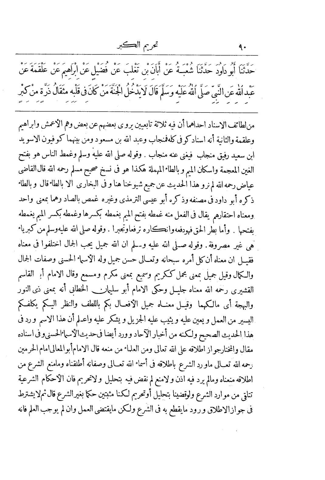 مِنْ لَطَائِفِ الْإِسْنَادِ إِحْدَاهُمَا أَنَّ فِيهِ ثَلَاثَةً تَابِعِيِّينَ يَرْوِي بَعْضُهُمْ عَنْ بَعْضٍ وَهُمُ الْأَعْمَشُ وَإِبْرَاهِيمُ وَعَلْقَمَةُ وَالثَّانِيَةُ أَنَّهُ إِسْنَادٌ كُوفِيٌّ كُلُّهُ فَمِنْجَابٌ وَعَبْدُ اللَّهِ بْنُ مَسْعُودٍ وَمَنْ بَيْنَهُمَا كوفيون الاسويد بْنُ سَعِيدٍ رَفِيقُ مِنْجَابٍ فَيُغْنِي عَنْهُ مِنْجَابٌ وَقَوْلُهُ صَلَّى اللَّهُ عَلَيْهِ وَسَلَّمَ وَغَمْطُ النَّاسِ هُوَ بِفَتْحِ الْغَيْنِ الْمُعْجَمَةِ وَإِسْكَانِ الْمِيمِ وَبِالطَّاءِ الْمُهْمَلَةِ هَكَذَا هُوَ فِي نُسَخِ صَحِيحِ مُسْلِمٍ رَحِمَهُ اللَّهُ قَالَ الْقَاضِي عِيَاضٌ رَحِمَهُ اللَّهُ لَمْ نَرْوِ هَذَا الْحَدِيثَ عَنْ جَمِيعِ شُيُوخِنَا هنا وفى البخارى الا بطاء قال وبالطاء ذكره أَبُو دَاوُدَ فِي مُصَنَّفِهِ وَذَكَرَهُ أَبُو عِيسَى التِّرْمِذِيُّ وَغَيْرُهُ غَمْصُ بِالصَّادِ وَهُمَا بِمَعْنًى وَاحِدٍ وَمَعْنَاهُ احْتِقَارُهُمْ يُقَالُ فِي الْفِعْلِ مِنْهُ غَمَطَهُ بفتح الميم يغمطه بكسرها وغمطه بكسر الميم يغمطه بفتحها أما بَطْرُ الْحَقِّ فَهُوَ دَفْعُهُ وَإِنْكَارُهُ تَرَفُّعًا وَتَجَبُّرًا وَقَوْلُهُ صَلَّى اللَّهُ عَلَيْهِ وَسَلَّمَ مِنْ كِبْرِيَاءَ هِيَ غَيْرُ مَصْرُوفَةٍ وَقَوْلُهُ صَلَّى اللَّهُ عَلَيْهِ وَسَلَّمَ إِنَّ اللَّهَ جَمِيلٌ يُحِبُّ الْجَمَالَ اخْتَلَفُوا فِي مَعْنَاهُ فَقِيلَ إِنَّ مَعْنَاهُ أَنَّ كُلَّ أَمْرِهِ سُبْحَانَهُ وَتَعَالَى حَسَنٌ جَمِيلٌ وَلَهُ الْأَسْمَاءُ الْحُسْنَى وَصِفَاتُ الْجَمَالِ وَالْكَمَالِ وَقِيلَ جَمِيلٌ بِمَعْنَى مُجَمِّلٌ كَكَرِيمٍ وَسَمِيعٍ بِمَعْنَى مُكَرِّمٌ وَمُسَمِّعٍ وَقَالَ الْإِمَامُ أَبُو الْقَاسِمِ الْقُشَيْرِيُّ رَحِمَهُ اللَّهُ مَعْنَاهُ جَلِيلٌ وَحَكَى الْإِمَامُ أَبُو سُلَيْمَانَ الْخَطَّابِيُّ أَنَّهُ بمعنى ذى النور والبهجة أى مالكهما وقيل معناه جَمِيلُ الْأَفْعَالِ بِكُمْ بِاللُّطْفِ وَالنَّظَرِ إِلَيْكُمْ يُكَلِّفُكُمُ الْيَسِيرَ مِنَ الْعَمَلِ وَيُعِينُ عَلَيْهِ وَيُثِيبُ عَلَيْهِ الْجَزِيلَ وَيَشْكُرُ عَلَيْهِ وَاعْلَمْ أَنَّ هَذَا الِاسْمَ وَرَدَ فِي هَذَا الْحَدِيثِ الصَّحِيحِ وَلَكِنَّهُ مِنْ أَخْبَارِ الْآحَادِ وَوَرَدَ أَيْضًا فِي حَدِيثِ الْأَسْمَاءِ الْحُسْنَى وَفِي إِسْنَادِهِ مَقَالٌ وَالْمُخْتَارُ جَوَازُ إِطْلَاقِهِ عَلَى اللَّهِ تَعَالَى وَمِنِ الْعُلَمَاءِ مَنْ مَنَعَهُ قَالَ الْإِمَامُ أَبُو الْمَعَالِي إِمَامُ الْحَرَمَيْنِ رَحِمَهُ اللَّهُ تَعَالَى مَا وَرَدَ الشَّرْعُ بِإِطْلَاقِهِ فِي أَسْمَاءِ اللَّهِ تَعَالَى وَصِفَاتِهِ أَطْلَقْنَاهُ وَمَا مَنَعَ الشَّرْعُ مِنْ إِطْلَاقِهِ مَنَعْنَاهُ وَمَا لَمْ يَرِدْ فِيهِ إِذْنٌ وَلَا مَنْعٌ لَمْ نَقْضِ فِيهِ بِتَحْلِيلٍ وَلَا تَحْرِيمٍ فَإِنَّ الْأَحْكَامَ الشَّرْعِيَّةَ تُتَلَقَّى مِنْ مَوَارِدِ الشَّرْعِ وَلَوْ قَضَيْنَا بِتَحْلِيلٍ أَوْ تَحْرِيمٍ لَكُنَّا مُثْبِتِينَ حُكْمًا بِغَيْرِ الشَّرْعِ قَالَ ثُمَّ لَا يُشْتَرَطُ فِي جَوَازِ الْإِطْلَاقِ وُرُودِ ما يقطع به الشرع ولكن ما يقتضى للعمل وَإِنْ لَمْ يُوجِبِ الْعِلْمَ فَإِنَّهُ