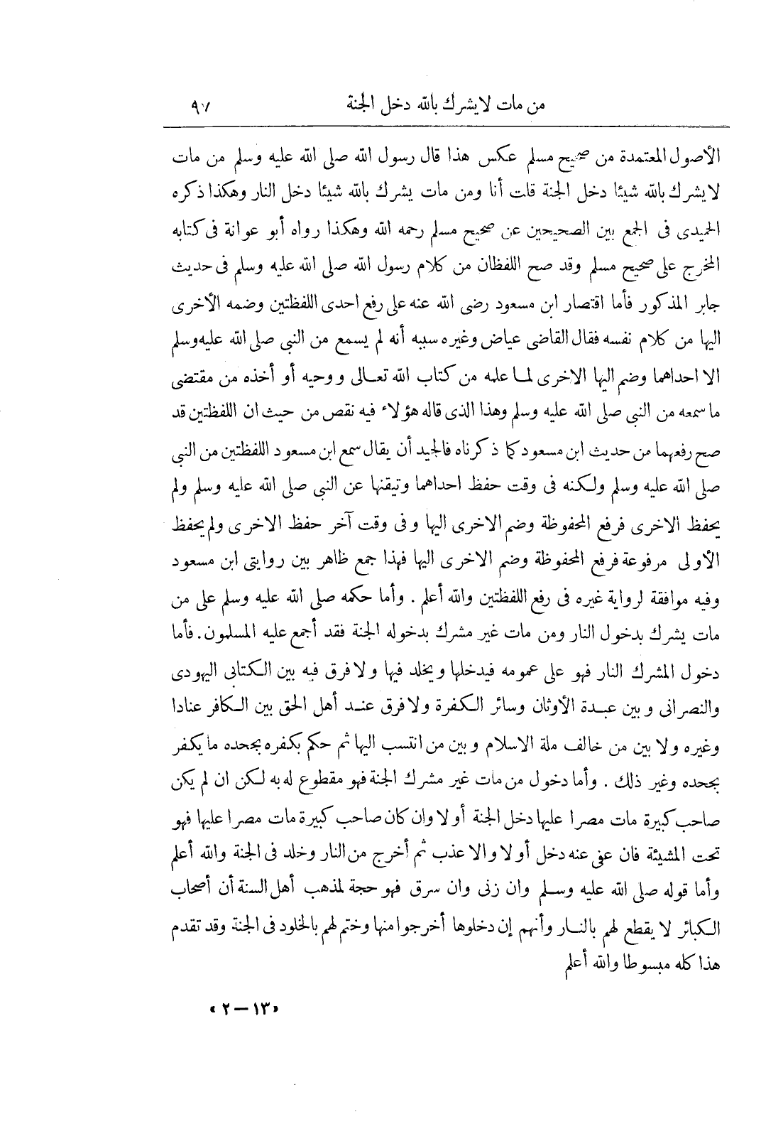 الْأُصُولِ الْمُعْتَمَدَةِ مِنْ صَحِيحِ مُسْلِمٍ عَكْسُ هَذَا قَالَ رَسُولُ اللَّهِ صَلَّى اللَّهُ عَلَيْهِ وَسَلَّمَ من مات لَا يُشْرِكُ بِاللَّهِ شَيْئًا دَخَلَ الْجَنَّةَ قُلْتُ أَنَا وَمَنْ مَاتَ يُشْرِكُ بِاللَّهِ شَيْئًا دَخَلَ النَّارَ وَهَكَذَا ذَكَرَهُ الْحُمَيْدِيُّ فِي الْجَمْعِ بَيْنَ الصَّحِيحَيْنِ عَنْ صَحِيحِ مُسْلِمٍ رَحِمَهُ اللَّهُ وَهَكَذَا رَوَاهُ أَبُو عَوَانَةَ فِي كِتَابِهِ المخرج على صحيحه مُسْلِمٍ وَقَدْ صَحَّ اللَّفْظَانِ مِنْ كَلَامِ رَسُولِ اللَّهِ صَلَّى اللَّهُ عَلَيْهِ وَسَلَّمَ فِي حَدِيثِ جابر المذكور فأما اقتصار بن مَسْعُودٍ رَضِيَ اللَّهُ عَنْهُ عَلَى رَفْعِ إِحْدَى اللَّفْظَتَيْنِ وَضَمِّهِ الْأُخْرَى إِلَيْهَا مِنْ كَلَامِ نَفْسِهِ فَقَالَ الْقَاضِي عِيَاضٌ وَغَيْرُهُ سَبَبُهُ أَنَّهُ لَمْ يَسْمَعْ مِنَ النَّبِيِّ صَلَّى اللَّهُ عَلَيْهِ وَسَلَّمَ إِلَّا إِحْدَاهُمَا وَضَمَّ إِلَيْهَا الْأُخْرَى لِمَا عَلِمَهُ مِنْ كِتَابِ اللَّهِ تَعَالَى وَوَحْيِهِ أَوْ أَخَذَهُ مِنْ مُقْتَضَى مَا سَمِعَهُ مِنَ النَّبِيِّ صَلَّى اللَّهُ عَلَيْهِ وَسَلَّمَ وَهَذَا الَّذِي قَالَهُ هَؤُلَاءِ فِيهِ نَقْصٌ مِنْ حَيْثُ إِنَّ اللَّفْظَتَيْنِ قَدْ صح رفعهما من حديث بن مَسْعُودٍ كَمَا ذَكَرْنَاهُ فَالْجَيِّدُ أَنْ يُقَالَ سَمِعَ بن مَسْعُودٍ اللَّفْظَتَيْنِ مِنَ النَّبِيِّ صَلَّى اللَّهُ عَلَيْهِ وَسَلَّمَ وَلَكِنَّهُ فِي وَقْتٍ حَفِظَ إِحْدَاهُمَا وَتَيَقَّنَهَا عَنِ النَّبِيِّ صَلَّى اللَّهُ عَلَيْهِ وَسَلَّمَ وَلَمْ يَحْفَظِ الْأُخْرَى فَرَفَعَ الْمَحْفُوظَةَ وَضَمَّ الْأُخْرَى إِلَيْهَا وَفِي وَقْتٍ آخَرَ حَفِظَ الْأُخْرَى وَلَمْ يَحْفَظِ الْأُولَى مَرْفُوعَةً فَرَفَعَ الْمَحْفُوظَةَ وَضَمَّ الْأُخْرَى إِلَيْهَا فهذا جمع ظاهر بين روايتى بن مَسْعُودٍ وَفِيهِ مُوَافَقَةٌ لِرِوَايَةِ غَيْرِهِ فِي رَفْعِ اللَّفْظَتَيْنِ وَاللَّهُ أَعْلَمُ وَأَمَّا حُكْمُهُ صَلَّى اللَّهُ عَلَيْهِ وَسَلَّمَ عَلَى مَنْ مَاتَ يُشْرِكُ بِدُخُولِ النَّارِ وَمَنْ مَاتَ غَيْرَ مُشْرِكٍ بِدُخُولِهِ الْجَنَّةَ فقد فَقَدْ أَجْمَعَ عَلَيْهِ الْمُسْلِمُونَ فَأَمَّا دُخُولُ الْمُشْرِكِ النَّارَ فَهُوَ عَلَى عُمُومِهِ فَيَدْخُلُهَا وَيَخْلُدُ فِيهَا وَلَا فَرْقَ فِيهِ بَيْنَ الْكِتَابِيِّ الْيَهُودِيِّ وَالنَّصْرَانِيِّ وَبَيْنَ عَبَدَةِ الْأَوْثَانِ وَسَائِرِ الْكَفَرَةِ وَلَا فَرْقَ عِنْدَ أَهْلِ الْحَقِّ بَيْنَ الْكَافِرِ عِنَادًا وَغَيْرِهِ وَلَا بَيْنَ مَنْ خَالَفَ مِلَّةَ الْإِسْلَامِ وَبَيْنَ مَنِ انْتَسَبَ إِلَيْهَا ثُمَّ حُكِمَ بِكُفْرِهِ بِجَحْدِهِ مَا يَكْفُرُ بِجَحْدِهِ وَغَيْرِ ذَلِكَ وَأَمَّا دُخُولُ مَنْ مَاتَ غَيْرَ مُشْرِكٍ الْجَنَّةَ فَهُوَ مَقْطُوعٌ لَهُ بِهِ لَكِنْ إِنْ لَمْ يَكُنْ صَاحِبَ كَبِيرَةٍ مَاتَ مُصِرًّا عَلَيْهَا دَخَلَ الْجَنَّةَ أَوَّلًا وَإِنْ كَانَ صَاحِبَ كَبِيرَةٍ مَاتَ مُصِرًّا عَلَيْهَا فَهُوَ تَحْتَ الْمَشِيئَةِ فَإِنْ عُفِيَ عَنْهُ دَخَلَ أَوَّلًا وَإِلَّا عُذِّبَ ثُمَّ أُخْرِجَ مِنَ النَّارِ وَخُلِّدَ فِي الْجَنَّةِ وَاللَّهُ أَعْلَمُ وَأَمَّا قَوْلُهُ صَلَّى اللَّهُ عَلَيْهِ وَسَلَّمَ وَإِنْ زَنَى وَإِنْ سَرَقَ فَهُوَ حُجَّةٌ لِمَذْهَبِ أَهْلِ السَّنَةِ أَنَّ أَصْحَابَ الْكَبَائِرِ لَا يُقْطَعُ لَهُمْ بِالنَّارِ وَأَنَّهُمْ إِنْ دَخَلُوهَا أُخْرِجُوا مِنْهَا وَخُتِمَ لَهُمْ بِالْخُلُودِ فِي الْجَنَّةِ وَقَدْ تَقَدَّمَ هَذَا كُلُّهُ مَبْسُوطًا والله أعلم