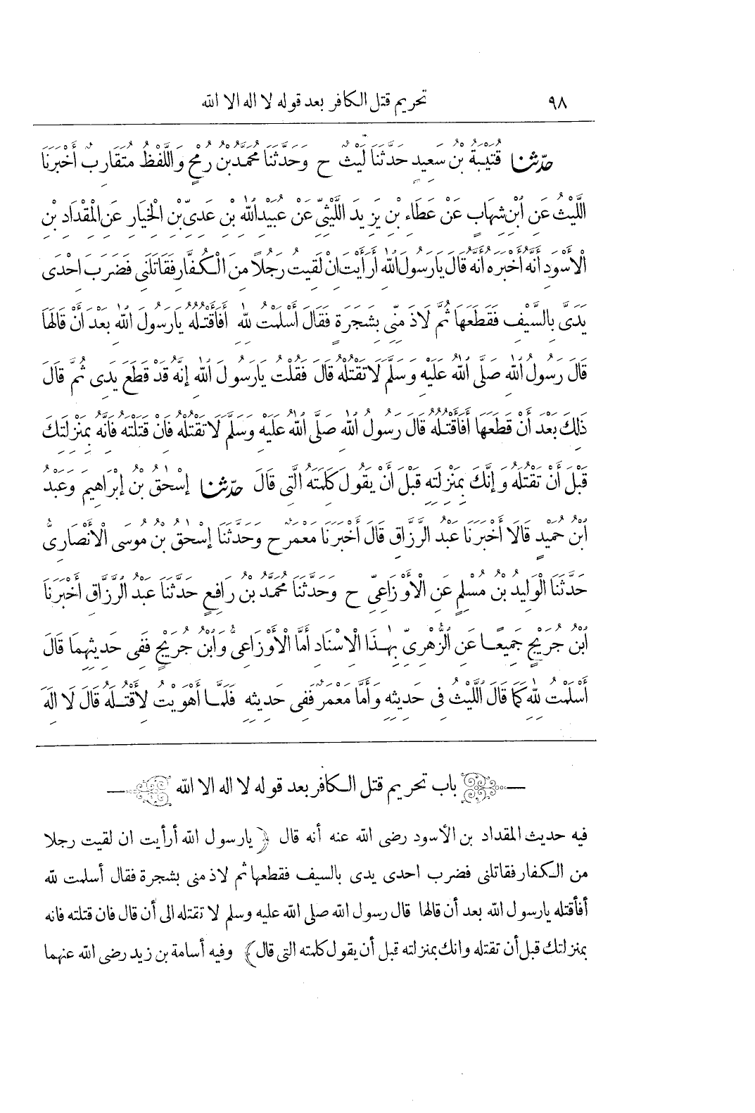 [95] فِيهِ حَدِيثُ الْمِقْدَادِ بْنِ الأسود رضى الله عنه أنه قَالَ (يَا رَسُولَ اللَّهِ أَرَأَيْتَ إِنْ لَقِيتُ رَجُلًا مِنَ الْكُفَّارِ فَقَاتَلَنِي فَضَرَبَ إِحْدَى يَدَيَّ بِالسَّيْفِ فَقَطَعَهَا ثُمَّ لَاذَ مِنِّي بِشَجَرَةٍ فَقَالَ أَسْلَمْتُ لِلَّهِ أَفَأَقْتُلُهُ يَا رَسُولَ اللَّهِ بَعْدَ أَنْ قَالَهَا قَالَ رَسُولُ اللَّهِ صَلَّى اللَّهُ عَلَيْهِ وَسَلَّمَ لَا تَقْتُلْهُ إِلَى أَنْ قَالَ فَإِنْ قَتَلْتَهُ فَإِنَّهُ بِمَنْزِلَتِكَ قَبْلَ أَنْ تَقْتُلَهُ وَإِنَّكَ بِمَنْزِلَتِهِ قَبْلَ أَنْ يَقُولَ كَلِمَتَهُ الَّتِي قَالَ) وَفِيهِ أُسَامَةُ بْنُ زَيْدٍ رَضِيَ اللَّهُ عنهما)