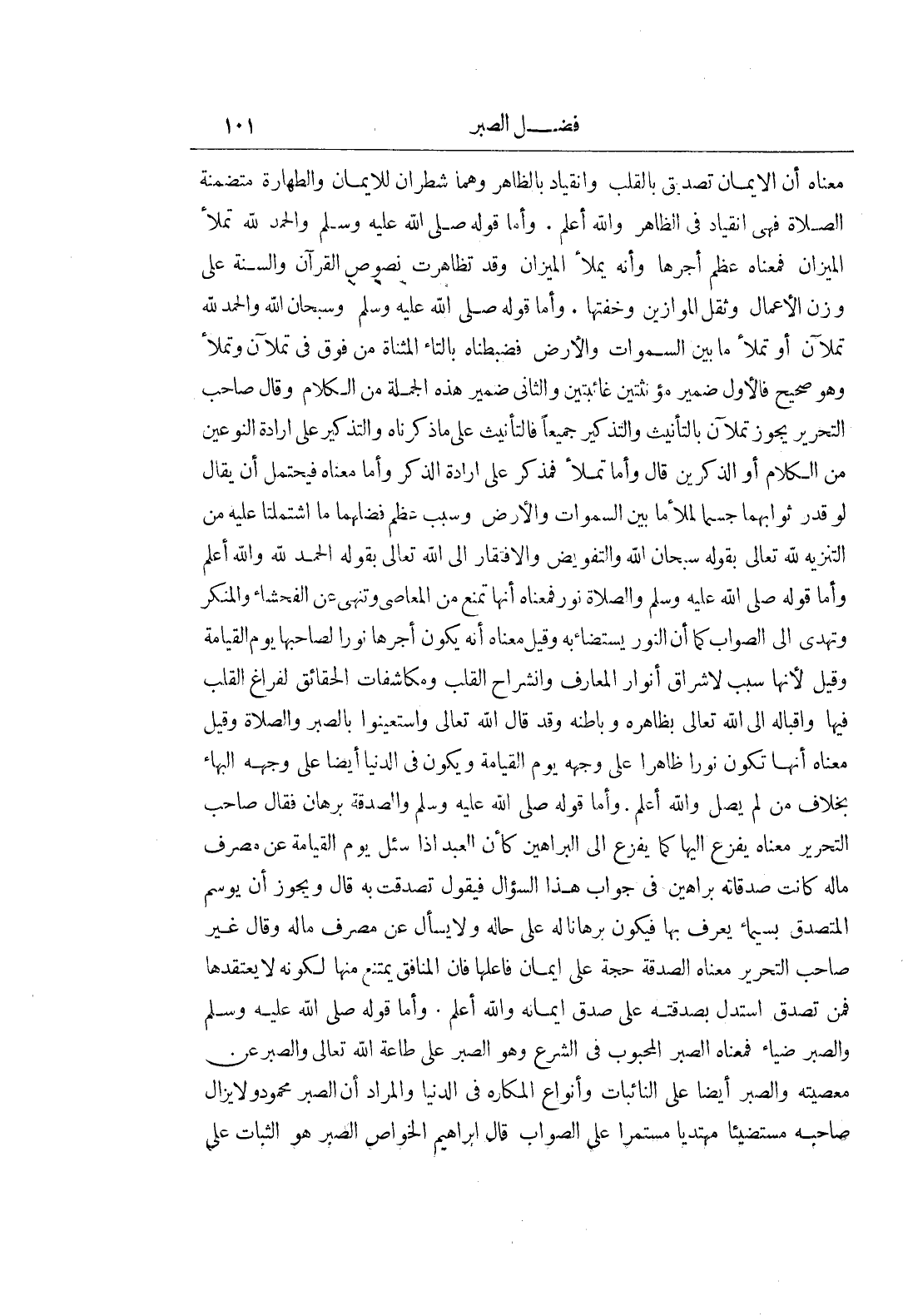 مَعْنَاهُ أَنَّ الْإِيمَانَ تَصْدِيقٌ بِالْقَلْبِ وَانْقِيَادٌ بِالظَّاهِرِ وَهُمَا شَطْرَانِ لِلْإِيمَانِ وَالطَّهَارَةُ مُتَضَمِّنَةٌ الصَّلَاةَ فَهِيَ انْقِيَادٌ فِي الظَّاهِرِ وَاللَّهُ أَعْلَمُ وَأَمَّا قَوْلُهُ صَلَّى اللَّهُ عَلَيْهِ وَسَلَّمَ وَالْحَمْدُ لِلَّهِ تَمْلَأُ الْمِيزَانَ فَمَعْنَاهُ عِظَمُ أَجْرِهَا وَأَنَّهُ يَمْلَأُ الْمِيزَانَ وَقَدْ تَظَاهَرَتْ نُصُوصُ الْقُرْآنِ وَالسُّنَّةِ عَلَى وَزْنِ الْأَعْمَالِ وَثِقَلِ الْمَوَازِينِ وَخِفَّتِهَا وَأَمَّا قَوْلُهُ صَلَّى اللَّهُ عَلَيْهِ وَسَلَّمَ وَسُبْحَانَ اللَّهِ وَالْحَمْدُ لِلَّهِ تَمْلَآنِ أَوْ تَمْلَأُ مَا بَيْنَ السَّمَاوَاتِ وَالْأَرْضِ فَضَبَطْنَاهُ بِالتَّاءِ الْمُثَنَّاةِ مِنْ فَوْقُ فِي تَمْلَآنِ وَتَمْلَأُ وَهُوَ صَحِيحٌ فَالْأَوَّلُ ضَمِيرُ مُؤَنَّثَتَيْنِ غَائِبَتَيْنِ وَالثَّانِي ضَمِيرُ هَذِهِ الْجُمْلَةِ مِنَ الْكَلَامِ وَقَالَ صَاحِبُ التَّحْرِيرِ يَجُوزُ تَمْلَآنِ بِالتَّأْنِيثِ وَالتَّذْكِيرِ جَمِيعًا فَالتَّأْنِيثُ عَلَى مَا ذَكَرْنَاهُ وَالتَّذْكِيرُ عَلَى إِرَادَةِ النَّوْعَيْنِ مِنَ الْكَلَامِ أَوِ الذِّكْرَيْنِ قَالَ وَأَمَّا تَمْلَأُ فَمُذَكَّرٌ عَلَى إِرَادَةِ الذِّكْرِ وَأَمَّا مَعْنَاهُ فَيَحْتَمِلُ أَنْ يُقَالَ لَوْ قُدِّرَ ثَوَابُهُمَا جِسْمًا لَمَلَأَ مَا بَيْنَ السَّمَاوَاتِ وَالْأَرْضِ وَسَبَبُ عِظَمِ فَضْلِهِمَا مَا اشْتَمَلَتَا عَلَيْهِ مِنَ التَّنْزِيهِ لِلَّهِ تَعَالَى بِقَوْلِهِ سُبْحَانَ اللَّهِ وَالتَّفْوِيضِ وَالِافْتِقَارِ إِلَى اللَّهِ تَعَالَى بِقَوْلِهِ الْحَمْدُ لِلَّهِ وَاللَّهُ أَعْلَمُ وَأَمَّا قَوْلُهُ صَلَّى اللَّهُ عَلَيْهِ وَسَلَّمَ وَالصَّلَاةُ نُورٌ فَمَعْنَاهُ أَنَّهَا تَمْنَعُ مِنَ الْمَعَاصِي وَتَنْهَى عَنِ الْفَحْشَاءِ وَالْمُنْكَرِ وَتَهْدِي إِلَى الصَّوَابِ كَمَا أَنَّ النُّورَ يُسْتَضَاءُ بِهِ وَقِيلَ مَعْنَاهُ أَنَّهُ يَكُونُ أَجْرُهَا نُورًا لِصَاحِبِهَا يَوْمَ الْقِيَامَةِ وَقِيلَ لِأَنَّهَا سَبَبٌ لِإِشْرَاقِ أَنْوَارِ الْمَعَارِفِ وَانْشِرَاحِ الْقَلْبِ وَمُكَاشَفَاتِ الْحَقَائِقِ لِفَرَاغِ الْقَلْبِ فِيهَا وَإِقْبَالِهِ إِلَى اللَّهِ تَعَالَى بِظَاهِرِهِ وَبَاطِنِهِ وَقَدْ قَالَ اللَّهُ تعالى واستعينوا بالصبر والصلاة وَقِيلَ مَعْنَاهُ أَنَّهَا تَكُونُ نُورًا ظَاهِرًا عَلَى وَجْهِهِ يَوْمَ الْقِيَامَةِ وَيَكُونُ فِي الدُّنْيَا أَيْضًا عَلَى وَجْهِهِ الْبَهَاءُ بِخِلَافِ مَنْ لَمْ يُصَلِّ وَاللَّهُ أَعْلَمُ وَأَمَّا قَوْلُهُ صَلَّى اللَّهُ عَلَيْهِ وَسَلَّمَ وَالصَّدَقَةُ بُرْهَانٌ فَقَالَ صَاحِبُ التَّحْرِيرِ مَعْنَاهُ يَفْزَعُ إِلَيْهَا كَمَا يَفْزَعُ إِلَى الْبَرَاهِينِ كَأَنَّ الْعَبْدَ إِذَا سُئِلَ يَوْمَ الْقِيَامَةِ عَنْ مَصْرِفِ مَالِهِ كَانَتْ صَدَقَاتُهُ بَرَاهِينَ فِي جَوَابِ هَذَا السُّؤَالِ فَيَقُولُ تَصَدَّقْتُ بِهِ قَالَ وَيَجُوزُ أَنْ يُوسَمَ الْمُتَصَدِّقُ بِسِيمَاءَ يُعْرَفُ بِهَا فَيَكُونُ بُرْهَانًا لَهُ عَلَى حَالِهِ وَلَا يُسْأَلُ عَنْ مَصْرِفِ مَالِهِ وَقَالَ غَيْرُ صَاحِبِ التَّحْرِيرِ مَعْنَاهُ الصَّدَقَةُ حُجَّةٌ عَلَى إِيمَانِ فَاعِلِهَا فَإِنَّ الْمُنَافِقَ يَمْتَنِعُ مِنْهَا لِكَوْنِهِ لَا يَعْتَقِدُهَا فَمَنْ تَصَدَّقَ اسْتُدِلَّ بِصَدَقَتِهِ عَلَى صِدْقِ إِيمَانِهِ وَاللَّهُ أَعْلَمُ وَأَمَّا قَوْلُهُ صَلَّى اللَّهُ عَلَيْهِ وَسَلَّمَ وَالصَّبْرُ ضِيَاءٌ فَمَعْنَاهُ الصَّبْرُ الْمَحْبُوبُ فِي الشَّرْعِ وَهُوَ الصَّبْرُ عَلَى طَاعَةِ اللَّهِ تَعَالَى وَالصَّبْرُ عَنْ مَعْصِيَتِهِ وَالصَّبْرُ أَيْضًا عَلَى النَّائِبَاتِ وَأَنْوَاعِ الْمَكَارِهِ فِي الد