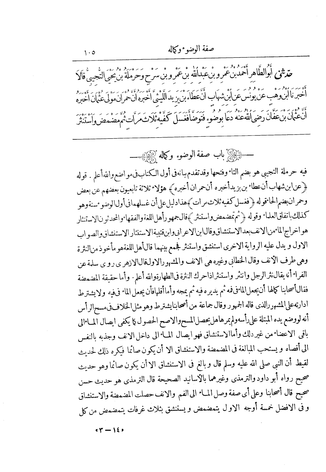 فِيهِ حَرْمَلَةُ التُّجِيبِيُّ هُوَ بِضَمِّ التَّاءِ وَفَتْحِهَا وَقَدْ تَقَدَّمَ بَيَانُهُ فِي أَوَّلِ الْكِتَابِ فِي مَوَاضِعَ وَاللَّهُ أَعْلَمُ قوله (عن بن شِهَابٍ أَنَّ عَطَاءَ بْنَ يَزِيدَ أَخْبَرَهُ أَنَّ حُمْرَانَ أَخْبَرَهُ) هَؤُلَاءِ ثَلَاثَةٌ تَابِعِيُّونَ بَعْضُهُمْ عَنْ بعض وحمران أن بِضَمِّ الْحَاءِ قَوْلُهُ (فَغَسَلَ كَفَّيْهِ ثَلَاثَ مَرَّاتٍ) هَذَا دَلِيلٌ عَلَى أَنَّ غَسْلَهُمَا فِي أَوَّلِ الْوُضُوءِ سُنَّةٌ وَهُوَ كَذَلِكَ بِاتِّفَاقِ الْعُلَمَاءِ وَقَوْلُهُ (ثُمَّ تَمَضْمَضَ وَاسْتَنْثَرَ) قَالَ جُمْهُورُ أَهْلِ اللُّغَةِ وَالْفُقَهَاءُ وَالْمُحَدِّثُونَ الِاسْتِنْثَارُ هُوَ إِخْرَاجُ الْمَاءِ مِنَ الانف بعد الاستنشاق وقال بن الاعرابي وبن قُتَيْبَةَ الِاسْتِنْثَارُ الِاسْتِنْشَاقُ وَالصَّوَابُ الْأَوَّلُ وَيَدُلُّ عَلَيْهِ الرِّوَايَةُ الْأُخْرَى اسْتَنْشَقَ وَاسْتَنْثَرَ فَجَمَعَ بَيْنَهُمَا قَالَ أَهْلُ اللُّغَةِ هُوَ مَأْخُوذٌ مِنْ النَّثْرَةِ وَهِيَ طَرَفُ الْأَنْفِ وَقَالَ الْخَطَّابِيُّ وَغَيْرُهُ هِيَ الْأَنْفُ وَالْمَشْهُورُ الْأَوَّلُ قَالَ الْأَزْهَرِيُّ رَوَى سَلَمَةُ عَنِ الْفَرَّاءِ أَنَّهُ يُقَالُ نَثَرَ الرَّجُلُ وَانْتَثَرَ وَاسْتَنْثَرَ إِذَا حَرَّكَ النَّثْرَةَ فِي الطَّهَارَةِ وَاللَّهُ أَعْلَمُ وَأَمَّا حَقِيقَةُ الْمَضْمَضَةِ فَقَالَ أَصْحَابُنَا كَمَالُهَا أَنْ يَجْعَلَ الْمَاءَ فِي فَمِهِ ثُمَّ يُدِيرُهُ فِيهِ ثُمَّ يَمُجُّهُ وَأَمَّا أَقَلُّهَا فَأَنْ يَجْعَلَ الْمَاءَ فِي فِيهِ وَلَا يُشْتَرَطُ إِدَارَتُهُ عَلَى الْمَشْهُورِ الَّذِي قَالَهُ الْجُمْهُورُ وَقَالَ جَمَاعَةٌ مِنْ أَصْحَابِنَا يُشْتَرَطُ وَهُوَ مِثْلُ الْخِلَافِ فِي مَسْحِ الرَّأْسِ أَنَّهُ لَوْ وَضَعَ يَدَهُ الْمُبْتَلَّةَ عَلَى رَأْسِهِ وَلَمْ يُمِرَّهَا هَلْ يَحْصُلُ الْمَسْحُ وَالْأَصَحُّ الْحُصُولُ كَمَا يَكْفِي إِيصَالُ الْمَاءِ إِلَى بَاقِي الْأَعْضَاءِ من غير دلك وَأَمَّا الِاسْتِنْشَاقُ فَهُوَ إِيصَالُ الْمَاءِ إِلَى دَاخِلِ الْأَنْفِ وَجَذْبُهُ بِالنَّفَسِ إِلَى أَقْصَاهُ وَيُسْتَحَبُّ الْمُبَالَغَةُ فِي الْمَضْمَضَةِ وَالِاسْتِنْشَاقِ إِلَّا أَنْ يَكُونَ صَائِمًا فَيُكْرَهُ ذَلِكَ لِحَدِيثِ لَقِيطٍ أَنَّ النَّبِيَّ صَلَّى اللَّهُ عَلَيْهِ وَسَلَّمَ قَالَ وَبَالِغْ فِي الِاسْتِنْشَاقِ إِلَّا أَنْ تَكُونَ صَائِمًا وَهُوَ حَدِيثٌ صَحِيحٌ رَوَاهُ أَبُو دَاوُدَ وَالتِّرْمِذِيُّ وَغَيْرُهُمَا بِالْأَسَانِيدِ الصَّحِيحَةِ قَالَ التِّرْمِذِيُّ هُوَ حَدِيثٌ حَسَنٌ صَحِيحٌ قَالَ أَصْحَابُنَا وَعَلَى أَيِّ صِفَةٍ وَصَلَ الْمَاءُ إِلَى الْفَمِ وَالْأَنْفِ حَصَلَتِ الْمَضْمَضَةُ وَالِاسْتِنْشَاقُ وَفِي الْأَفْضَلِ خَمْسَةُ أَوْجُهٍ الْأَوَّلُ يَتَمَضْمَضُ وَيَسْتَنْشِقُ بِثَلَاثِ غَرَفَاتٍ يَتَمَضْمَضُ مِنْ كُلٍّ