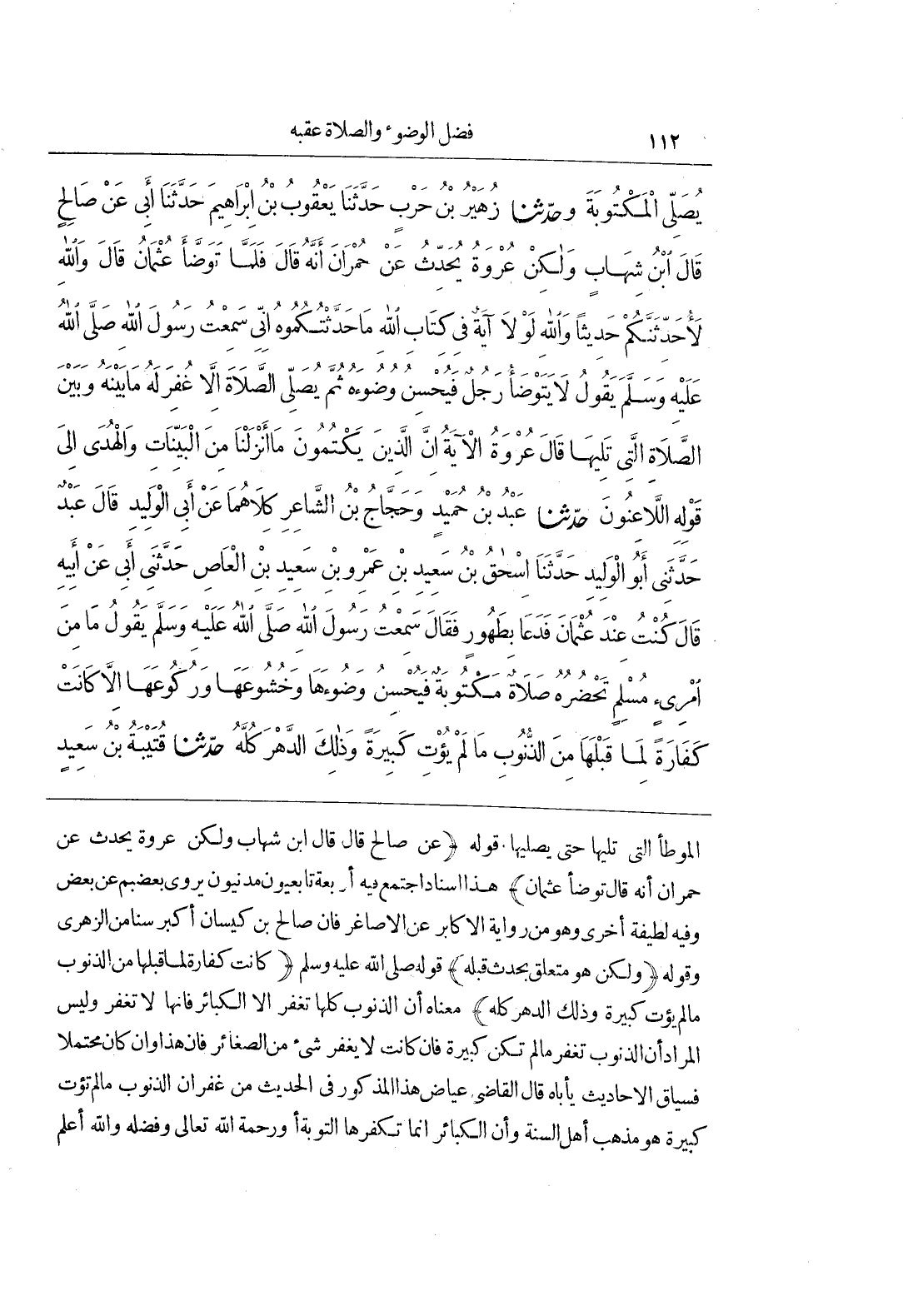 الموطأ التي تليها حتى يصليها قوله (عن صالح قال قال بن شِهَابٍ وَلَكِنَّ عُرْوَةَ يُحَدِّثُ عَنْ حُمْرَانَ أَنَّهُ قَالَ تَوَضَّأَ عُثْمَانُ) هَذَا إِسْنَادٌ اجْتَمَعَ فِيهِ أَرْبَعَةٌ تَابِعِيُّونَ مَدَنِيُّونَ يَرْوِي بَعْضُهُمْ عَنْ بَعْضٍ وَفِيهِ لَطِيفَةٌ أُخْرَى وَهُوَ مِنْ رِوَايَةِ الْأَكَابِرِ عَنِ الْأَصَاغِرِ فَإِنَّ صَالِحَ بْنَ كَيْسَانَ أَكْبَرُ سِنًّا مِنَ الزُّهْرِيِّ وَقَوْلُهُ (وَلَكِنَّ هُوَ مُتَعَلِّقٌ بِحَدَثٍ قَبْلَهُ) قَوْلُهُ صَلَّى اللَّهُ عَلَيْهِ وَسَلَّمَ (كَانَتْ كَفَّارَةً لِمَا قَبْلَهَا مِنَ الذُّنُوبِ مَا لَمْ يُؤْتَ كَبِيرَةٌ وَذَلِكَ الدَّهْرَ كُلَّهُ) مَعْنَاهُ أَنَّ الذُّنُوبَ كُلَّهَا تُغْفَرُ إِلَّا الْكَبَائِرَ فَإِنَّهَا لَا تُغْفَرُ وَلَيْسَ الْمُرَادُ أَنَّ الذُّنُوبَ تُغْفَرُ مالم تكن كبيرة فان كانت لا يغفر شئ مِنَ الصَّغَائِرِ فَإِنَّ هَذَا وَإِنْ كَانَ مُحْتَمَلًا فَسِيَاقُ الْأَحَادِيثِ يَأْبَاهُ قَالَ الْقَاضِي عِيَاضٌ هَذَا الْمَذْكُورُ فِي الْحَدِيثِ مِنْ غُفْرَانِ الذُّنُوبِ مَا لَمْ تُؤْتَ كَبِيرَةٌ هُوَ مَذْهَبُ أَهْلِ السُّنَّةِ وَأَنَّ الْكَبَائِرَ إِنَّمَا تُكَفِّرُهَا التَّوْبَةُ أَوْ رَحْمَةُ اللَّهِ تَعَالَى وَفَضْلُهُ وَاللَّهُ أَعْلَمُ