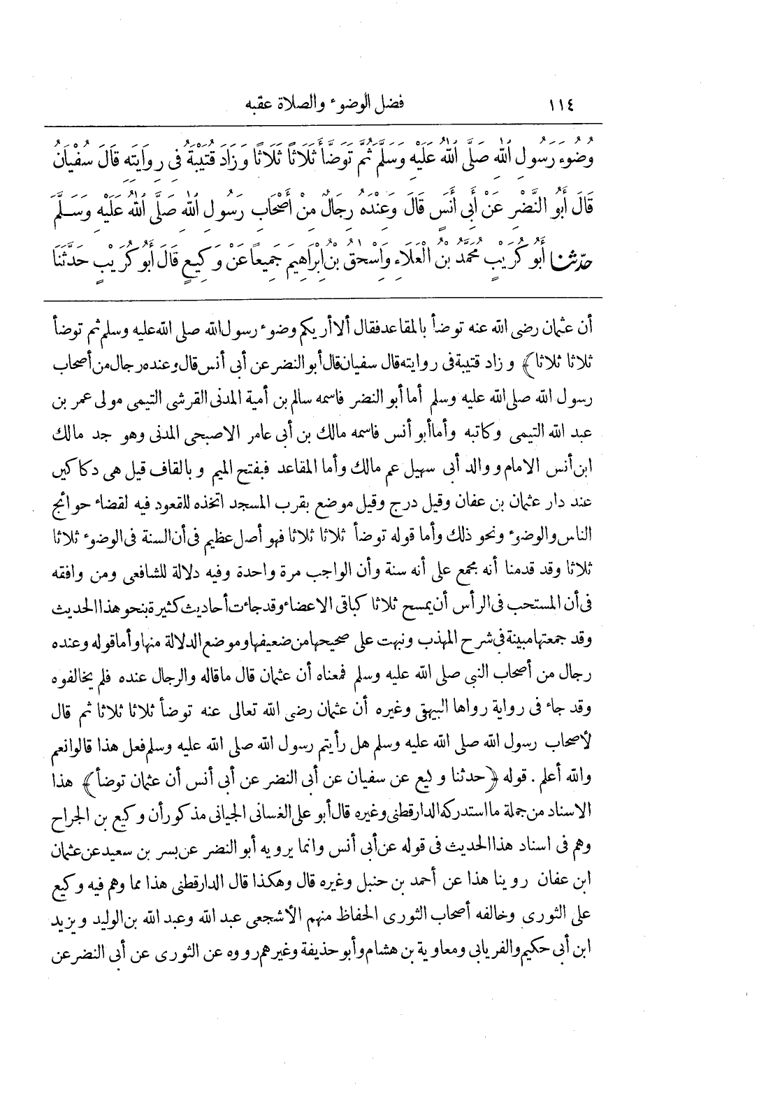 أَنَّ عُثْمَانَ رَضِيَ اللَّهُ عَنْهُ تَوَضَّأَ بِالْمَقَاعِدِ فَقَالَ أَلَا أُرِيكُمْ وُضُوءَ رَسُولِ اللَّهِ صَلَّى اللَّهُ عَلَيْهِ وَسَلَّمَ ثُمَّ تَوَضَّأَ ثَلَاثًا ثَلَاثًا) وَزَادَ قُتَيْبَةُ فِي رِوَايَتِهِ قَالَ سُفْيَانُ قَالَ أَبُو النَّضْرِ عَنْ أَبِي أَنَسٍ قَالَ وَعِنْدَهُ رِجَالٌ مِنْ أَصْحَابِ رَسُولِ اللَّهِ صَلَّى اللَّهُ عَلَيْهِ وَسَلَّمَ أَمَّا أَبُو النَّضْرِ فَاسْمُهُ سَالِمُ بن أمية المدني القرشي التيمي مَوْلَى عُمَرَ بْنِ عَبْدِ اللَّهِ التَّيْمِيُّ وَكَاتِبُهُ وَأَمَّا أَبُو أَنَسٍ فَاسْمُهُ مَالِكُ بْنُ أَبِي عَامِرٍ الْأَصْبَحِيُّ الْمَدَنِيُّ وَهُوَ جَدُّ مَالِكِ بْنِ أَنَسٍ الْإِمَامِ وَوَالِدُ أَبِي سُهَيْلٍ عَمِّ مَالِكٍ وَأَمَّا الْمَقَاعِدُ فَبِفَتْحِ الْمِيمِ وَبِالْقَافِ قِيلَ هِيَ دَكَاكِينُ عِنْدَ دَارِ عُثْمَانَ بْنِ عَفَّانَ وَقِيلَ دَرَجٌ وَقِيلَ مَوْضِعٌ بِقُرْبِ الْمَسْجِدِ اتَّخَذَهُ لِلْقُعُودِ فِيهِ لِقَضَاءِ حَوَائِجِ النَّاسِ وَالْوُضُوءِ وَنَحْوِ ذَلِكَ وَأَمَّا قَوْلُهُ تَوَضَّأَ ثَلَاثًا ثَلَاثًا فَهُوَ أَصْلٌ عَظِيمٌ فِي أَنَّ السُّنَّةَ فِي الْوُضُوءِ ثَلَاثًا ثَلَاثًا وَقَدْ قَدَّمْنَا أَنَّهُ مُجْمَعٌ عَلَى أَنَّهُ سُنَّةٌ وَأَنَّ الْوَاجِبَ مَرَّةً وَاحِدَةً وَفِيهِ دَلَالَةٌ لِلشَّافِعِيِّ وَمَنْ وَافَقَهُ فِي أَنَّ الْمُسْتَحَبَّ فِي الرَّأْسِ أَنْ يُمْسَحَ ثَلَاثًا كَبَاقِي الْأَعْضَاءِ وَقَدْ جَاءَتْ أَحَادِيثُ كَثِيرَةٌ بِنَحْوِ هَذَا الْحَدِيثِ وَقَدْ جَمَعْتُهَا مُبَيَّنَةٌ فِي شَرْحِ الْمُهَذَّبِ وَنَبَّهْتُ عَلَى صَحِيحِهَا مِنْ ضَعِيفِهَا وَمَوْضِعِ الدَّلَالَةِ مِنْهَا وَأَمَّا قَوْلُهُ وَعِنْدَهُ رِجَالٌ مِنْ أَصْحَابِ النَّبِيِّ صَلَّى اللَّهُ عَلَيْهِ وَسَلَّمَ فَمَعْنَاهُ أَنَّ عُثْمَانَ قَالَ مَا قَالَهُ وَالرِّجَالُ عِنْدَهُ فَلَمْ يُخَالِفُوهُ وَقَدْ جَاءَ فِي رِوَايَةٍ رَوَاهَا الْبَيْهَقِيُّ وَغَيْرُهُ أَنَّ عُثْمَانَ رَضِيَ اللَّهُ تَعَالَى عَنْهُ تَوَضَّأَ ثَلَاثًا ثَلَاثًا ثُمَّ قَالَ لِأَصْحَابِ رَسُولِ اللَّهِ صَلَّى اللَّهُ عَلَيْهِ وَسَلَّمَ هَلْ رَأَيْتُمْ رَسُولَ اللَّهِ صَلَّى اللَّهُ عَلَيْهِ وَسَلَّمَ فَعَلَ هَذَا قَالُوا نَعَمْ وَاللَّهُ أَعْلَمُ قَوْلُهُ (حَدَّثَنَا وَكِيعٌ عَنْ سُفْيَانَ عَنْ أَبِي النَّضْرِ عَنْ أَبِي أَنَسٍ أَنَّ عُثْمَانَ تَوَضَّأَ) هَذَا الْإِسْنَادُ مِنْ جُمْلَةِ مَا اسْتَدْرَكَهُ الدَّارَقُطْنِيُّ وَغَيْرُهُ قَالَ أَبُو عَلِيٍّ الْغَسَّانِيُّ الْجَيَّانِيُّ مَذْكُورٌ أَنَّ وَكِيعَ بْنَ الْجَرَّاحِ وَهِمَ فِي إِسْنَادِ هَذَا الْحَدِيثِ فِي قَوْلِهِ عَنْ أَبِي أَنَسٍ وَإِنَّمَا يَرْوِيهِ أَبُو النَّضْرِ عَنْ بُسْرِ بْنِ سَعِيدٍ عَنْ عُثْمَانَ بْنِ عَفَّانَ رُوِّينَا هَذَا عَنْ أَحْمَدَ بْنِ حَنْبَلٍ وَغَيْرِهِ قَالَ وَهَكَذَا قَالَ الدَّارَقُطْنِيُّ هَذَا مِمَّا وَهِمَ فِيهِ وَكِيعٌ عَلَى الثَّوْرِيِّ وَخَالَفَهُ أَصْحَابُ الثَّوْرِيِّ الْحُفَّاظُ مِنْهُمُ الْأَشْجَعِيُّ عَبْدُ اللَّهِ وَعَبْدُ اللَّهِ بْنُ الْوَلِيدِ وَيَزِيدُ بْنُ أَبِي حَكِيمٍ وَالْفِرْيَابِيُّ وَمُعَاوِيَةُ بْنُ هِشَامٍ وَأَبُو حُذَيْفَةَ وَغَيْرُهُمْ رَوَوْهُ عَنِ الثَّوْرِيِّ عَنْ أَبِي النَّضْرِ عَنْ