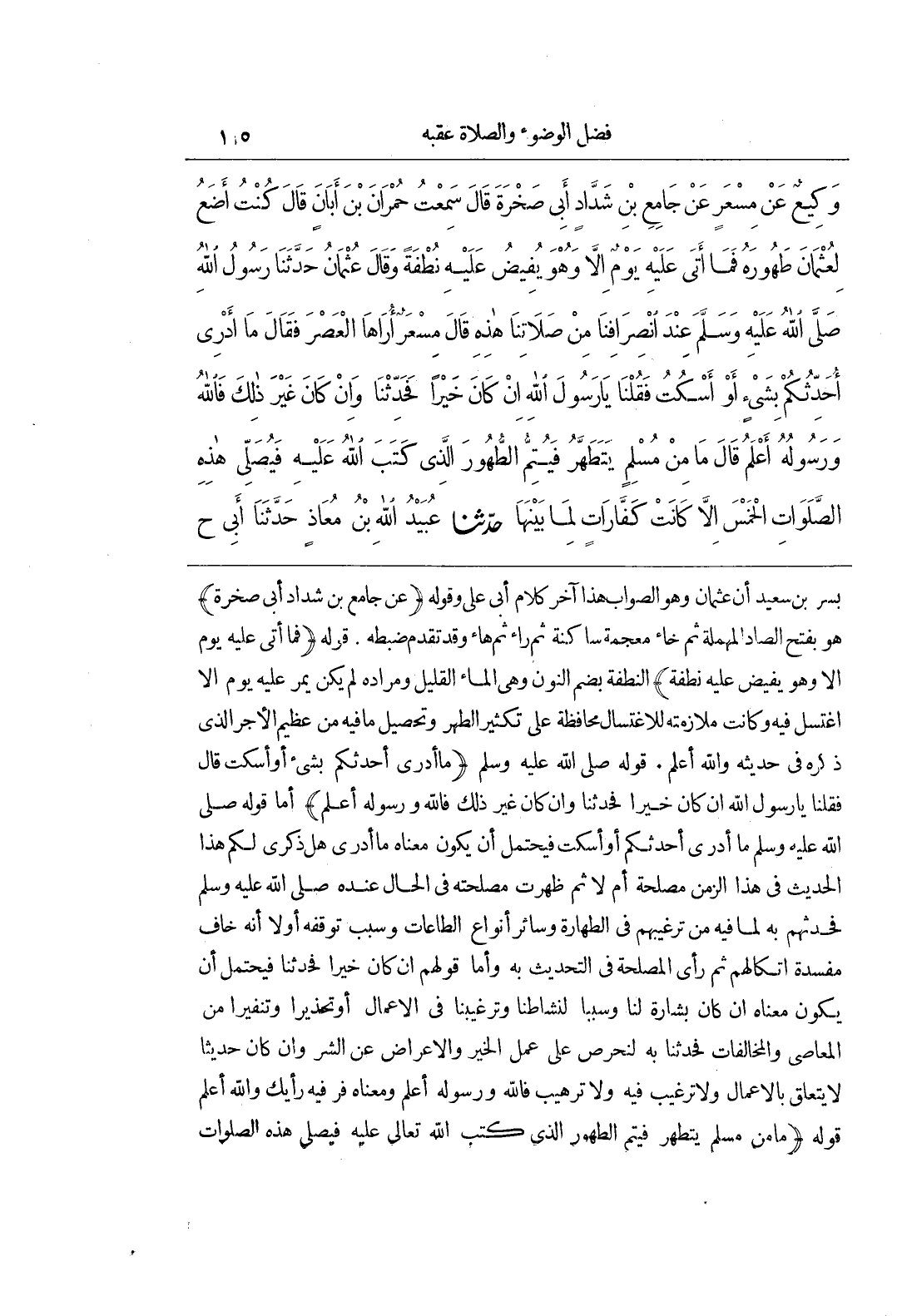 بُسْرِ بْنِ سَعِيدٍ أَنَّ عُثْمَانَ وَهُوَ الصَّوَابُ هَذَا آخِرُ كَلَامِ أَبِي عَلِيٍّ وَقَوْلُهُ (عَنْ جَامِعِ بْنِ شَدَّادٍ أَبِي صَخْرَةَ) هُوَ بِفَتْحِ الصَّادِ الْمُهْمَلَةِ ثُمَّ خَاءٍ مُعْجَمَةٍ سَاكِنَةٍ ثُمَّ رَاءٍ ثُمَّ هَاءٍ وَقَدْ تَقَدَّمَ ضَبْطُهُ قَوْلُهُ (فَمَا أَتَى عَلَيْهِ يَوْمٌ إِلَّا وَهُوَ يُفِيضُ عَلَيْهِ نُطْفَةً) النُّطْفَةُ بِضَمِّ النُّونِ وَهِيَ الْمَاءُ الْقَلِيلُ وَمُرَادُهُ لَمْ يَكُنْ يَمُرُّ عَلَيْهِ يَوْمٌ إِلَّا اغْتَسَلَ فِيهِ وَكَانَتْ مُلَازَمَتُهُ لِلِاغْتِسَالِ مُحَافَظَةً عَلَى تَكْثِيرِ الطُّهْرِ وَتَحْصِيلِ مَا فِيهِ مِنْ عَظِيمِ الْأَجْرِ الَّذِي ذَكَرَهُ فِي حَدِيثِهِ وَاللَّهُ أَعْلَمُ قَوْلُهُ صَلَّى اللَّهُ عَلَيْهِ وَسَلَّمَ (مَا أدري أحدثكم بشئ أو أسكت قال فقلنا يارسول اللَّهِ إِنْ كَانَ خَيْرًا فَحَدِّثْنَا وَإِنْ كَانَ غَيْرَ ذَلِكَ فَاللَّهُ وَرَسُولُهُ أَعْلَمُ) أَمَّا قَوْلُهُ صلى الله عليه وسلم ما أدري أحدثكم أَوْ أَسْكُتُ فَيَحْتَمِلُ أَنْ يَكُونَ مَعْنَاهُ مَا أَدْرِي هَلْ ذِكْرِي لَكُمْ هَذَا الْحَدِيثَ فِي هَذَا الزَّمَنِ مَصْلَحَةٌ أَمْ لَا ثُمَّ ظَهَرَتْ مَصْلَحَتُهُ فِي الْحَالِ عِنْدَهُ صَلَّى اللَّهُ عَلَيْهِ وَسَلَّمَ فَحَدَّثَهُمْ بِهِ لِمَا فِيهِ مِنْ تَرْغِيبِهِمْ فِي الطَّهَارَةِ وَسَائِرِ أَنْوَاعِ الطَّاعَاتِ وَسَبَبُ تَوَقُّفِهِ أَوَّلًا أَنَّهُ خَافَ مَفْسَدَةَ اتِّكَالِهِمْ ثُمَّ رَأَى الْمَصْلَحَةَ فِي التَّحْدِيثِ بِهِ وَأَمَّا قَوْلُهُمْ إِنْ كَانَ خَيْرًا فَحَدِّثْنَا فَيَحْتَمِلُ أَنْ يَكُونَ مَعْنَاهُ إِنْ كَانَ بِشَارَةً لَنَا وَسَبَبًا لِنَشَاطِنَا وَتَرْغِيبِنَا فِي الْأَعْمَالِ أَوْ تَحْذِيرًا وَتَنْفِيرًا مِنَ الْمَعَاصِي وَالْمُخَالَفَاتِ فَحَدِّثْنَا بِهِ لِنَحْرِصَ عَلَى عَمَلِ الْخَيْرِ وَالْإِعْرَاضِ عَنِ الشَّرِّ وَإِنْ كَانَ حَدِيثًا لَا يَتَعَلَّقُ بِالْأَعْمَالِ وَلَا تَرْغِيبَ فِيهِ وَلَا تَرْهِيبَ فَاللَّهُ وَرَسُولُهُ أَعْلَمُ وَمَعْنَاهُ فِرْ فِيهِ رَأْيَكَ وَاللَّهُ أَعْلَمُ قَوْلُهُ (مَا مِنْ مُسْلِمٍ يَتَطَهَّرُ فَيُتِمُّ الطُّهُورَ الَّذِي كَتَبَ اللَّهُ تَعَالَى عَلَيْهِ فَيُصَلِّي هَذِهِ الصَّلَوَاتِ