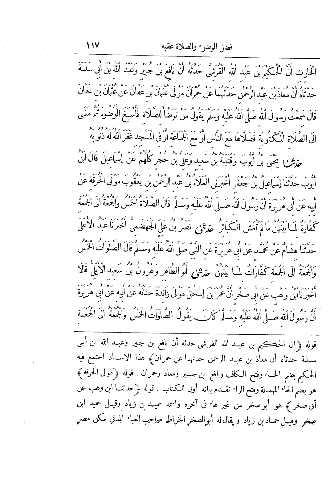 قَوْلُهُ (أَنَّ الْحُكَيْمَ بْنَ عَبْدِ اللَّهِ الْقُرَشِيَّ حَدَّثَهُ أَنَّ نَافِعَ بْنَ جُبَيْرٍ وَعَبْدَ اللَّهِ بْنَ أَبِي سَلَمَةَ حَدَّثَاهُ أَنَّ مُعَاذَ بْنَ عَبْدِ الرَّحْمَنِ حَدَّثَهُمَا عَنْ حُمْرَانَ) هَذَا الْإِسْنَادُ اجْتَمَعَ فِيهِ الْحُكَيْمُ بِضَمِّ الْحَاءِ وَفَتْحِ الْكَافِ وَنَافِعُ بْنُ جُبَيْرٍ وَمُعَاذٌ وَحُمْرَانُ قَوْلُهُ (مَوْلَى الْحُرَقَةِ) هُوَ بِضَمِّ الْحَاءِ الْمُهْمَلَةِ وَفَتْحِ الرَّاءِ تقدم بيانه أول الكتاب قوله (حدثنا بن وَهْبٍ عَنْ أَبِي صَخْرٍ) هُوَ أَبُو صَخْرٍ مِنْ غَيْرِ هَاءٍ فِي آخِرِهِ وَاسْمُهُ حُمَيْدُ بْنُ زِيَادٍ وَقِيلَ حُمَيْدُ بْنُ صَخْرٍ وَقِيلَ حَمَّادُ بْنُ زِيَادٍ وَيُقَالُ لَهُ أَبُو الصَّخْرِ الْخَرَّاطُ صَاحِبُ الْعَبَاءِ الْمَدَنِيُّ سَكَنَ مِصْرَ