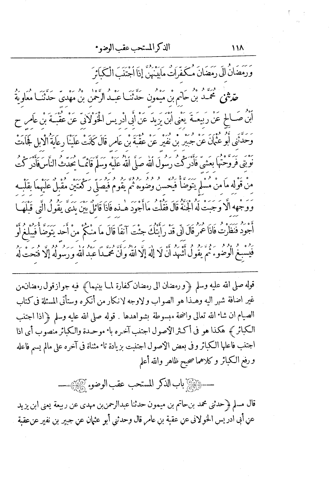 قَالَ مُسْلِمٌ (حَدَّثَنِي مُحَمَّدُ بْنُ حَاتِمِ بْنِ مَيْمُونٍ حَدَّثَنَا عَبْدُ الرَّحْمَنِ بْنُ مَهْدِيٍّ عَنْ ربيعة يعنى بْنِ يَزِيدَ عَنْ أَبِي إِدْرِيسَ الْخَوْلَانِيِّ عَنْ عُقْبَةَ بْنِ عَامِرٍ قَالَ وَحَدَّثَنِي أَبُو عُثْمَانَ عَنْ جُبَيْرِ بْنِ نُفَيْرٍ عَنْ عُقْبَةَ