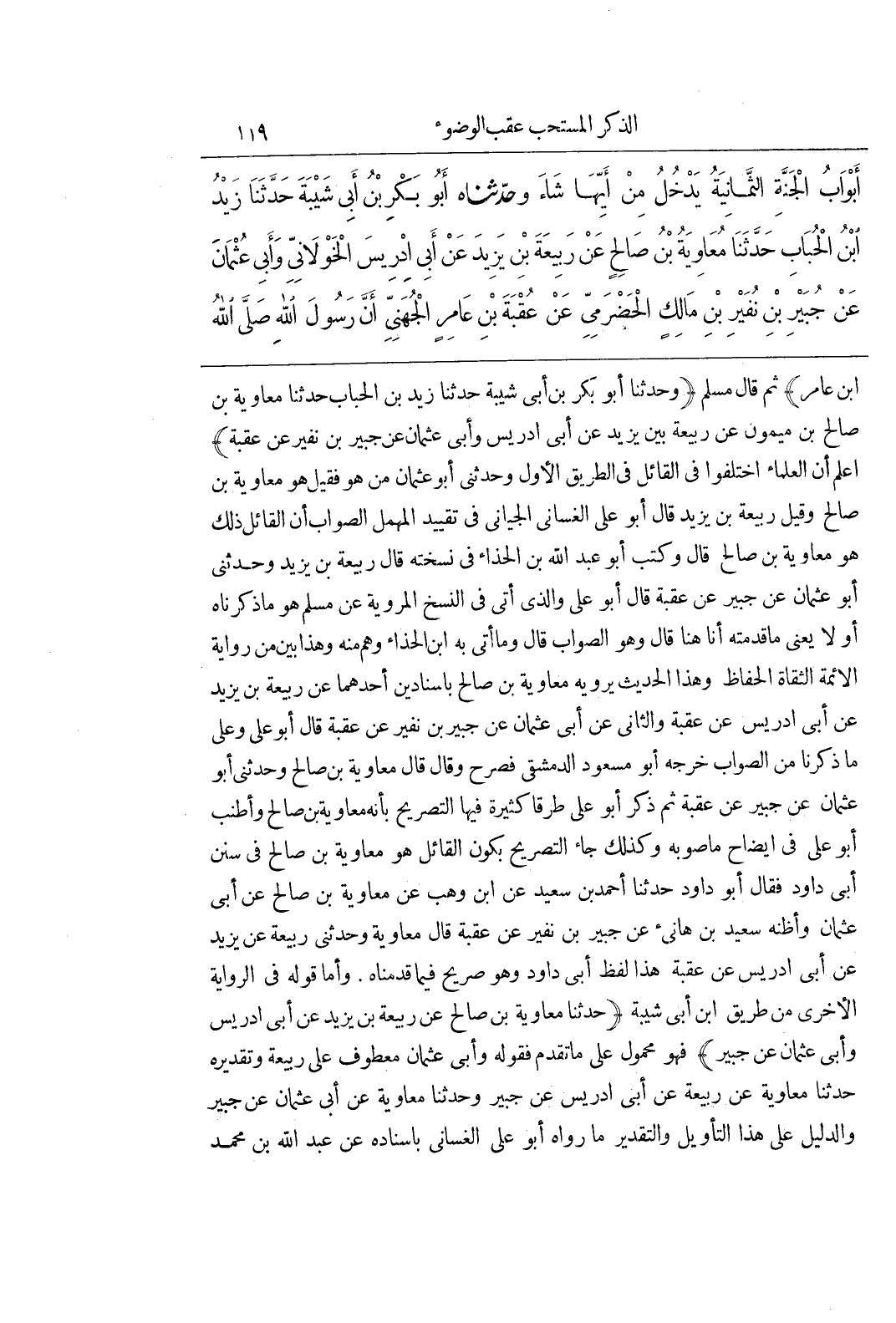 بْنِ عَامِرٍ) ثُمَّ قَالَ مُسْلِمٌ (وَحَدَّثَنَا أَبُو بَكْرِ بْنُ أَبِي شَيْبَةَ حَدَّثَنَا زَيْدُ بْنُ الحباب حدثنا معاوية بن صالح بن ميمون عن ربيعة بين يَزِيدَ عَنْ أَبِي إِدْرِيسَ وَأَبِي عُثْمَانَ عَنْ جُبَيْرِ بْنِ نُفَيْرٍ عَنْ عُقْبَةَ) اعْلَمْ أَنَّ الْعُلَمَاءَ اخْتَلَفُوا فِي الْقَائِلِ فِي الطَّرِيقِ الْأَوَّلِ وَحَدَّثَنِي أَبُو عُثْمَانَ مَنْ هُوَ فَقِيلَ هُوَ مُعَاوِيَةُ بْنُ صَالِحٍ وَقِيلَ رَبِيعَةُ بْنُ يَزِيدَ قَالَ أَبُو عَلِيٍّ الْغَسَّانِيُّ الْجَيَّانِيُّ فِي تَقْيِيدِ الْمُهْمَلِ الصَّوَابُ أَنَّ الْقَائِلَ ذَلِكَ هُوَ مُعَاوِيَةُ بْنُ صَالِحٍ قَالَ وَكَتَبَ أَبُو عَبْدِ اللَّهِ بْنُ الْحَذَّاءِ فِي نُسْخَتِهِ قَالَ رَبِيعَةُ بْنُ يَزِيدَ وَحَدَّثَنِي أَبُو عُثْمَانَ عَنْ جُبَيْرٍ عَنْ عُقْبَةَ قَالَ أَبُو عَلِيٍّ وَالَّذِي أَتَى فِي النُّسَخِ الْمَرْوِيَّةِ عَنْ مُسْلِمٍ هُوَ مَا ذَكَرْنَاهُ أَوَّلًا يَعْنِي مَا قَدَّمْتُهُ أَنَا هُنَا قَالَ وهو الصواب قال وما أتى به بن الْحَذَّاءِ وَهَمٌ مِنْهُ وَهَذَا بَيِّنٌ مِنْ رِوَايَةِ الْأَئِمَّةِ الثِّقَاةِ الْحُفَّاظِ وَهَذَا الْحَدِيثُ يَرْوِيهِ مُعَاوِيَةُ بْنُ صَالِحٍ بِإِسْنَادَيْنِ أَحَدُهُمَا عَنْ رَبِيعَةَ بْنِ يَزِيدَ عَنْ أَبِي إِدْرِيسَ عَنْ عُقْبَةَ وَالثَّانِي عَنْ أَبِي عُثْمَانَ عَنْ جُبَيْرِ بْنِ نُفَيْرٍ عَنْ عُقْبَةَ قَالَ أَبُو عَلِيٍّ وَعَلَى مَا ذَكَرْنَا مِنَ الصَّوَابِ خَرَّجَهُ أَبُو مَسْعُودٍ الدِّمَشْقِيُّ فَصَرَّحَ وَقَالَ قَالَ مُعَاوِيَةُ بْنُ صَالِحٍ وَحَدَّثَنِي أَبُو عُثْمَانَ عَنْ جُبَيْرٍ عَنْ عُقْبَةَ ثُمَّ ذَكَرَ أَبُو عَلِيٍّ طُرُقًا كَثِيرَةً فِيهَا التَّصْرِيحُ بِأَنَّهُ مُعَاوِيَةُ بْنُ صَالِحٍ وَأَطْنَبَ أَبُو عَلِيٍّ فِي إِيضَاحِ مَا صَوَّبَهُ وَكَذَلِكَ جَاءَ التَّصْرِيحُ بِكَوْنِ الْقَائِلِ هُوَ مُعَاوِيَةَ بْنَ صَالِحٍ فِي سُنَنِ أَبِي دَاوُدَ فَقَالَ أَبُو دَاوُدَ حَدَّثَنَا أحمد بن سعيد عن بن وَهْبٍ عَنْ مُعَاوِيَةَ بْنِ صَالِحٍ عَنْ أَبِي عُثْمَانَ وَأَظُنُّهُ سَعِيدَ بْنَ هَانِئٍ عَنْ جُبَيْرِ بْنِ نُفَيْرٍ عَنْ عُقْبَةَ قَالَ مُعَاوِيَةُ وَحَدَّثَنِي رَبِيعَةُ عَنْ يَزِيدَ عَنْ أَبِي إِدْرِيسَ عَنْ عُقْبَةَ هَذَا لَفْظُ أَبِي دَاوُدَ وَهُوَ صَرِيحٌ فِيمَا قَدَّمْنَاهُ وَأَمَّا قَوْلُهُ فِي الرِّوَايَةِ الْأُخْرَى من طريق بن أَبِي شَيْبَةَ (حَدَّثَنَا مُعَاوِيَةُ بْنُ صَالِحٍ عَنْ رَبِيعَةَ بْنِ يَزِيدَ عَنْ أَبِي إِدْرِيسَ وَأَبِي عُثْمَانَ عَنْ جُبَيْرٍ) فَهُوَ مَحْمُولٌ عَلَى مَا تَقَدَّمَ فَقَوْلُهُ وَأَبِي عُثْمَانَ مَعْطُوفٌ عَلَى رَبِيعَةَ وَتَقْدِيرُهُ حَدَّثَنَا مُعَاوِيَةُ عَنْ رَبِيعَةَ عَنْ أَبِي إِدْرِيسَ عَنْ جُبَيْرٍ وَحَدَّثَنَا مُعَاوِيَةُ عَنْ أَبِي عُثْمَانَ عَنْ جُبَيْرٍ وَالدَّلِيلُ عَلَى هَذَا التَّأْوِيلِ وَالتَّقْدِيرِ مَا رَوَاهُ أَبُو عَلِيٍّ الْغَسَّانِيُّ بِإِسْنَادِهِ عَنْ عَبْدِ اللَّهِ بْنِ مُحَمَّدٍ