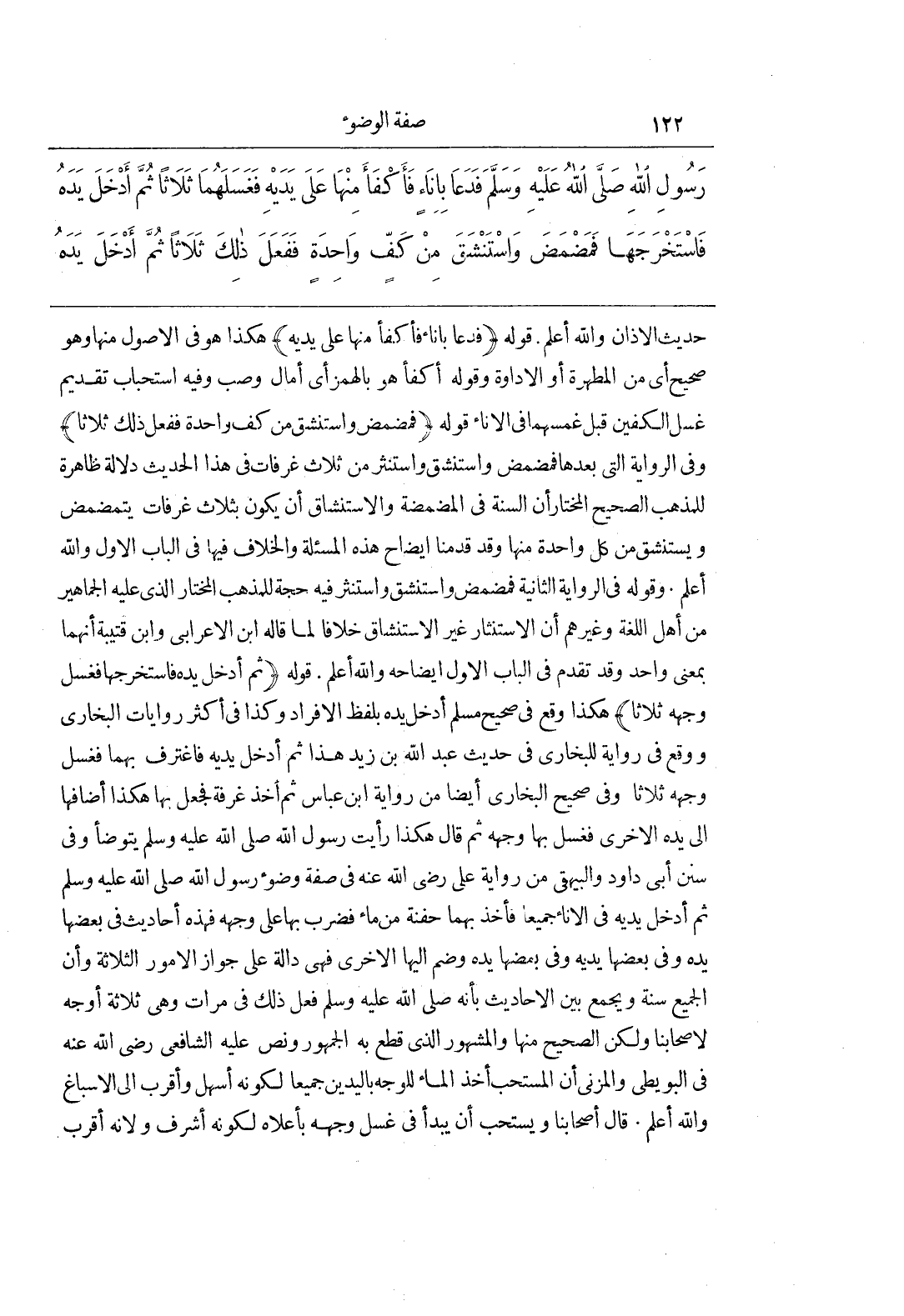حَدِيثِ الْأَذَانِ وَاللَّهُ أَعْلَمُ قَوْلُهُ (فَدَعَا بِإِنَاءٍ فَأَكْفَأَ مِنْهَا عَلَى يَدَيْهِ) هَكَذَا هُوَ فِي الْأُصُولِ مِنْهَا وَهُوَ صَحِيحٌ أَيْ مِنَ الْمَطْهَرَةِ أَوِ الْإِدَاوَةِ وَقَوْلُهُ أَكْفَأَ هُوَ بِالْهَمْزِ أَيْ أَمَالَ وَصَبَّ وَفِيهِ اسْتِحْبَابُ تَقْدِيمِ غَسْلِ الْكَفَّيْنِ قَبْلَ غَمْسِهِمَا فِي الْإِنَاءِ قَوْلُهُ (فَمَضْمَضَ وَاسْتَنْشَقَ مِنْ كَفٍّ وَاحِدَةٍ فَفَعَلَ ذَلِكَ ثَلَاثًا) وَفِي الرِّوَايَةِ الَّتِي بَعْدَهَا فَمَضْمَضَ وَاسْتَنْشَقَ وَاسْتَنْثَرَ مِنْ ثَلَاثِ غَرَفَاتٍ فِي هَذَا الْحَدِيثِ دَلَالَةٌ ظَاهِرَةٌ لِلْمَذْهَبِ الصَّحِيحِ الْمُخْتَارِ أَنَّ السُّنَّةَ فِي الْمَضْمَضَةِ وَالِاسْتِنْشَاقِ أَنْ يَكُونَ بِثَلَاثِ غَرَفَاتٍ يَتَمَضْمَضُ وَيَسْتَنْشِقُ مِنْ كُلِّ وَاحِدَةٍ مِنْهَا وَقَدْ قَدَّمْنَا إِيضَاحَ هَذِهِ الْمَسْأَلَةِ وَالْخِلَافَ فِيهَا فِي الْبَابِ الْأَوَّلِ وَاللَّهُ أَعْلَمُ وَقَوْلُهُ فِي الرِّوَايَةِ الثَّانِيَةِ فَمَضْمَضَ وَاسْتَنْشَقَ وَاسْتَنْثَرَ فِيهِ حُجَّةٌ لِلْمَذْهَبِ الْمُخْتَارِ الَّذِي عَلَيْهِ الْجَمَاهِيرُ مِنْ أَهْلِ اللُّغَةِ وَغَيْرِهِمْ أَنَّ الاستنثار غير الاستنشاق خلافا لما قاله بن الاعرابي وبن قُتَيْبَةَ أَنَّهُمَا بِمَعْنًى وَاحِدٍ وَقَدْ تَقَدَّمَ فِي الباب الاول ايضاحه وَاللَّهُ أَعْلَمُ قَوْلُهُ (ثُمَّ أَدْخَلَ يَدَهُ فَاسْتَخْرَجَهَا فَغَسَلَ وَجْهَهُ ثَلَاثًا) هَكَذَا وَقَعَ فِي صَحِيحِ مُسْلِمٍ أَدْخَلَ يَدَهُ بِلَفْظِ الْإِفْرَادِ وَكَذَا فِي أَكْثَرِ رِوَايَاتِ الْبُخَارِيِّ وَوَقَعَ فِي رِوَايَةٍ لِلْبُخَارِيِّ فِي حَدِيثِ عَبْدِ اللَّهِ بْنِ زَيْدٍ هَذَا ثُمَّ أَدْخَلَ يَدَيْهِ فَاغْتَرَفَ بِهِمَا فَغَسَلَ وَجْهَهُ ثَلَاثًا وَفِي صَحِيحِ الْبُخَارِيِّ أَيْضًا مِنْ رِوَايَةِ بن عَبَّاسٍ ثُمَّ أَخَذَ غَرْفَةً فَجَعَلَ بِهَا هَكَذَا أضافتها إِلَى يَدِهِ الْأُخْرَى فَغَسَلَ بِهَا وَجْهَهُ ثُمَّ قَالَ هَكَذَا رَأَيْتُ رَسُولَ اللَّهِ صَلَّى اللَّهُ عَلَيْهِ وَسَلَّمَ يَتَوَضَّأُ وَفِي سُنَنِ أَبِي دَاوُدَ وَالْبَيْهَقِيِّ مِنْ رِوَايَةِ عَلِيٍّ رَضِيَ اللَّهُ عَنْهُ فِي صِفَةِ وُضُوءِ رَسُولِ اللَّهِ صَلَّى اللَّهُ عَلَيْهِ وَسَلَّمَ ثُمَّ أَدْخَلَ يَدَيْهِ فِي الْإِنَاءِ جَمِيعًا فَأَخَذَ بِهِمَا حَفْنَةً مِنْ مَاءٍ فَضَرَبَ بِهَا عَلَى وَجْهِهِ فَهَذِهِ أَحَادِيثُ فِي بَعْضِهَا يَدَهُ وَفِي بَعْضِهَا يَدَيْهِ وَفِي بَعْضِهَا يَدَهُ وَضَمَّ إِلَيْهَا الْأُخْرَى فَهِيَ دَالَّةٌ عَلَى جَوَازِ الْأُمُورِ الثَّلَاثَةِ وَأَنَّ الْجَمِيعَ سُنَّةٌ وَيُجْمَعُ بَيْنَ الْأَحَادِيثِ بِأَنَّهُ صَلَّى اللَّهُ عَلَيْهِ وَسَلَّمَ فَعَلَ ذَلِكَ فِي مَرَّاتٍ وَهِيَ ثَلَاثَةُ أَوْجُهٍ لِأَصْحَابِنَا وَلَكِنَّ الصَّحِيحَ مِنْهَا وَالْمَشْهُورَ الَّذِي قَطَعَ بِهِ الْجُمْهُورُ وَنَصَّ عَلَيْهِ الشَّافِعِيُّ رَضِيَ اللَّهُ عَنْهُ فِي الْبُوَيْطِيِّ وَالْمُزَنِيِّ أَنَّ الْمُسْتَحَبَّ أَخْذُ الْمَاءِ لِلْوَجْهِ بِالْيَدَيْنِ جَمِيعًا لِكَوْنِهِ أَسْهَلَ وَأَقْرَبَ إِلَى الْإِسْبَاغِ وَاللَّهُ أَعْلَمُ قَالَ أَصْحَابُنَا وَيُسْتَحَبُّ أَنْ يَبْدَأَ فِي غَسْلِ وَجْهِهِ بِأَعْلَاهُ لِكَوْنِهِ أَشْرَفَ ولأنه أقرب