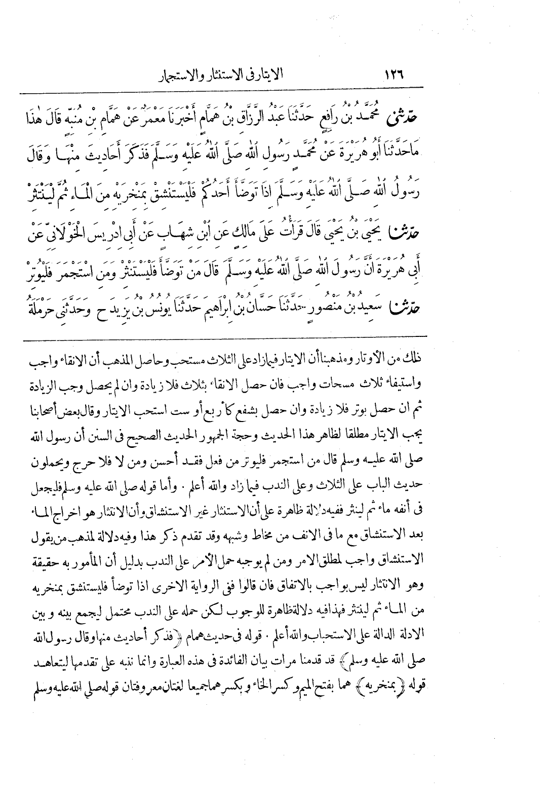ذَلِكَ مِنَ الْأَوْتَارِ وَمَذْهَبُنَا أَنَّ الْإِيتَارَ فِيمَا زَادَ عَلَى الثَّلَاثِ مُسْتَحَبٌّ وَحَاصِلُ الْمَذْهَبِ أَنَّ الْإِنْقَاءَ وَاجِبٌ وَاسْتِيفَاءُ ثَلَاثَ مَسَحَاتٍ وَاجِبٌ فَإِنْ حَصَلَ الْإِنْقَاءُ بِثَلَاثٍ فَلَا زِيَادَةَ وَإِنْ لَمْ يَحْصُلْ وَجَبَ الزِّيَادَةُ ثُمَّ إِنْ حَصَلَ بِوِتْرٍ فَلَا زِيَادَةَ وَإِنْ حَصَلَ بِشَفْعٍ كَأَرْبَعٍ أَوْ سِتٍّ اسْتُحِبَّ الْإِيتَارُ وَقَالَ بَعْضُ أَصْحَابِنَا يَجِبُ الْإِيتَارُ مُطْلَقًا لِظَاهِرِ هَذَا الْحَدِيثِ وَحُجَّةُ الْجُمْهُورِ الْحَدِيثُ الصَّحِيحُ فِي السُّنَنِ أَنَّ رَسُولَ اللَّهِ صَلَّى اللَّهُ عَلَيْهِ وَسَلَّمَ قَالَ مَنِ اسْتَجْمَرَ فَلْيُوتِرْ مَنْ فَعَلَ فَقَدْ أَحْسَنَ وَمَنْ لَا فَلَا حَرَجَ وَيَحْمِلُونَ حَدِيثَ الْبَابِ عَلَى الثَّلَاثِ وَعَلَى النَّدْبِ فِيمَا زَادَ وَاللَّهُ أَعْلَمُ وَأَمَّا قَوْلُهُ صَلَّى اللَّهُ عَلَيْهِ وَسَلَّمَ فَلْيَجْعَلْ فِي أَنْفِهِ مَاءً ثُمَّ لْيَنْثُرْ فَفِيهِ دَلَالَةٌ ظَاهِرَةٌ عَلَى أَنَّ الِاسْتِنْثَارَ غَيْرُ الِاسْتِنْشَاقِ وَأَنَّ الِانْتِثَارَ هُوَ إِخْرَاجُ الْمَاءِ بَعْدَ الِاسْتِنْشَاقِ مَعَ مَا فِي الْأَنْفِ مِنْ مُخَاطٍ وَشِبْهِهِ وَقَدْ تَقَدَّمَ ذِكْرُ هَذَا وَفِيهِ دَلَالَةٌ لِمَذْهَبِ مَنْ يَقُولُ الِاسْتِنْشَاقُ وَاجِبٌ لِمُطْلَقِ الْأَمْرِ وَمَنْ لَمْ يُوجِبْهُ حَمَلَ الْأَمْرَ عَلَى النَّدْبِ بِدَلِيلِ أَنَّ الْمَأْمُورَ بِهِ حَقِيقَةً وَهُوَ الِانْتِثَارُ لَيْسَ بِوَاجِبٍ بِالِاتِّفَاقِ فَإِنْ قَالُوا فَفِي الرِّوَايَةِ الْأُخْرَى إِذَا تَوَضَّأَ فليستنشق بمنخريه من الماء ثم لينثر فَهَذَا فِيهِ دَلَالَةٌ ظَاهِرَةٌ لِلْوُجُوبِ وَلَكِنَّ حَمْلَهُ عَلَى النَّدْبِ مُحْتَمَلٌ لِيَجْمَعَ بَيْنَهُ وَبَيْنَ الْأَدِلَّةِ الدالة على الاستحباب والله أعلم قَوْلُهُ فِي حَدِيثِ هَمَّامٍ (فَذَكَرَ أَحَادِيثَ مِنْهَا وَقَالَ رَسُولُ اللَّهِ صَلَّى اللَّهُ عَلَيْهِ وَسَلَّمَ) قَدْ قَدَّمْنَا مَرَّاتٍ بَيَانَ الْفَائِدَةِ فِي هَذِهِ الْعِبَارَةِ وَإِنَّمَا نُنَبِّهُ عَلَى تَقَدُّمِهَا لِيُتَعَاهَدَ قَوْلُهُ (بِمَنْخِرَيْهِ) هُمَا بِفَتْحِ الْمِيمِ وَكَسْرِ الْخَاءِ وَبِكَسْرِهِمَا جَمِيعًا لُغَتَانِ مَعْرُوفَتَانِ قَوْلُهُ صَلَّى اللَّهُ عَلَيْهِ وسلم