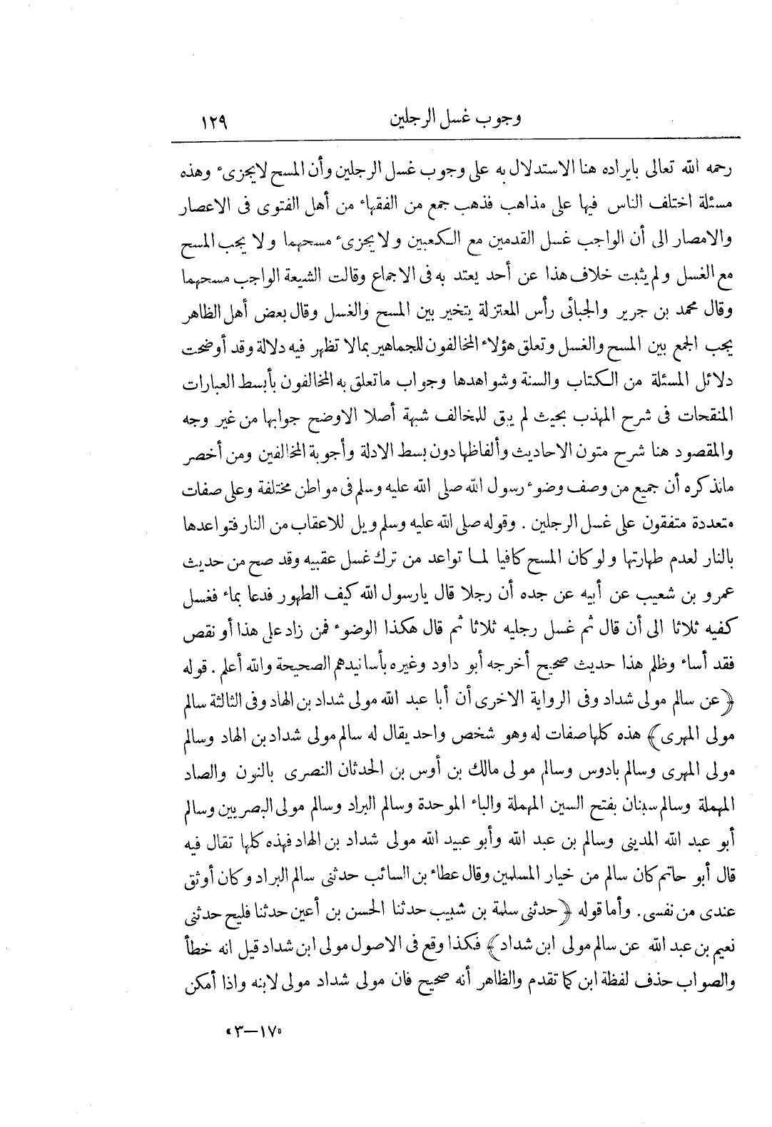رَحِمَهُ اللَّهُ تَعَالَى بِإِيرَادِهِ هُنَا الِاسْتِدْلَالُ بِهِ عَلَى وُجُوبِ غَسْلِ الرِّجْلَيْنِ وَأَنَّ الْمَسْحَ لَا يُجْزِئُ وَهَذِهِ مَسْأَلَةٌ اخْتَلَفَ النَّاسُ فِيهَا عَلَى مَذَاهِبَ فَذَهَبَ جَمْعٌ مِنَ الْفُقَهَاءِ مِنْ أَهْلِ الْفَتْوَى فِي الْأَعْصَارِ وَالْأَمْصَارِ إِلَى أَنَّ الْوَاجِبَ غَسْلُ الْقَدَمَيْنِ مَعَ الْكَعْبَيْنِ وَلَا يُجْزِئُ مَسْحُهُمَا وَلَا يَجِبُ الْمَسْحُ مَعَ الْغَسْلِ وَلَمْ يَثْبُتْ خِلَافُ هَذَا عَنْ أَحَدٍ يُعْتَدُّ بِهِ فِي الْإِجْمَاعِ وَقَالَتِ الشِّيعَةُ الْوَاجِبُ مَسْحُهُمَا وَقَالَ مُحَمَّدُ بْنُ جَرِيرٍ وَالْجُبَّائِيُّ رَأْسُ الْمُعْتَزِلَةِ يَتَخَيَّرُ بَيْنَ الْمَسْحِ وَالْغَسْلِ وَقَالَ بَعْضُ أَهْلِ الظَّاهِرِ يَجِبُ الْجَمْعُ بَيْنَ الْمَسْحِ وَالْغَسْلِ وَتَعَلَّقَ هَؤُلَاءِ الْمُخَالِفُونَ لِلْجَمَاهِيرِ بِمَا لَا تَظْهَرُ فِيهِ دَلَالَةٌ وَقَدْ أَوْضَحْتُ دَلَائِلَ الْمَسْأَلَةِ مِنَ الْكِتَابِ وَالسُّنَّةِ وَشَوَاهِدِهَا وَجَوَابُ مَا تَعَلَّقَ بِهِ الْمُخَالِفُونَ بِأَبْسَطِ الْعِبَارَاتِ الْمُنَقَّحَاتِ فِي شَرْحِ الْمُهَذَّبِ بِحَيْثُ لَمْ يَبْقَ لِلْمُخَالِفِ شُبْهَةٌ أَصْلًا إِلَّا وَضَحَ جَوَابُهَا مِنْ غَيْرِ وَجْهٍ وَالْمَقْصُودُ هُنَا شَرْحُ مُتُونِ الْأَحَادِيثِ وَأَلْفَاظِهَا دُونَ بَسْطِ الْأَدِلَّةِ وَأَجْوِبَةِ الْمُخَالِفِينَ وَمِنْ أَخْصَرِ مَا نَذْكُرُهُ أَنَّ جَمِيعَ مَنْ وَصَفَ وضوء رسول الله صلى الله عليه وسلم فِي مَوَاطِنَ مُخْتَلِفَةٍ وَعَلَى صِفَاتٍ مُتَعَدِّدَةٍ مُتَّفِقُونَ عَلَى غَسْلِ الرِّجْلَيْنِ وَقَوْلُهُ صَلَّى اللَّهُ عَلَيْهِ وَسَلَّمَ وَيْلٌ لِلْأَعْقَابِ مِنَ النَّارِ فَتَوَاعَدَهَا بِالنَّارِ لِعَدَمِ طَهَارَتِهَا وَلَوْ كَانَ الْمَسْحُ كَافِيًا لَمَا تَوَاعَدَ مَنْ تَرَكَ غَسْلَ عَقِبَيْهِ وَقَدْ صَحَّ مِنْ حَدِيثِ عَمْرِو بْنِ شُعَيْبٍ عَنْ أَبِيهِ عن جده أن رجلا قال يارسول اللَّهِ كَيْفَ الطُّهُورُ فَدَعَا بِمَاءٍ فَغَسَلَ كَفَّيْهِ ثَلَاثًا إِلَى أَنْ قَالَ ثُمَّ غَسَلَ رِجْلَيْهِ ثَلَاثًا ثُمَّ قَالَ هَكَذَا الْوُضُوءُ فَمَنْ زَادَ عَلَى هَذَا أَوْ نَقَصَ فَقَدْ أَسَاءَ وَظَلَمَ هَذَا حَدِيثٌ صَحِيحٌ أَخْرَجَهُ أَبُو دَاوُدَ وَغَيْرُهُ بِأَسَانِيدِهِمُ الصَّحِيحَةِ وَاللَّهُ أَعْلَمُ قَوْلُهُ (عَنْ سَالِمٍ مَوْلَى شَدَّادٍ وَفِي الرِّوَايَةِ الْأُخْرَى أَنَّ أَبَا عَبْدِ اللَّهِ مَوْلَى شَدَّادِ بْنِ الْهَادِ وَفِي الثَّالِثَةِ سَالِمٌ مَوْلَى الْمَهْرِيِّ) هَذِهِ كُلُّهَا صِفَاتٌ لَهُ وَهُوَ شَخْصٌ وَاحِدٌ يُقَالُ لَهُ سَالِمٌ مَوْلَى شَدَّادِ بْنِ الْهَادِ وَسَالِمٌ مَوْلَى الْمُهْرِيِّ وَسَالِمٌ بَادُوسُ وَسَالِمٌ مَوْلَى مَالِكِ بْنِ أَوْسِ بْنِ الْحَدَثَانِ النَّصْرِيُّ بِالنُّونِ وَالصَّادِ الْمُهْمَلَةِ وَسَالِمٌ سَبْنَانُ بِفَتْحِ السِّينِ الْمُهْمَلَةِ وَالْبَاءِ الْمُوَحَّدَةِ وَسَالِمٌ الْبَرَّادُ وَسَالِمٌ مَوْلَى الْبَصْرِيِّينَ وَسَالِمٌ أَبُو عَبْدِ اللَّهِ الْمَدِينِيُّ وَسَالِمُ بْنُ عَبْدِ اللَّهِ وَأَبُو عُبَيْدِ اللَّهِ مَوْلَى شَدَّادِ بْنِ الْهَادِ فَهَذِهِ كُلُّهَا تُقَالُ فِيهِ قَالَ أَبُو حَاتِمٍ كَانَ سَالِمٌ مِنْ خِيَارِ الْمُسْلِمِينَ وَقَالَ عَطَاءُ بْنُ السَّائِبِ حَدَّثَنِي سَالِمٌ الْبَرَّادُ وَكَانَ أَوْثَقَ عِنْدِي مِنْ نَفْسِي وَأَمَّا قَوْلُهُ (حَدَّثَنِي سَلَمَةُ بْنُ شَبِيبٍ حَدَّثَنَا الْحَسَنُ بْنُ أَعْيَنَ حَدَّثَنَا فُلَيْحٌ حَدَّثَنِي نُعَيْمُ بْنُ عَبْدِ اللَّهِ عَنْ سَالِمٍ مولى بن شداد) فكذا وقع في الاصول مولى بن شَدَّادٍ قِيلَ إِنَّهُ خَطَأٌ وَالصَّوَابُ حَذْفُ لَفْظَةِ بن كَمَا تَقَد