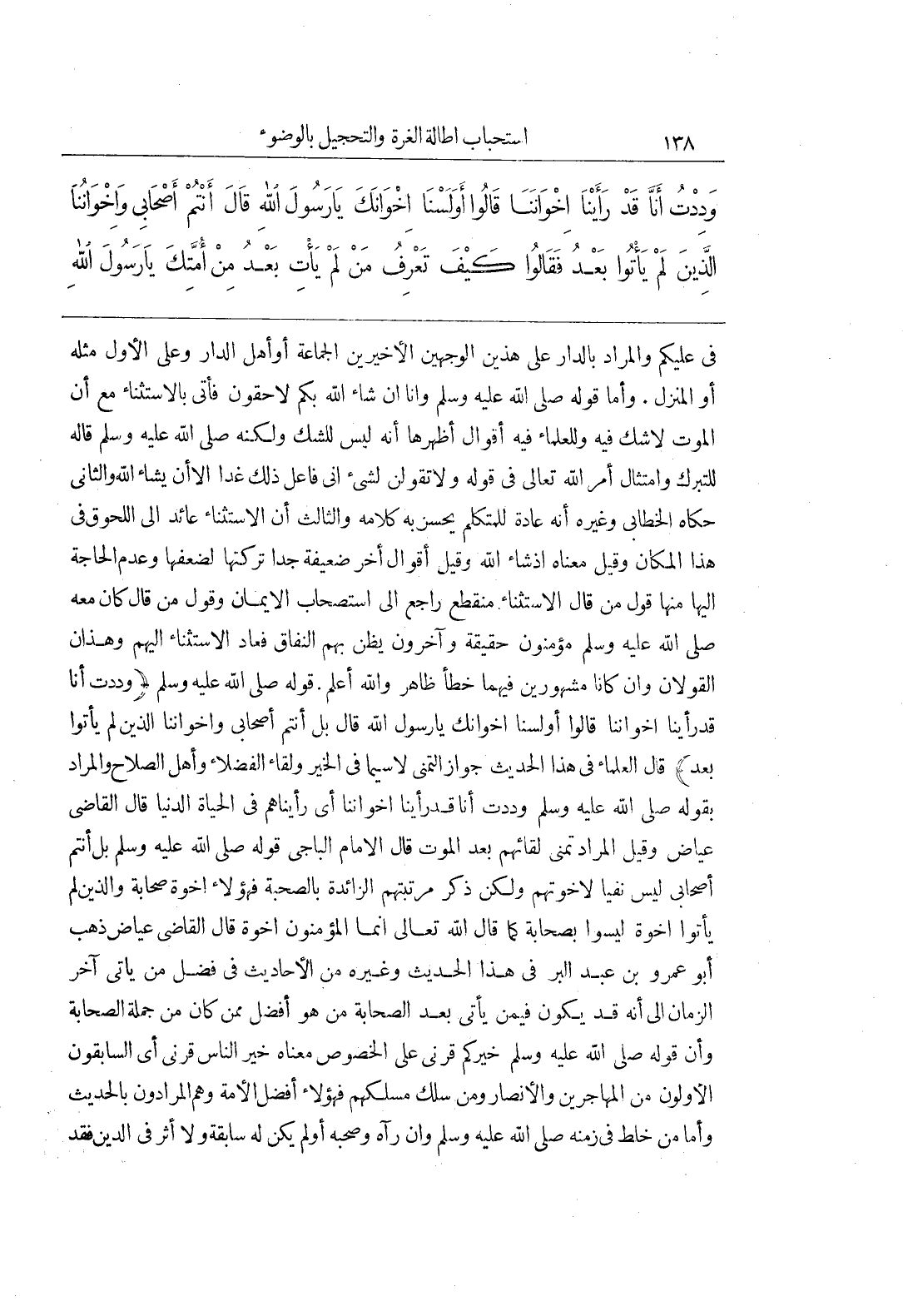 فِي عَلَيْكُمْ وَالْمُرَادُ بِالدَّارِ عَلَى هَذَيْنِ الْوَجْهَيْنِ الْأَخِيرَيْنِ الْجَمَاعَةُ أَوْ أَهْلُ الدَّارِ وَعَلَى الْأَوَّلِ مِثْلُهُ أَوِ الْمَنْزِلُ وَأَمَّا قَوْلُهُ صَلَّى اللَّهُ عَلَيْهِ وَسَلَّمَ وَإِنَّا إِنْ شَاءَ اللَّهُ بِكُمْ لَاحِقُونَ فَأَتَى بِالِاسْتِثْنَاءِ مَعَ أَنَّ الْمَوْتَ لَا شَكَّ فِيهِ وَلِلْعُلَمَاءِ فِيهِ أَقْوَالٌ أَظْهَرُهَا أَنَّهُ لَيْسَ لِلشَّكِّ وَلَكِنَّهُ صَلَّى اللَّهُ عَلَيْهِ وَسَلَّمَ قَالَهُ لِلتَّبَرُّكِ وَامْتِثَالِ أَمْرِ اللَّهِ تَعَالَى فِي قوله ولا تقولن لشئ إِنِّي فَاعِلٌ ذَلِكَ غَدًا إِلَّا أَنْ يَشَاءَ الله وَالثَّانِي حَكَاهُ الْخَطَّابِيُّ وَغَيْرُهُ أَنَّهُ عَادَةٌ لِلْمُتَكَلِّمِ يُحَسِّنُ بِهِ كَلَامَهُ وَالثَّالِثُ أَنَّ الِاسْتِثْنَاءَ عَائِدٌ إِلَى اللُّحُوقِ فِي هَذَا الْمَكَانِ وَقِيلَ مَعْنَاهُ اذ شَاءَ اللَّهُ وَقِيلَ أَقْوَالٌ أُخَرُ ضَعِيفَةٌ جِدًّا تَرَكْتُهَا لِضَعْفِهَا وَعَدَمِ الْحَاجَةِ إِلَيْهَا مِنْهَا قَوْلُ مَنْ قَالَ الِاسْتِثْنَاءُ مُنْقَطِعٌ رَاجِعٌ إِلَى اسْتِصْحَابِ الْإِيمَانِ وَقَوْلُ مَنْ قَالَ كَانَ مَعَهُ صَلَّى اللَّهُ عَلَيْهِ وَسَلَّمَ مُؤْمِنُونَ حَقِيقَةً وَآخَرُونَ يُظَنُّ بِهِمُ النِّفَاقَ فَعَادَ الِاسْتِثْنَاءُ إِلَيْهِمْ وَهَذَانِ الْقَوْلَانِ وَإِنْ كَانَا مَشْهُورَيْنِ فِيهِمَا خَطَأٌ ظَاهِرٌ وَاللَّهُ أَعْلَمُ قَوْلُهُ صَلَّى اللَّهُ عَلَيْهِ وَسَلَّمَ (وَدِدْتُ أنا قد رأينا اخواننا قالوا أو لسنا إِخْوَانَكَ يَا رَسُولَ اللَّهِ قَالَ بَلْ أَنْتُمْ أَصْحَابِي وَإِخْوَانُنَا الَّذِينَ لَمْ يَأْتُوا بَعْدُ) قَالَ الْعُلَمَاءُ فِي هَذَا الْحَدِيثِ جَوَازُ التَّمَنِّي لَا سِيَّمَا فِي الْخَيْرِ وَلِقَاءِ الْفُضَلَاءِ وَأَهْلِ الصَّلَاحِ وَالْمُرَادُ بِقَوْلِهِ صَلَّى اللَّهُ عَلَيْهِ وَسَلَّمَ وَدِدْتُ أَنَّا قَدْ رَأَيْنَا إِخْوَانَنَا أَيْ رَأَيْنَاهُمْ فِي الْحَيَاةِ الدُّنْيَا قَالَ الْقَاضِي عِيَاضٌ وَقِيلَ الْمُرَادُ تَمَّنِي لِقَائِهِمْ بَعْدَ الْمَوْتِ قَالَ الْإِمَامُ الْبَاجِيُّ قَوْلُهُ صَلَّى اللَّهُ عَلَيْهِ وَسَلَّمَ بَلْ أَنْتُمْ أَصْحَابِي لَيْسَ نَفْيًا لِأُخُوَتِّهِمْ وَلَكِنْ ذَكَرَ مَرْتَبَتَهُمُ الزَّائِدَةَ بِالصُّحْبَةِ فَهَؤُلَاءِ إِخْوَةٌ صَحَابَةٌ وَالَّذِينَ لَمْ يَأْتُوا إِخْوَةً لَيْسُوا بِصَحَابَةٍ كَمَا قَالَ اللَّهُ تعالى انما المؤمنون اخوة قال القاضي عياض ذهب أبو عمرو بْنُ عَبْدِ الْبَرِّ فِي هَذَا الْحَدِيثِ وَغَيْرِهِ مِنَ الْأَحَادِيثِ فِي فَضْلِ مَنْ يَأْتِي آخِرَ الزَّمَانِ إِلَى أَنَّهُ قَدْ يَكُونُ فِيمَنْ يَأْتِي بَعْدَ الصَّحَابَةِ مَنْ هُوَ أَفْضَلُ مِمَّنْ كَانَ مِنْ جُمْلَةِ الصَّحَابَةِ وَأَنَّ قَوْلَهُ صَلَّى اللَّهُ عَلَيْهِ وَسَلَّمَ خَيْرُكُمْ قَرْنِي عَلَى الْخُصُوصِ مَعْنَاهُ خَيْرُ النَّاسِ قَرْنِي أَيْ السَّابِقُونَ الْأَوَّلُونَ مِنَ الْمُهَاجِرِينَ وَالْأَنْصَارِ وَمَنْ سَلَكَ مَسْلَكَهُمْ فَهَؤُلَاءِ أَفْضَلُ الْأُمَّةِ وَهُمُ الْمُرَادُونَ بِالْحَدِيثِ وَأَمَّا مَنْ خَلَّطَ فِي زَمَنِهِ صَلَّى اللَّهُ عَلَيْهِ وَسَلَّمَ وَإِنْ رَآهُ وَصَحِبَهُ أَوْ لَمْ يَكُنْ لَهُ سَابِقَةٌ وَلَا أَثَرٌ فِي الدِّينِ فَقَدْ