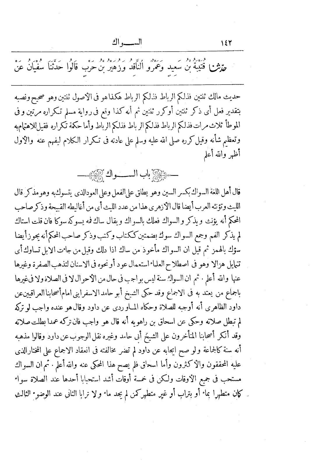 قَالَ أَهْلُ اللُّغَةِ السِّوَاكُ بِكَسْرِ السِّينِ وَهُوَ يُطْلَقُ عَلَى الْفِعْلِ وَعَلَى الْعُودِ الَّذِي يُتَسَوَّكُ بِهِ وَهُوَ مُذَكَّرٌ قَالَ اللَّيْثُ وَتُؤَنِّثُهُ الْعَرَبُ أَيْضًا قَالَ الْأَزْهَرِيُّ هَذَا مِنْ عَدَدِ اللَّيْثِ أَيْ مِنْ أَغَالِيطِهِ الْقَبِيحَةِ وَذَكَرَ صاحب المحكم أنه يؤنث ويذكر والسواك فِعْلُكُ بِالسِّوَاكِ وَيُقَالُ سَاكَ فَمَهَ يَسُوكُهُ سَوْكًا فَإِنْ قُلْتَ اسْتَاكَ لَمْ يُذْكَرِ الْفَمُ وَجَمْعُ السِّوَاكِ سُوُكٌ بِضَمَّتَيْنِ كَكِتَابٍ وَكُتُبٍ وَذَكَرَ صَاحِبُ الْمُحْكَمِ أَنَّهُ يَجُوزُ أَيْضًا سُؤُكٌ بِالْهَمْزِ ثُمَّ قِيلَ إِنَّ السِّوَاكَ مَأْخُوذٌ مِنْ سَاكَ إِذَا دَلَكَ وَقِيلَ مِنْ جَاءَتِ الْإِبِلُ تَسَاوَكُ أَيْ تَتَمَايَلُ هُزَالًا وَهُوَ فِي اصْطِلَاحِ الْعُلَمَاءِ اسْتِعْمَالُ عُودٍ أَوْ نَحْوِهِ فِي الْأَسْنَانِ لِتَذْهَبَ الصُّفْرَةُ وَغَيْرُهَا عَنْهَا وَاللَّهُ أَعْلَمُ ثُمَّ إِنَّ السِّوَاكَ سُنَّةٌ لَيْسَ بِوَاجِبٍ فِي حَالٍ مِنَ الْأَحْوَالِ لَا فِي الصَّلَاةِ وَلَا فِي غَيْرِهَا بِإِجْمَاعِ مَنْ يُعْتَدُّ بِهِ فِي الْإِجْمَاعِ وَقَدْ حَكَى الشَّيْخُ أَبُو حَامِدٍ الْإِسْفَرَايِنِيُّ إِمَامُ أَصْحَابِنَا الْعِرَاقِيِّينَ عَنْ دَاوُدَ الظَّاهِرِيِّ أَنَّهُ أَوْجَبَهُ لِلصَّلَاةِ وَحَكَاهُ الْمَاوَرْدِيُّ عَنْ دَاوُدَ وَقَالَ هُوَ عِنْدَهُ وَاجِبٌ لَوْ تَرَكَهُ لَمْ تَبْطُلْ صَلَاتُهُ وَحُكِيَ عَنْ إِسْحَاقَ بْنِ رَاهَوَيْهِ أَنَّهُ قَالَ هُوَ وَاجِبٌ فَإِنْ تَرَكَهُ عَمْدًا بَطَلَتْ صَلَاتُهُ وَقَدْ أَنْكَرَ أَصْحَابُنَا الْمُتَأَخِّرُونَ عَلَى الشَّيْخِ أَبِي حَامِدٍ وَغَيْرِهِ نَقْلَ الْوُجُوبِ عَنْ دَاوُدَ وَقَالُوا مَذْهَبُهُ أَنَّهُ سُنَّةٌ كَالْجَمَاعَةِ وَلَوْ صَحَّ إِيجَابُهُ عَنْ دَاوُدَ لَمْ تَضُرَّ مُخَالَفَتُهُ فِي انْعِقَادِ الْإِجْمَاعِ عَلَى الْمُخْتَارِ الَّذِي عَلَيْهِ الْمُحَقِّقُونَ وَالْأَكْثَرُونَ وَأَمَّا إِسْحَاقُ فَلَمْ يَصِحَّ هَذَا الْمَحْكِيُّ عَنْهُ وَاللَّهُ أَعْلَمُ ثُمَّ إِنَّ السِّوَاكَ مُسْتَحَبٌّ فِي جَمِيعِ الْأَوْقَاتِ وَلَكِنْ فِي خَمْسَةِ أَوْقَاتٍ أَشَدُّ اسْتِحْبَابًا أَحَدُهَا عِنْدَ الصَّلَاةِ سَوَاءٌ كَانَ مُتَطَهِّرًا بِمَاءٍ أَوْ بِتُرَابٍ أَوْ غَيْرَ مُتَطَهِّرٍ كَمَنْ لَمْ يَجِدْ مَاءً وَلَا تُرَابًا الثَّانِي عِنْدَ الْوُضُوءِ الثَّالِثُ